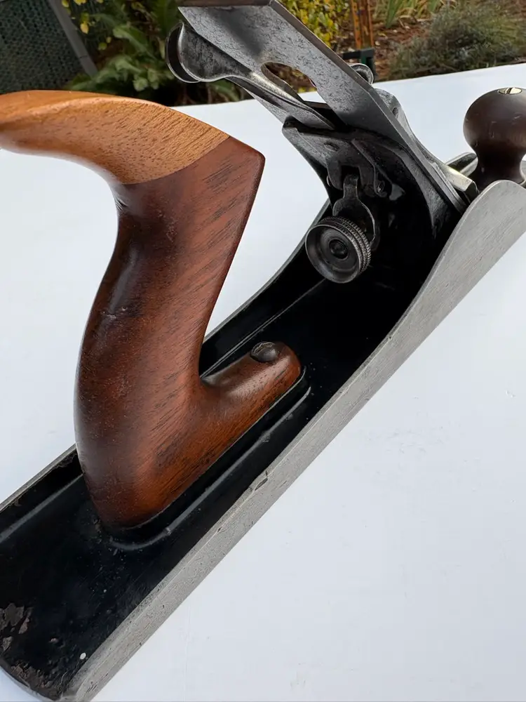 See the pictures. Japanning is excellent for plane this age. Knob and tote are mahogany and that's what I used for the horn repair.