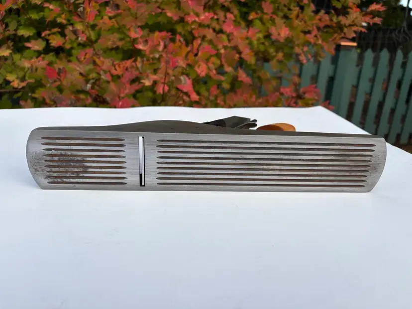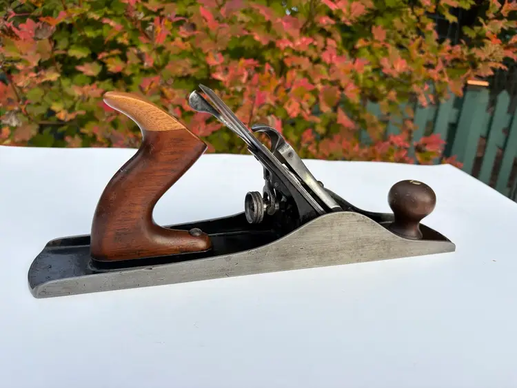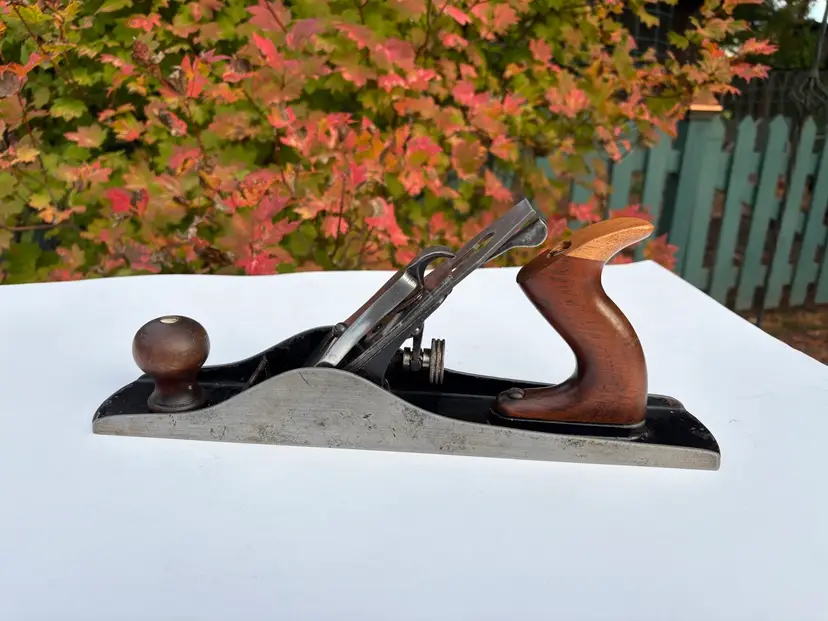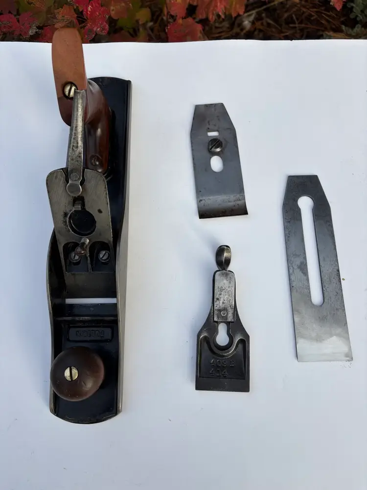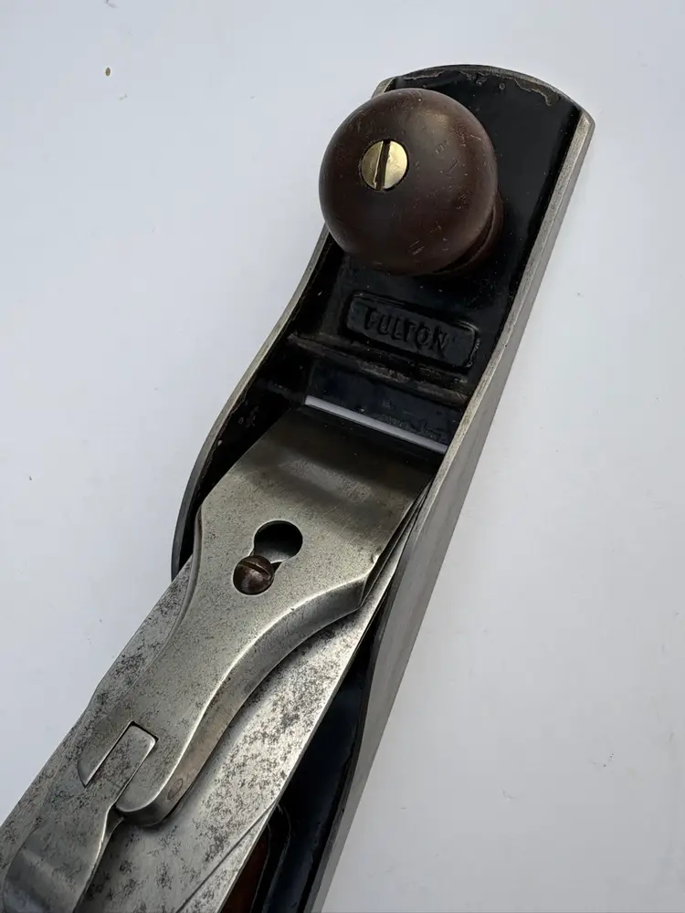 Sears Fulton jack plane same size as a Stanley No 5 jack. Corrugated sole. Clean, sharp and flattened. Has Fulton cast in a raised square behind the knob, the frog is type 4B, 409/414 on the lever cap. A ringer for a Sargent 414C from around 1910-1918, the Fulton brand ones might gone a few years later, but it's safe to say this plane is 100 years old. It appears to be all original except for the repair on the horn. Fulton was the Sears premium plane brand before the Craftsman branding started in the late 1920's.