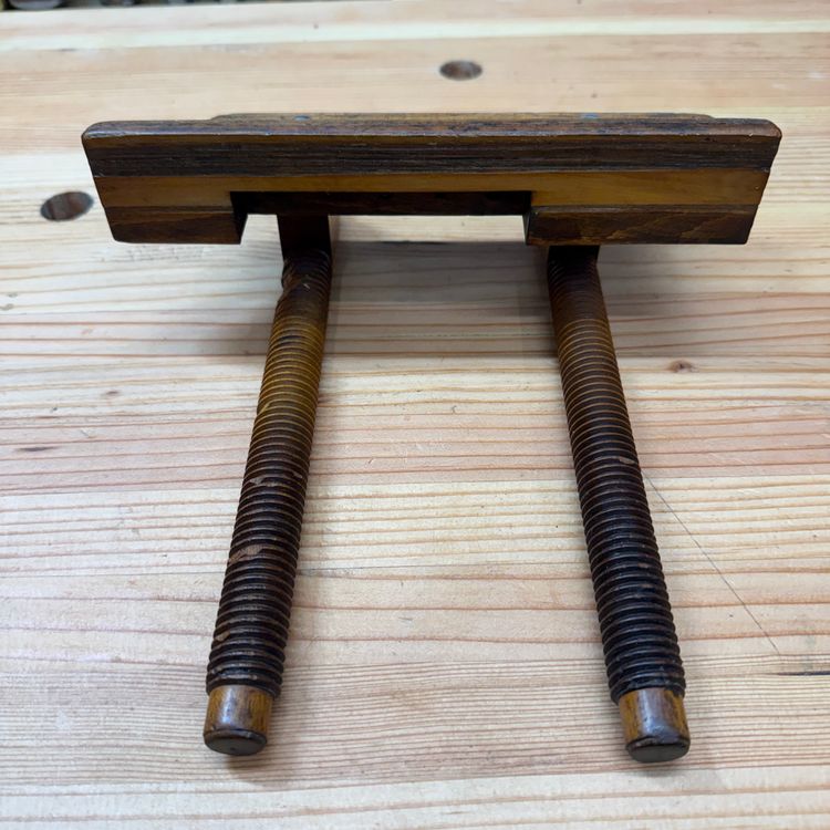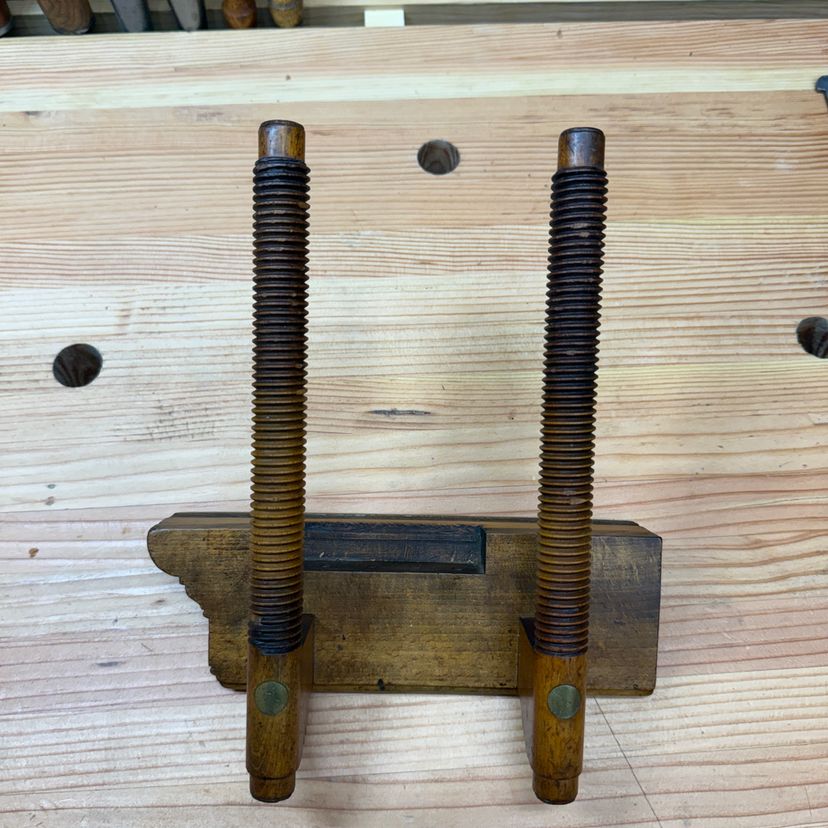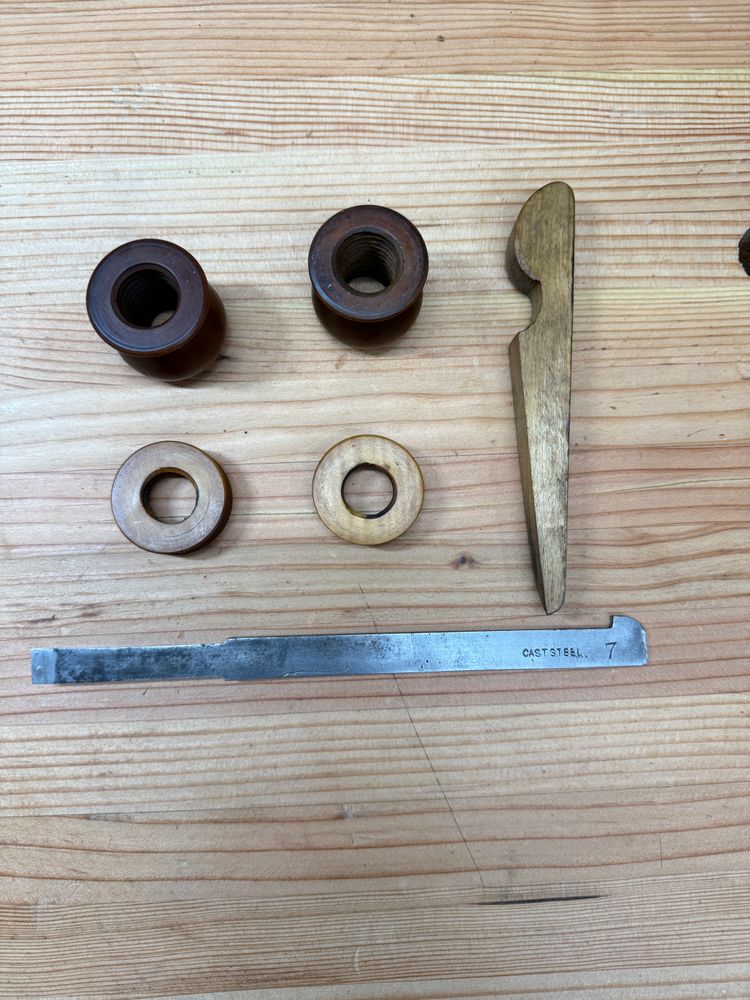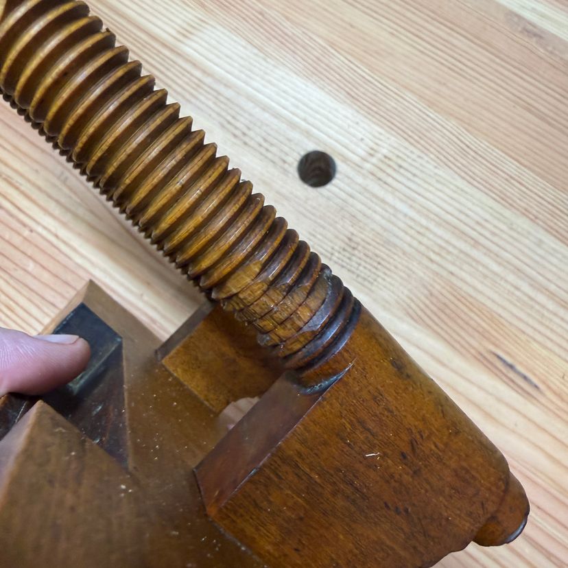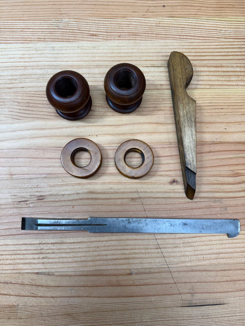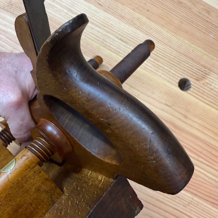 Boxwood knobs and washers, beech body and arms. Sharpened, unmarked, cast steel, #7 iron. Boxed fence. There's what is probably a hardware store logo inked on the right side, but it's illegible.