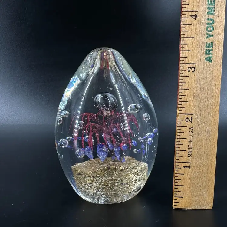 Glass paperweight featuring interesting designs with gold flake detailing. Not signed or marked. Paperweight measures approximately 3.5” tall.