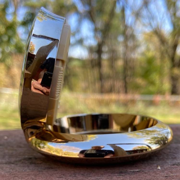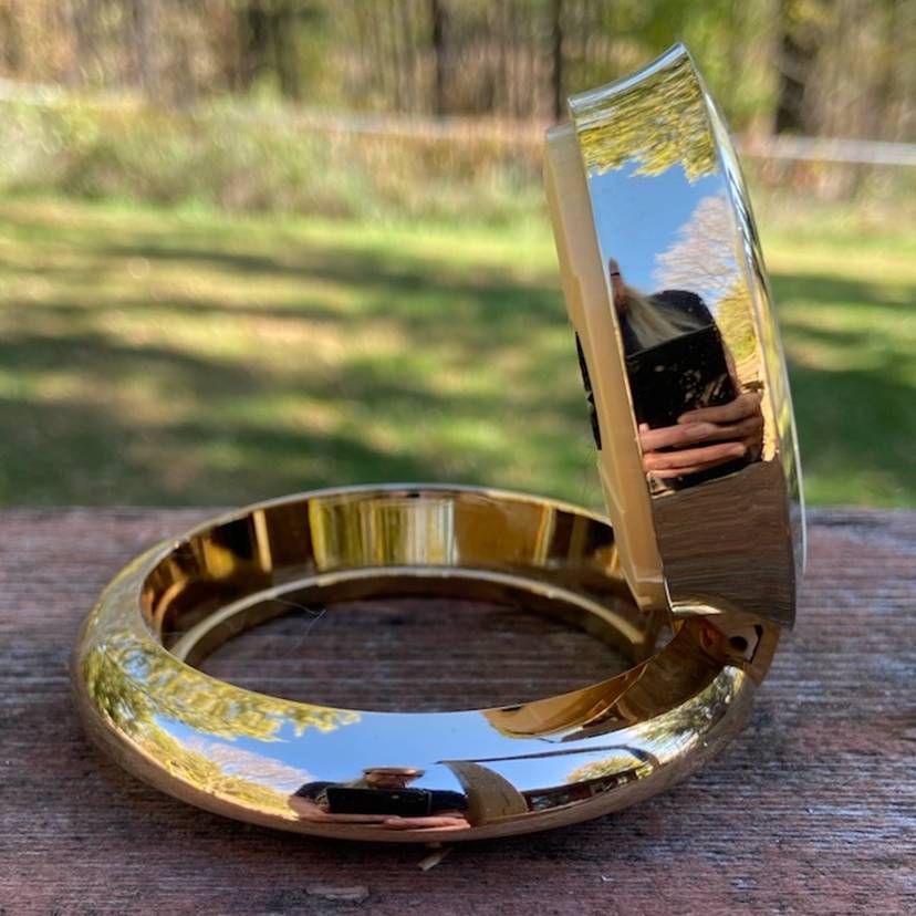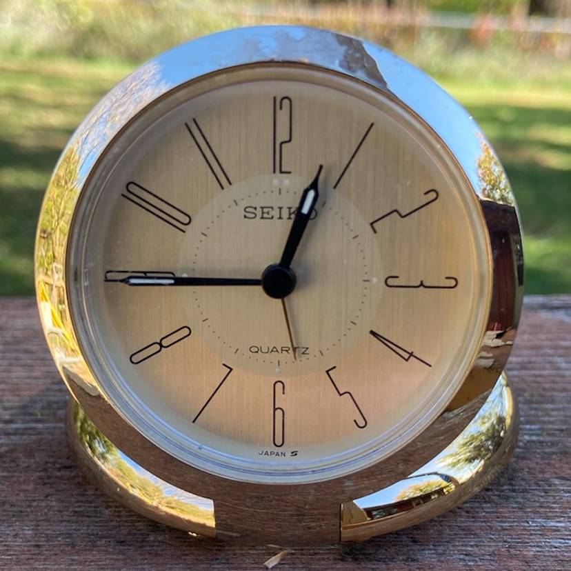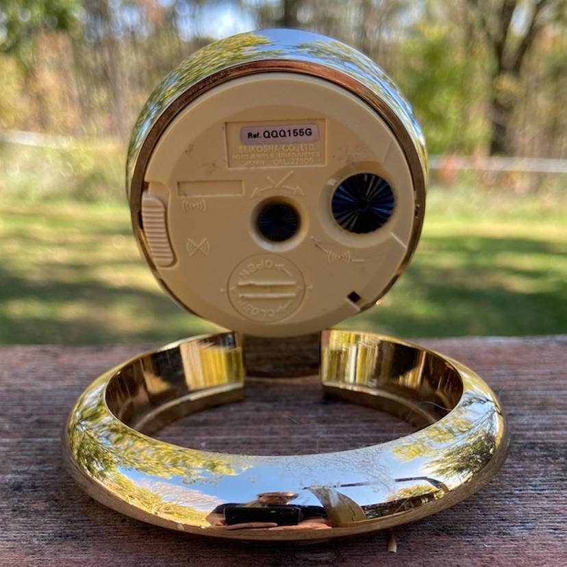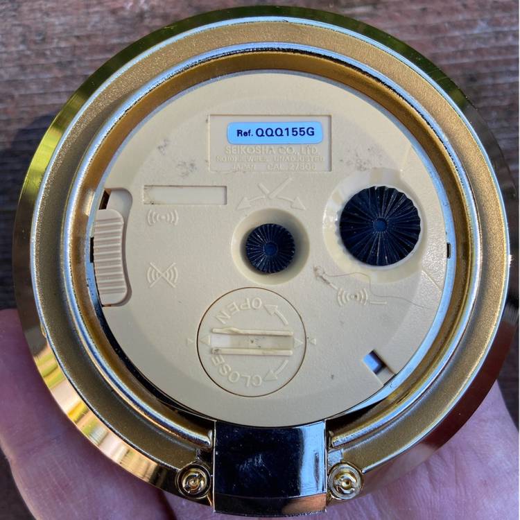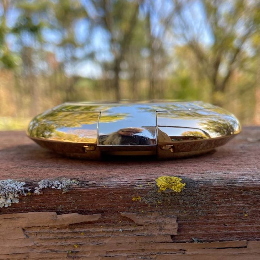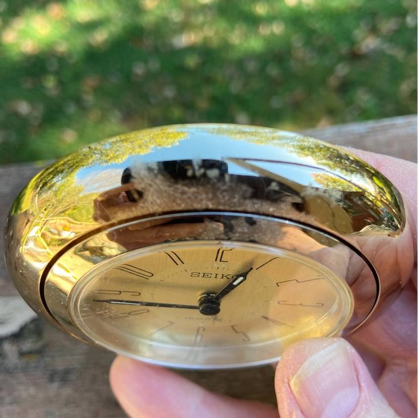 When closed, approx. 3”w x .75”h. When open, approx. 2.75”. UV reactive spots on hands at 12, 3, 6 & 9 o’clock hours. Pre-owned condition. Very little scuffing or scratching. Sticker residue on metal - see last image. See all images as part of description.