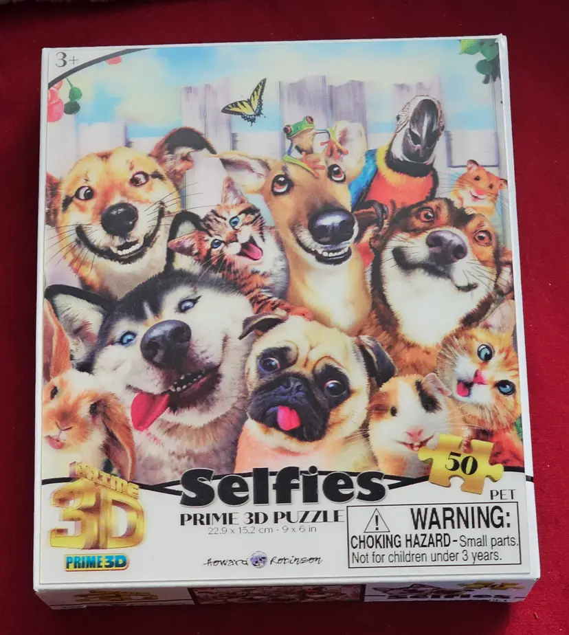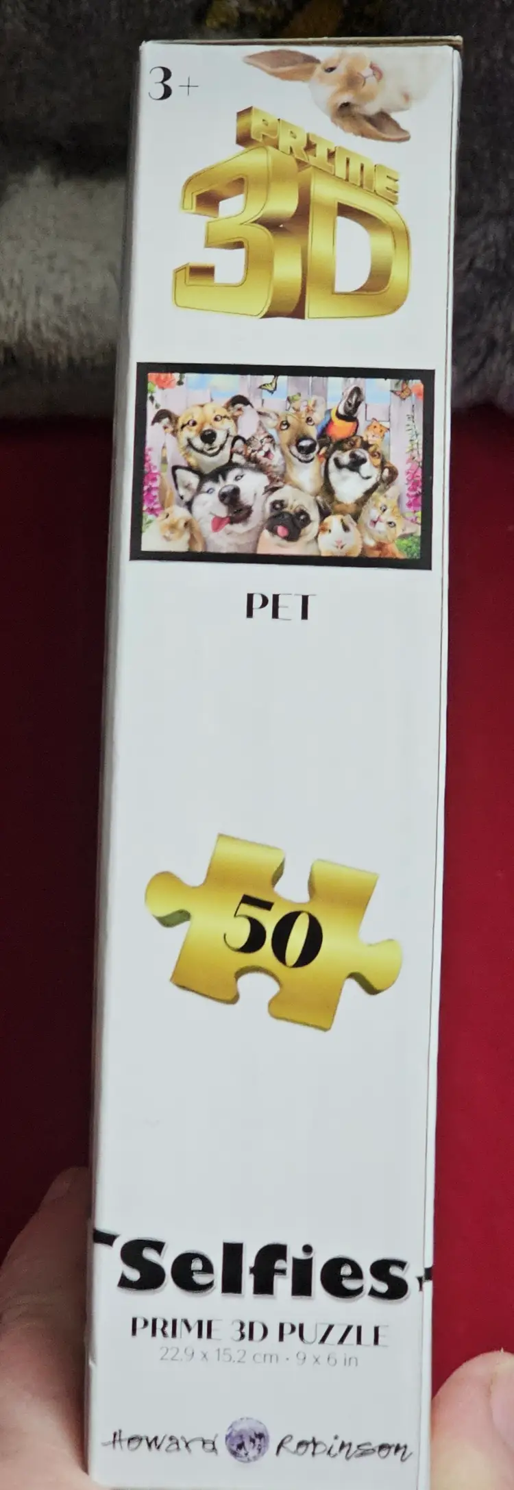 The Selfies Prime 3D Puzzle PETS with 50 pieces by Howard Robinson features vibrant colors and a colorful design perfect for kids ages 3 and up. This cardboard puzzle showcases a theme of animals, specifically pets, making it an engaging and fun activity for young children. Made by the Prime 3D brand in China, this puzzle is sure to provide hours of entertainment and challenge young minds to piece together their favorite furry friends.