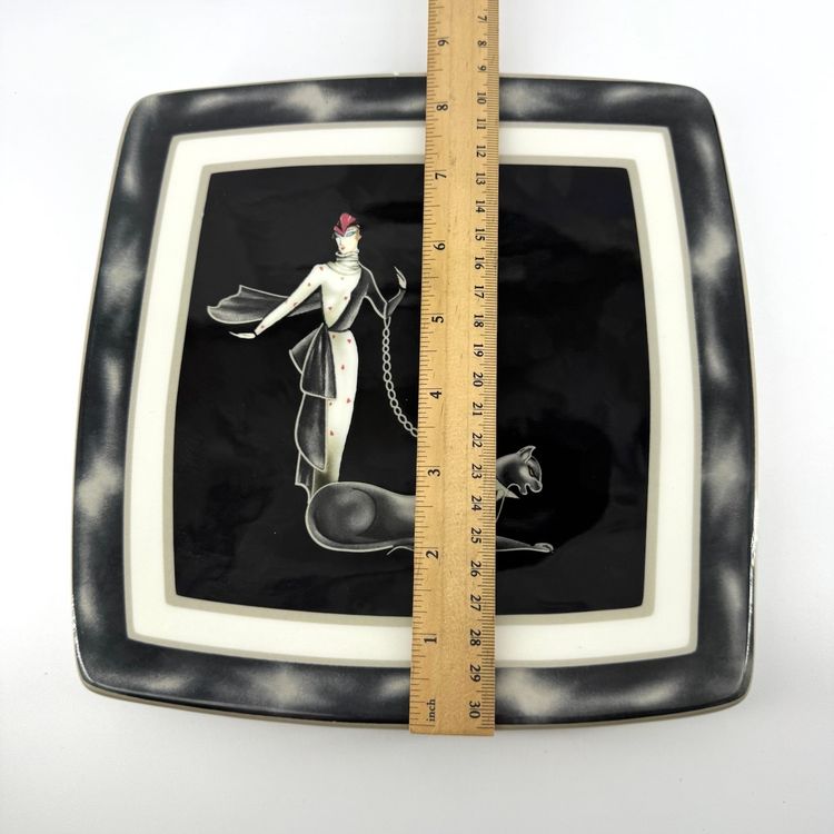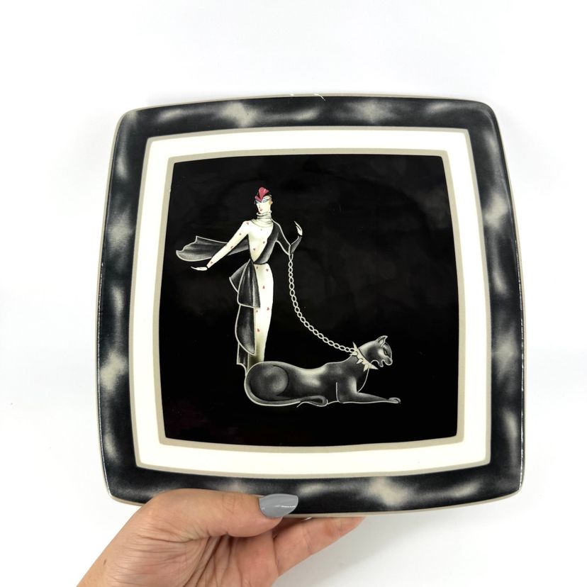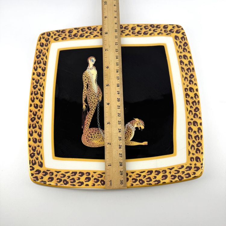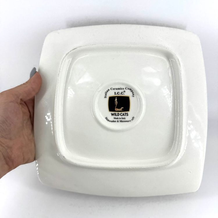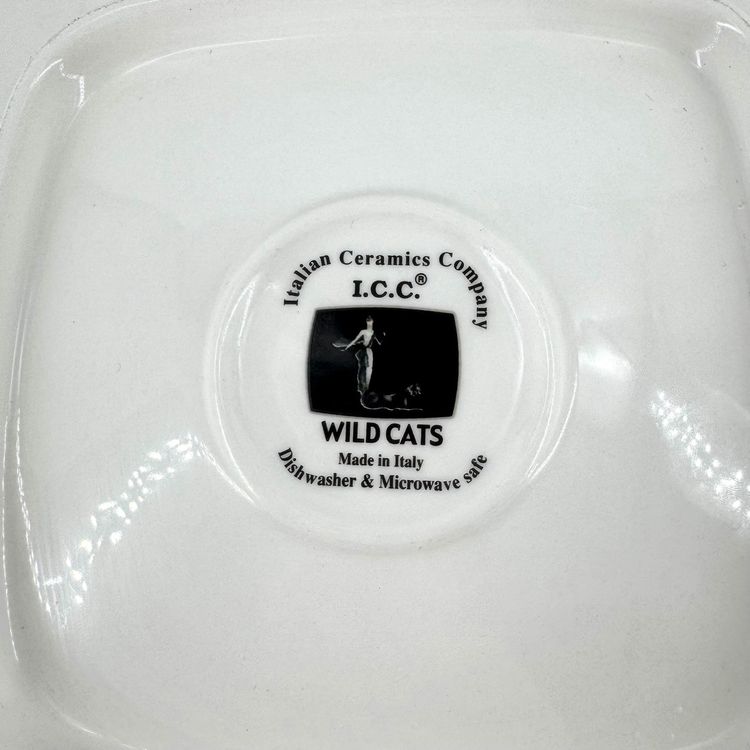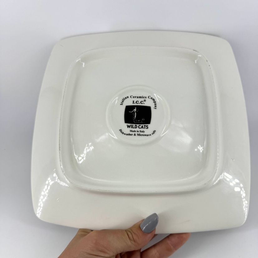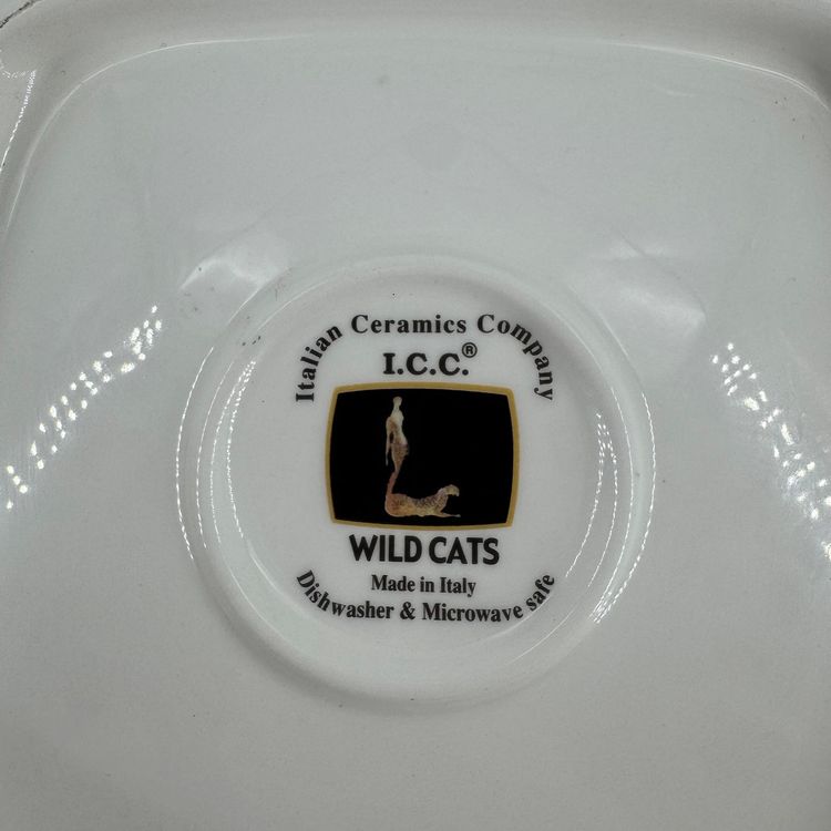 This set of two square Italian Ceramics Company “Wild Cats” plates are approximately 8.5” in length. The Panther plate has little chips in the glaze on the front. Other than that, there are no other chips or cracks. They are both marked on the bottom with a printed I.C.C logo. Dishwasher & Microwave safe.