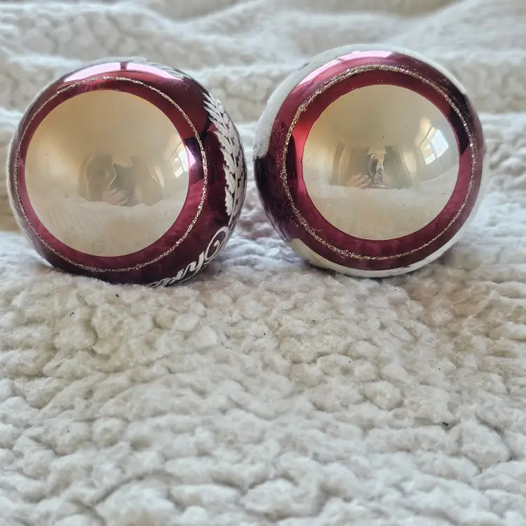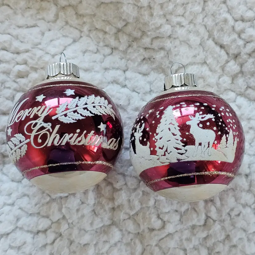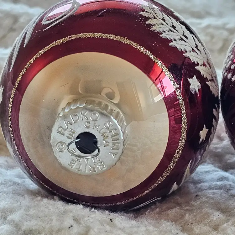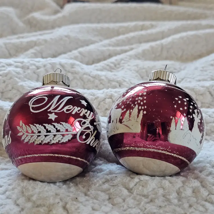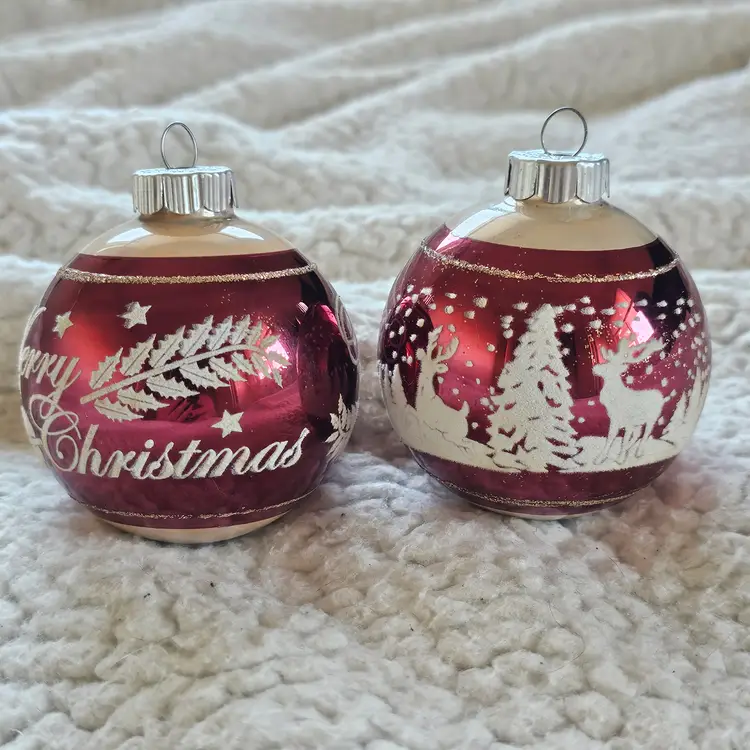 The product is a SET of 2 Christopher Radko 3" Shiny Brite Stenciled Flocked Ornament in Merry Christmas Red and Silver colors. These small round glass ornaments are hand blown and feature a solid color pattern with retro-style design, perfect for adding a festive touch to your Christmas decor. Made in China, these collectible ornaments are sure to bring a touch of holiday cheer to any home.