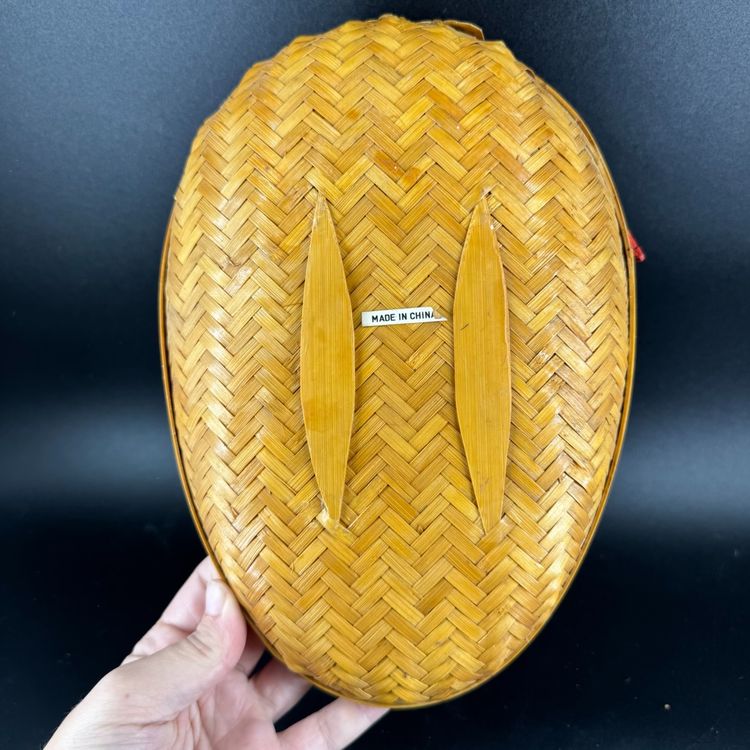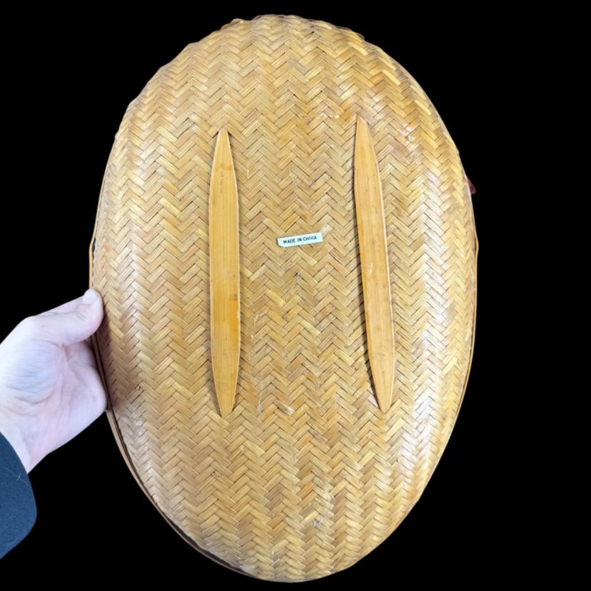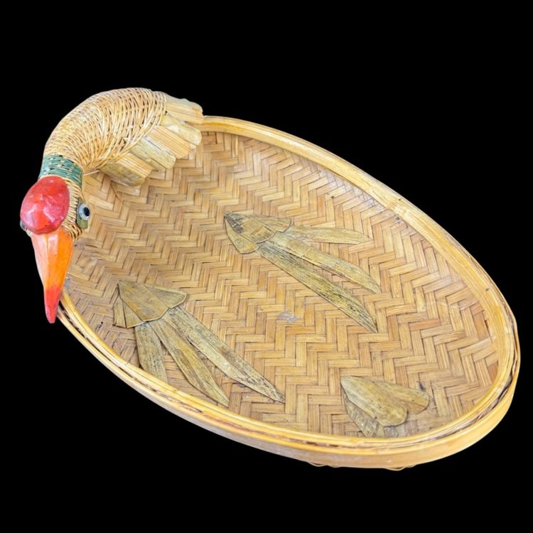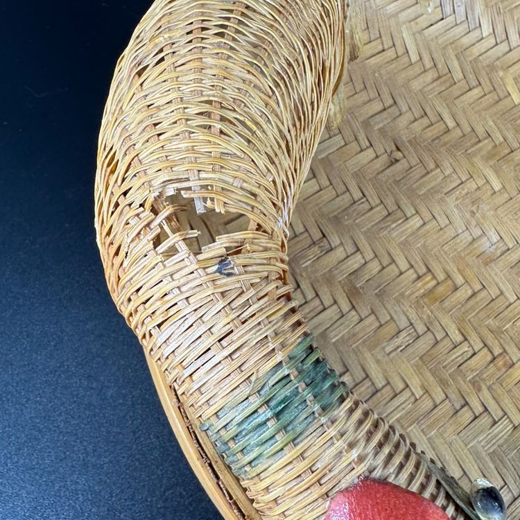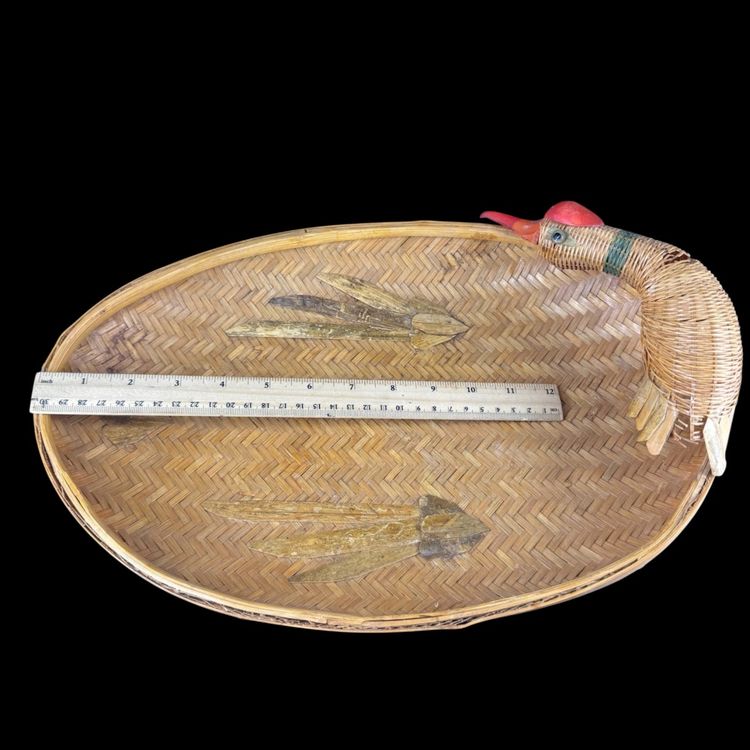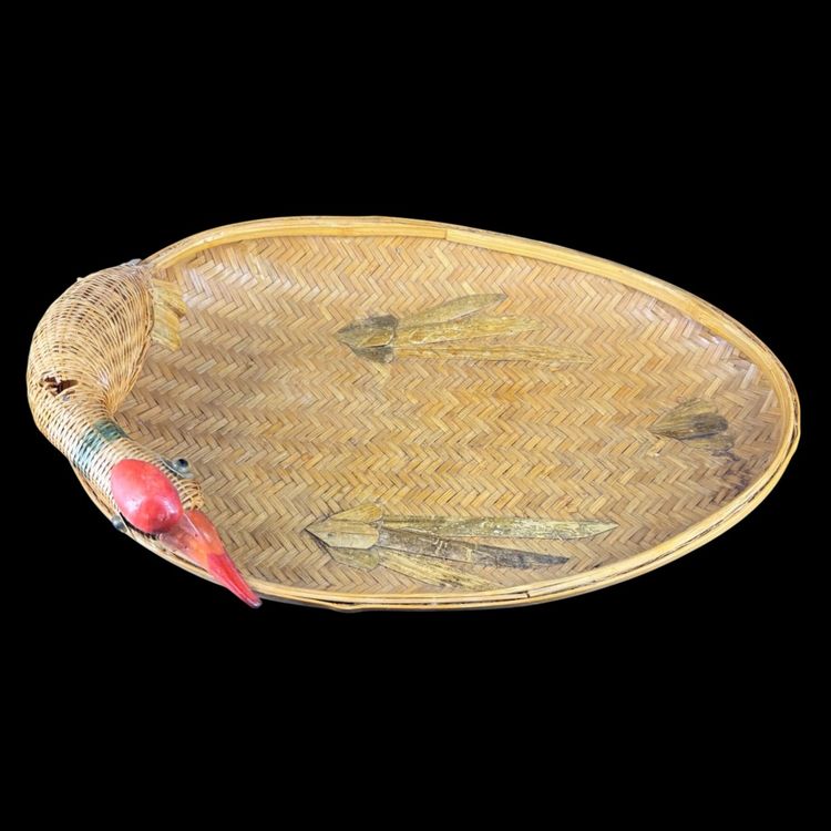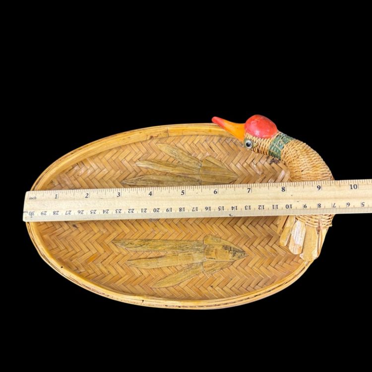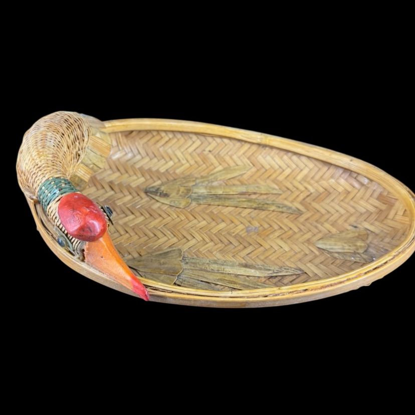 This Set 2 Rattan Duck Baskets the large one is approximately 15” in length, the smaller one is approximately 9.5” in length. The larger one does have damaged to the duck missing tail feathers and has a hole on the body all of the damage can be seen in the photos. There is no damage to the small one. They are marked “Made in China”.