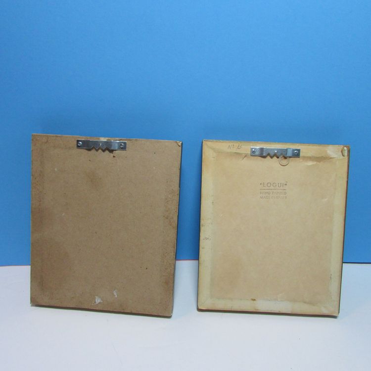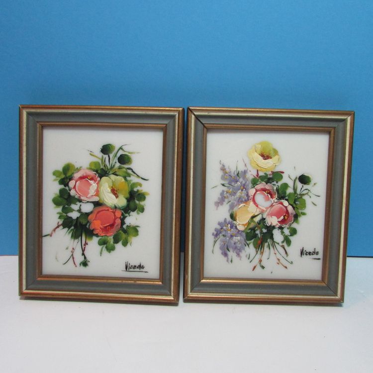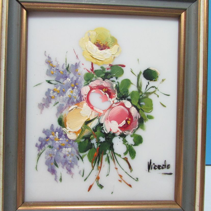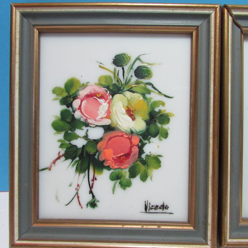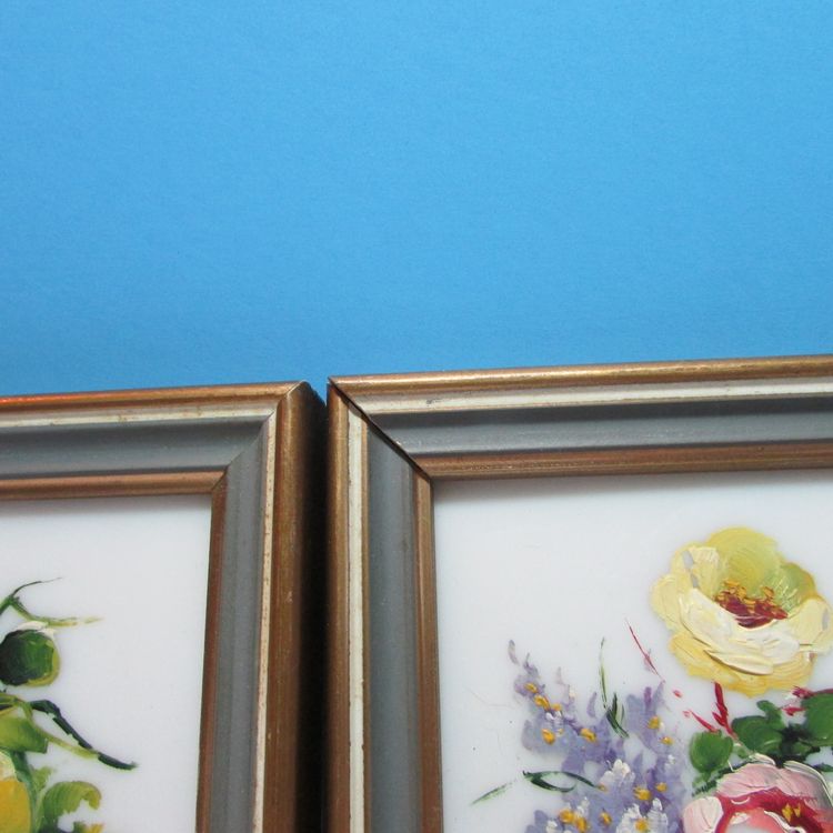 These lovely pieces have some wear, the one frame is loose and has some paint missing (the painting is on the glass). Each frame is about 5 3/4" x 5". This is shipped from a smoke free home. Thanks for looking!