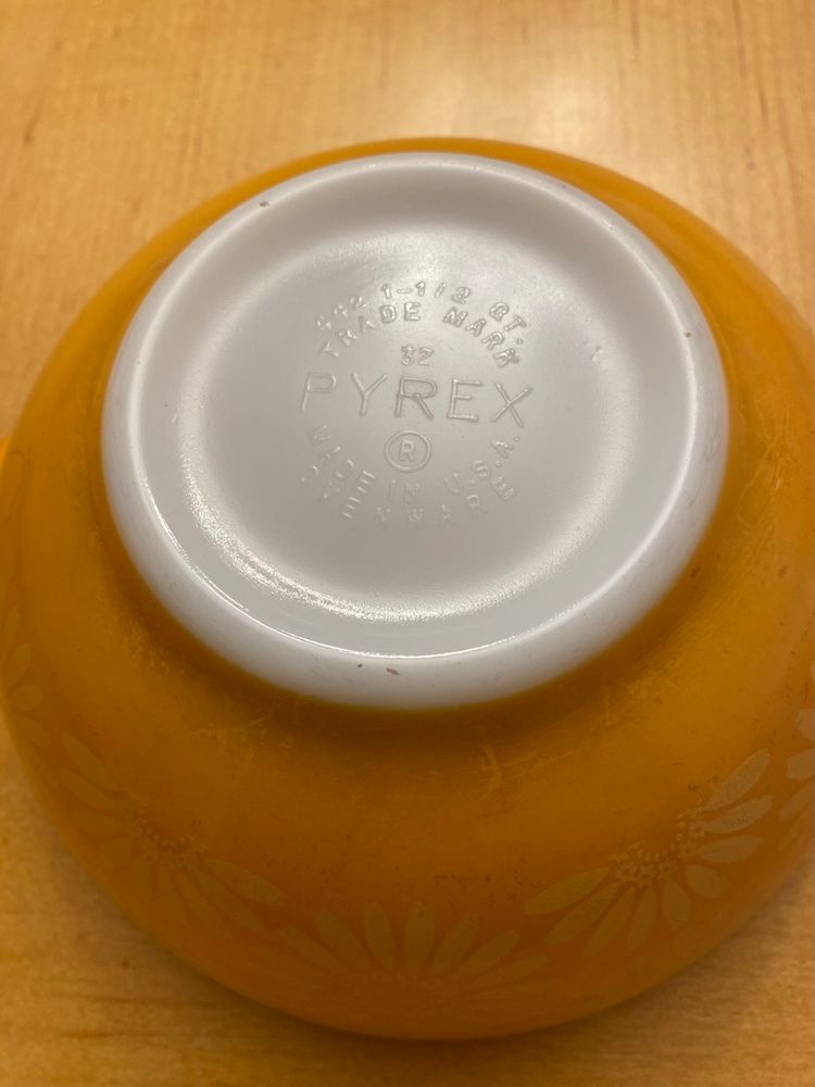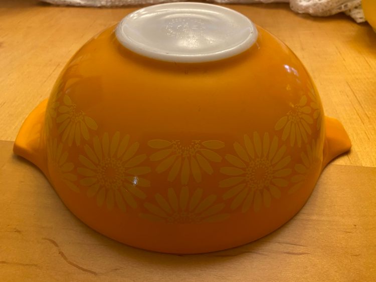 This listing is for 2 nesting PYREX CINDERELLA ORANGE DAISY SUNFLOWER BOWLS. These bowls are numbered 442 and 444. The insides of all the bowls are shiny and look almost new. The outside and bottoms of the bowls are in very good vintage condition.