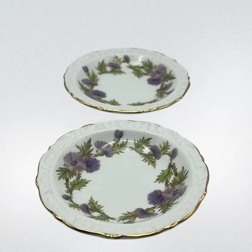 Featuring purple thistle flowers with a scalloped gold rim. Mint condition!