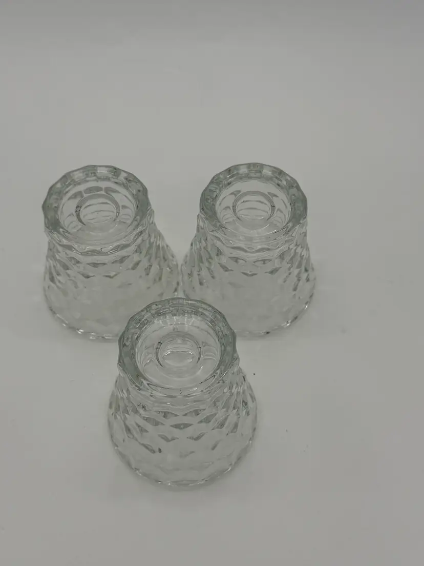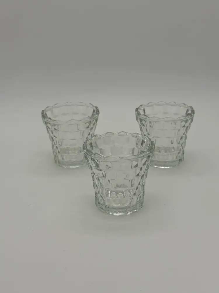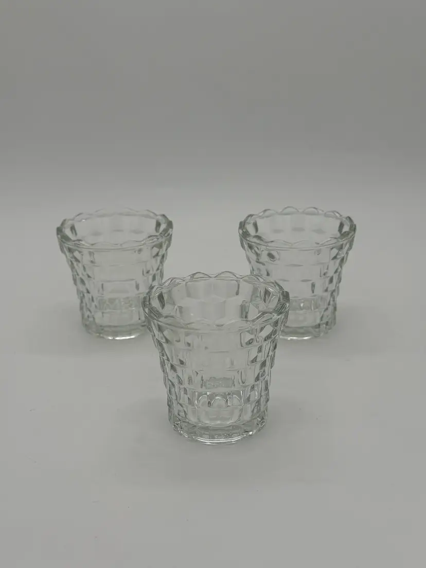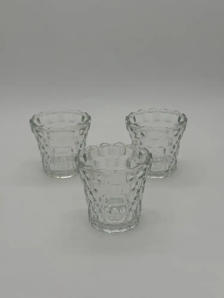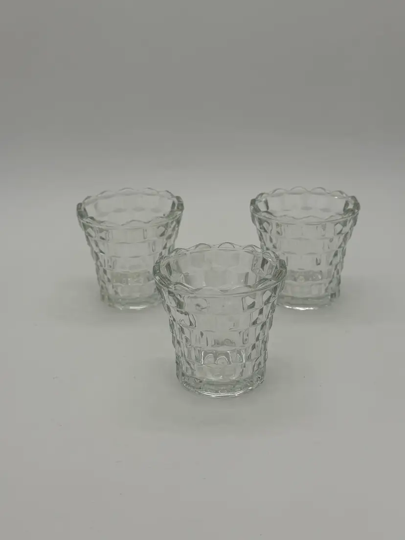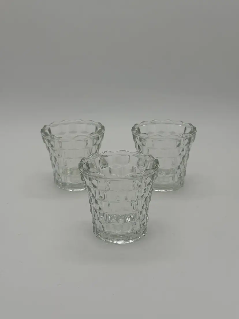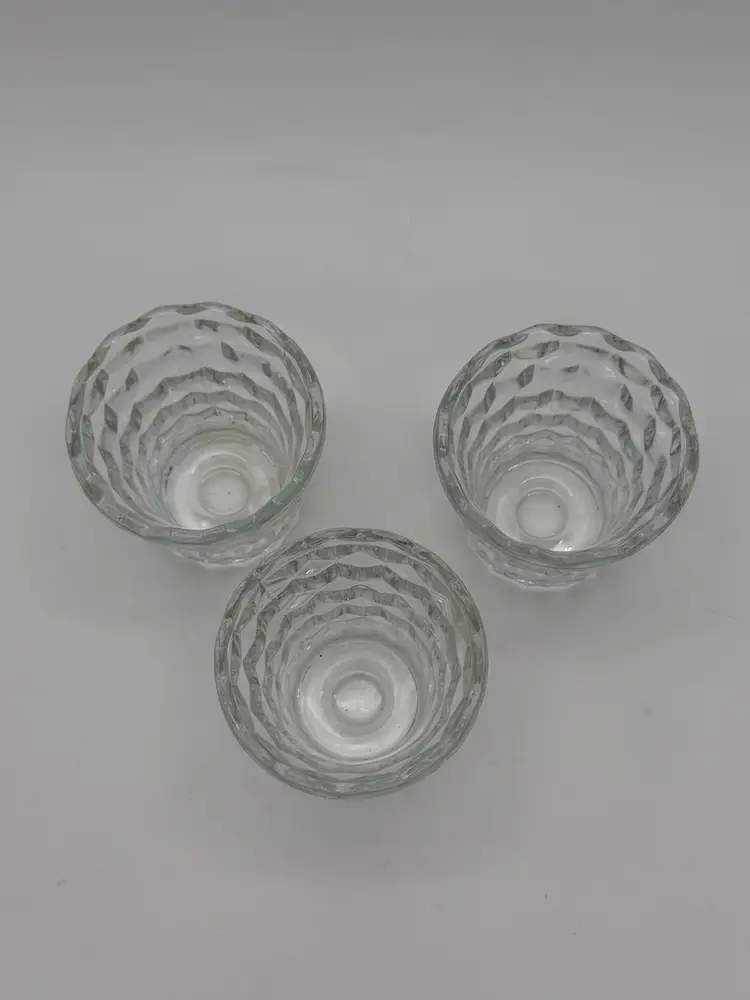 The product is a set of 3 vintage Indiana Glass votive tea light candle holders in clear glass with a cubist design. These small round candle holders are suitable for all occasions and are made of pressed glass with a glossy finish. They feature a 3D effect and are luminous, adding a romantic and decorative touch to any room. The holders are original and come in an unboxed packaging, perfect for adding a retro feel to your home decor. Made in the United States, these candle holders are a charming addition to any space, and are in excellent vintage pre-owned condition.