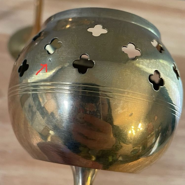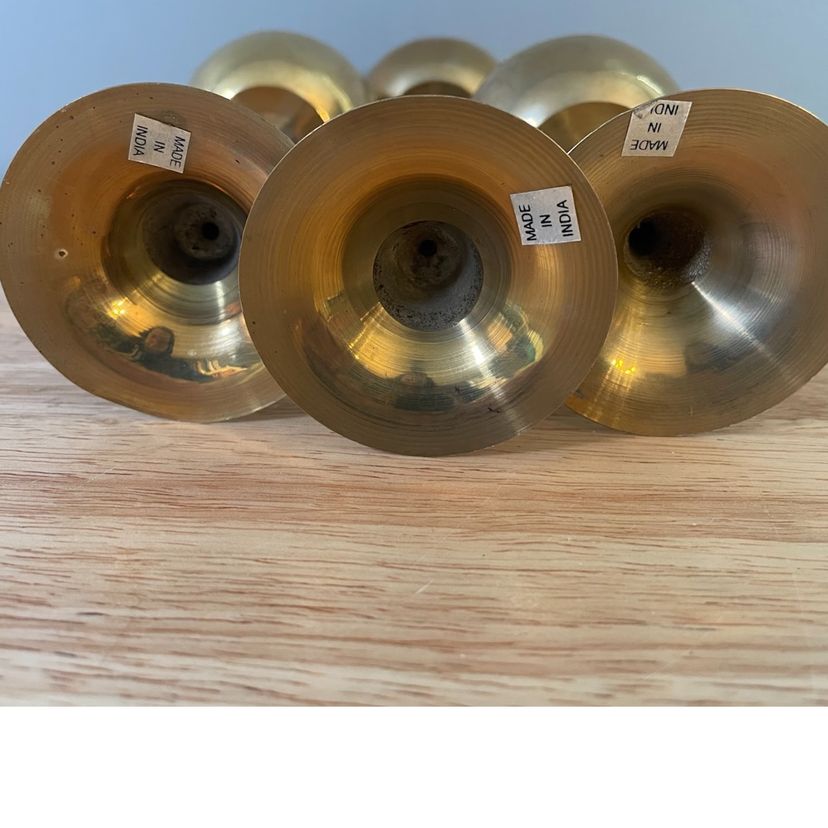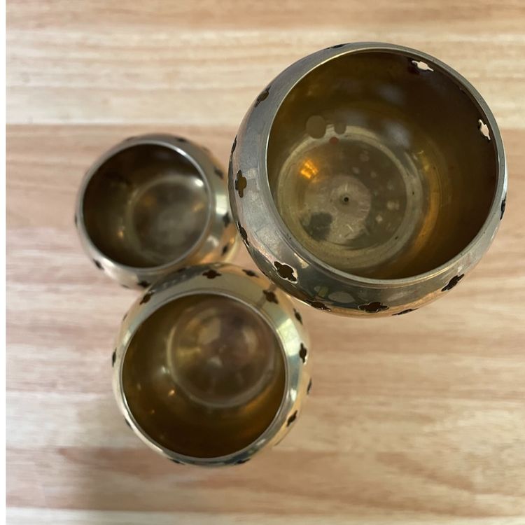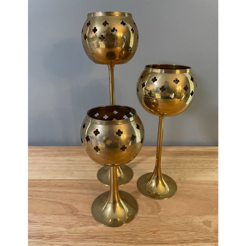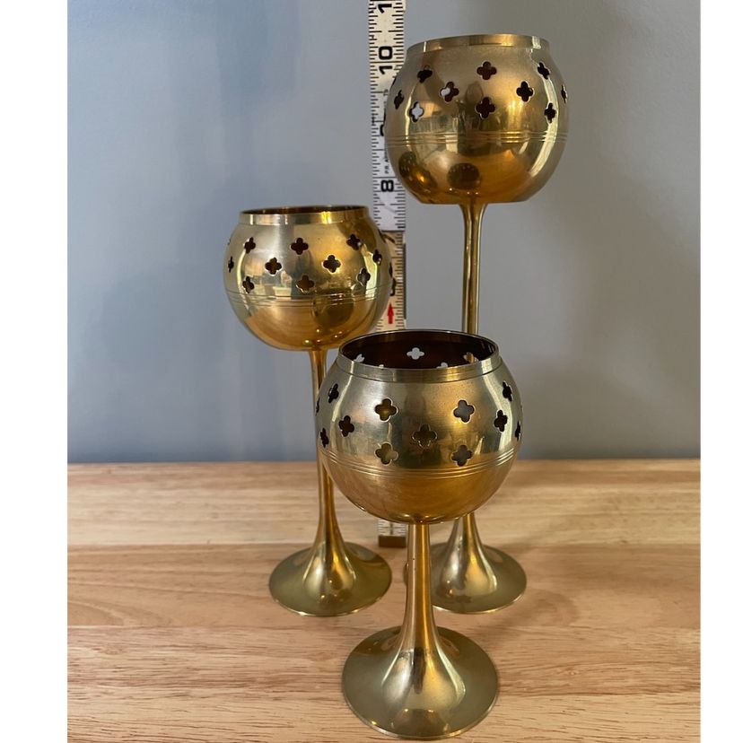 Really nice set of brass votive candle holders. Elevated in three different sizes with trumpeted feet. One tiny dent and scratch on the tallest one (as seen in pictures).