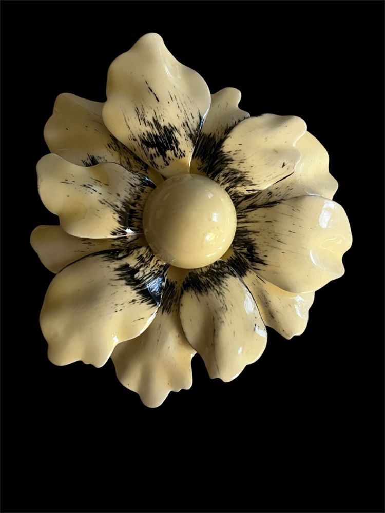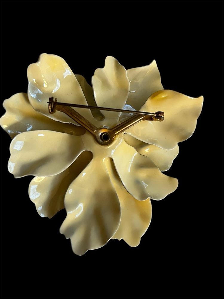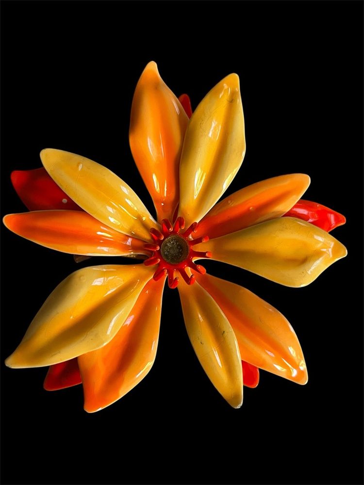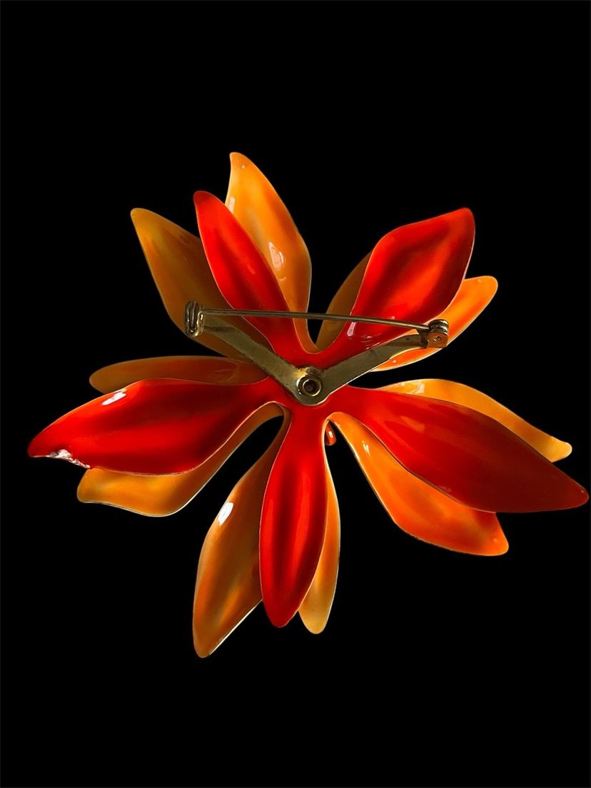 This set of three vintage enamel flower brooches are from the 1960s or 1970s. Each brooch features a different multicolor flower design, perfect for adding a pop of retro style to any outfit. Made from enamel, these brooches are durable and eye-catching, making them a unique and stylish accessory for any occasion. All have working pins, the only flaw is on the orange pin, it looks as if a center stone used to be there and is missing.
