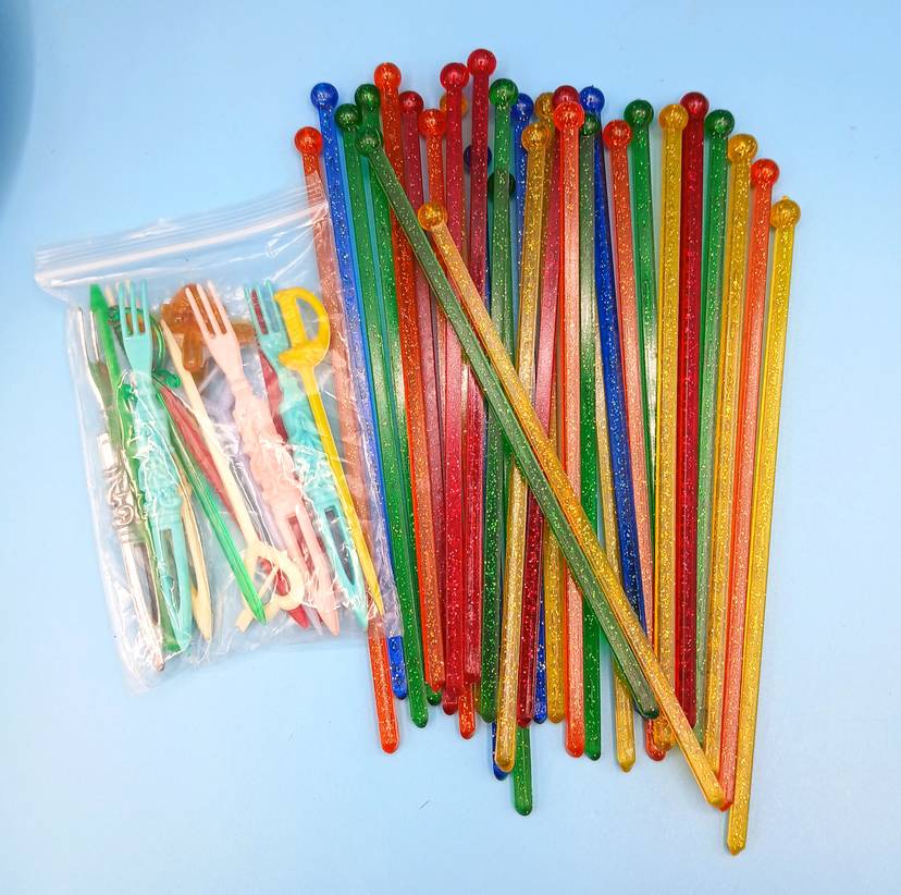 Groovy retro plastic swizzle sticks, plus a handful of vintage plastic sandwich spears. Stirrers measure about 6", are made of hard plastic with glitter inside. All are in tact. Thanks for looking!