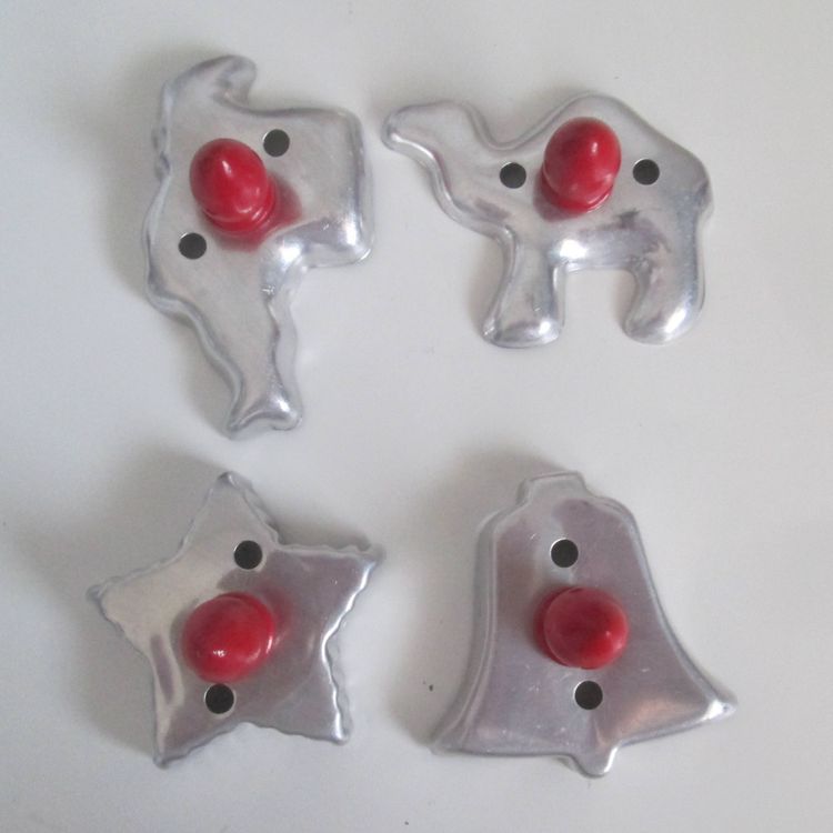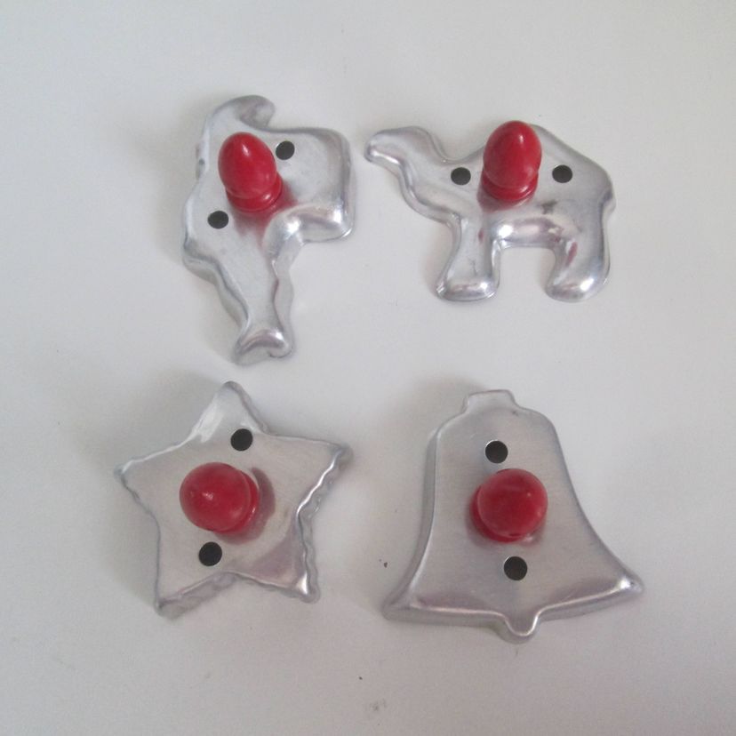 Set of 4 - 1930's Christmas cookie cutters with red wood handles. In overall good condition. The set contains a Santa, star, bell and camel.