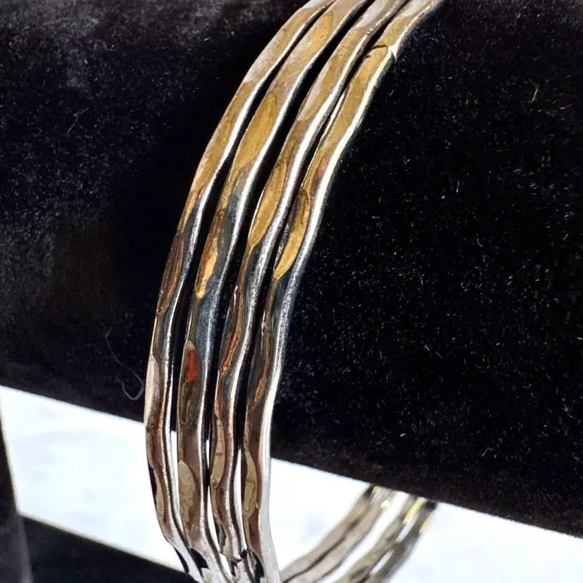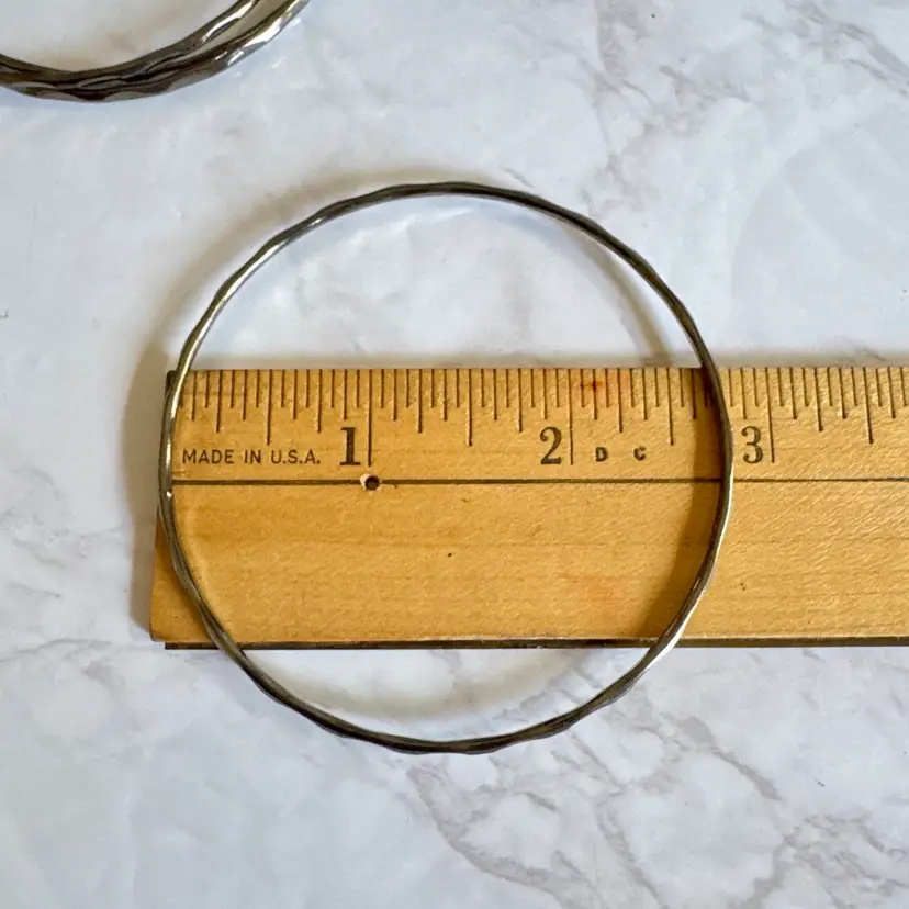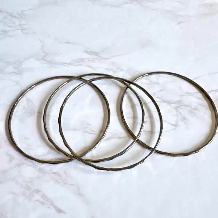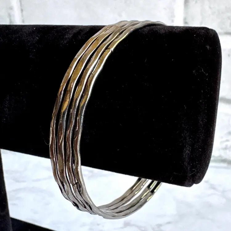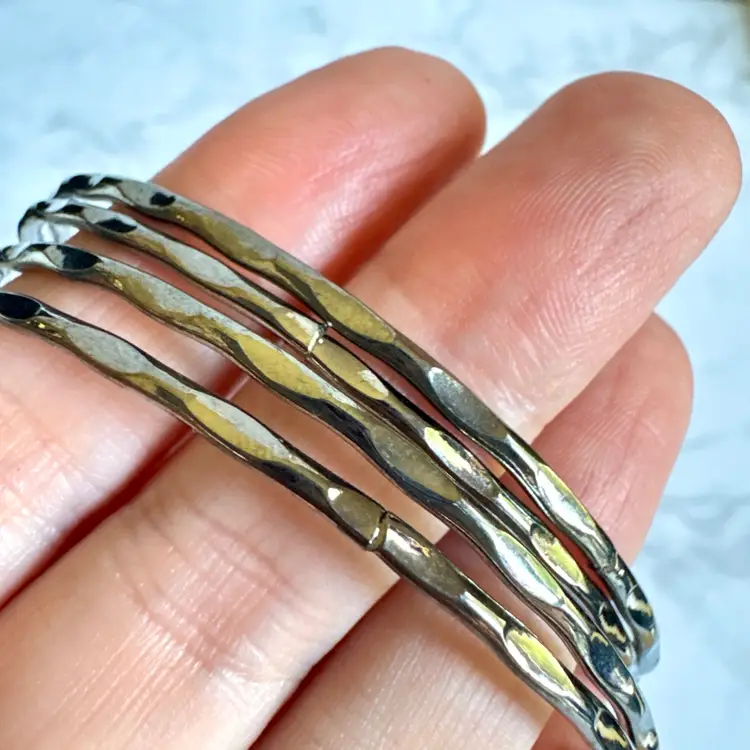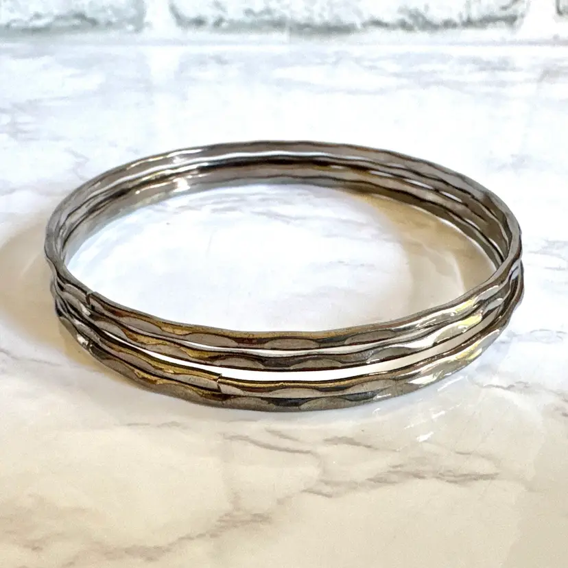Set of 4 bangle bracelets in dark grey metal with a faceted cut design for a jewel-like effect. Each measures about 2-3/4” diameter, suitable for various wrists. Good condition with minor wear. A fashionable costume jewelry set with contemporary flair!