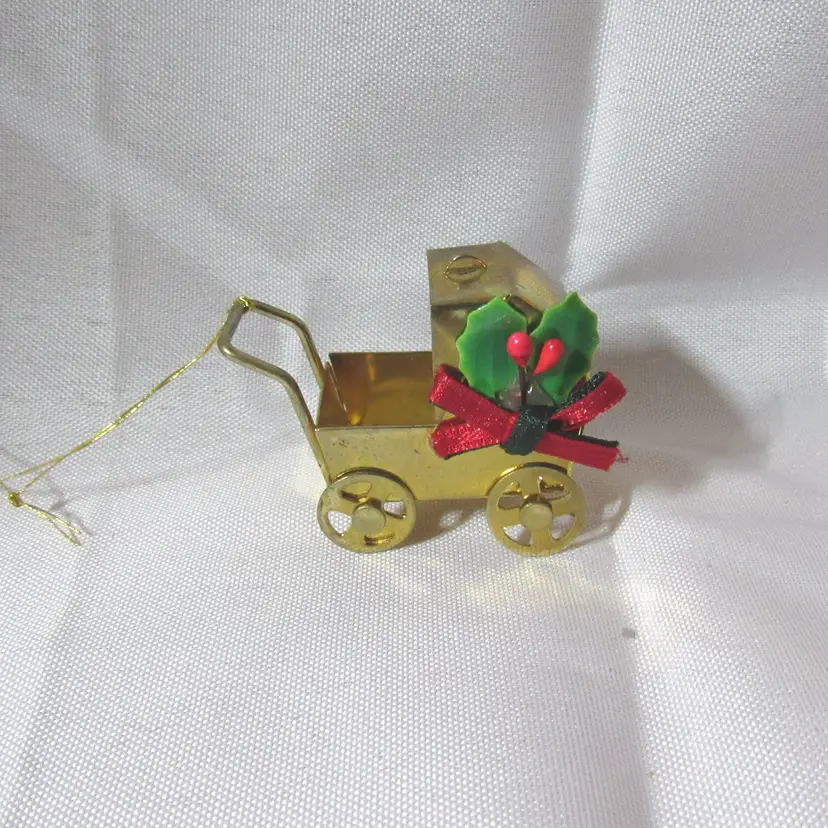 May be some discoloration from age. Used each year on our Christmas tree Sled - Approx 4 1/2" hang length Bike - Approx 2 1/4" hang length x 3 3/4" Sleigh - Approx 3" hang length x 3 1/4" Baby Carriage - Approx 1 3/4" hang length Each has a gold thread hanger