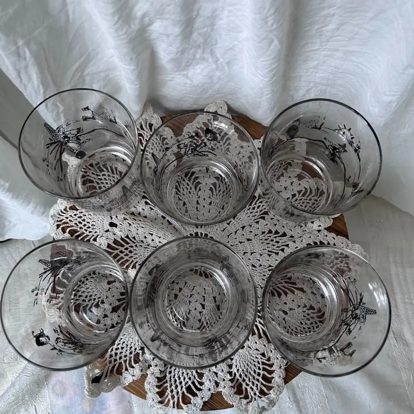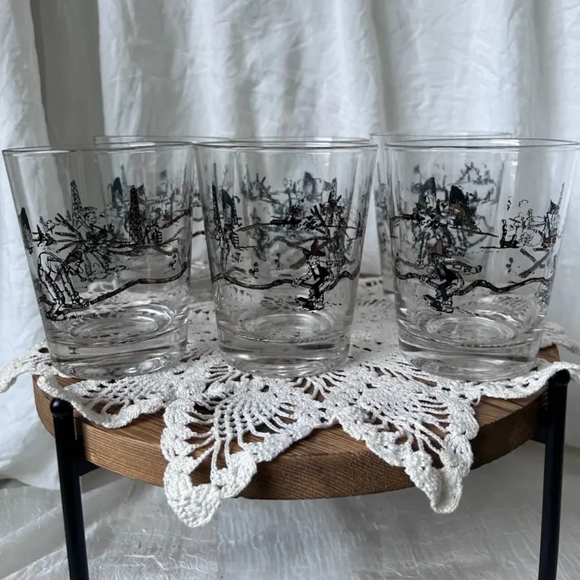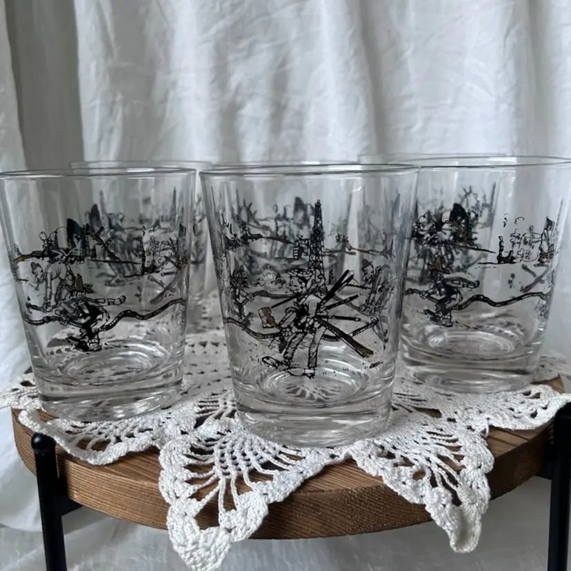 Set of 6 vintage MCM whiskey glasses in great condition. The graphics are in excellent condition and represent the oil boom in the 1800s that took place in Bolivar NY. They measure 4.5” tall by 3.75” in diameter.