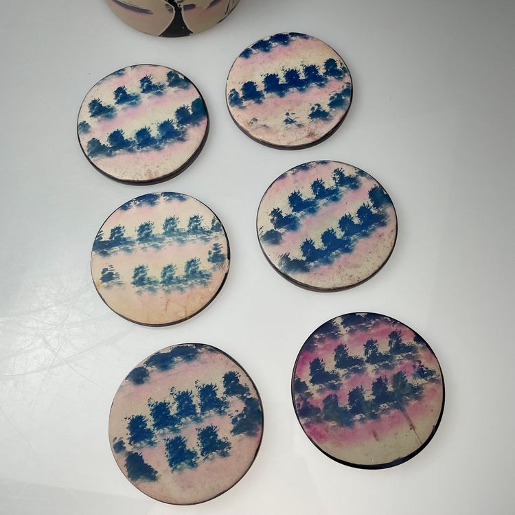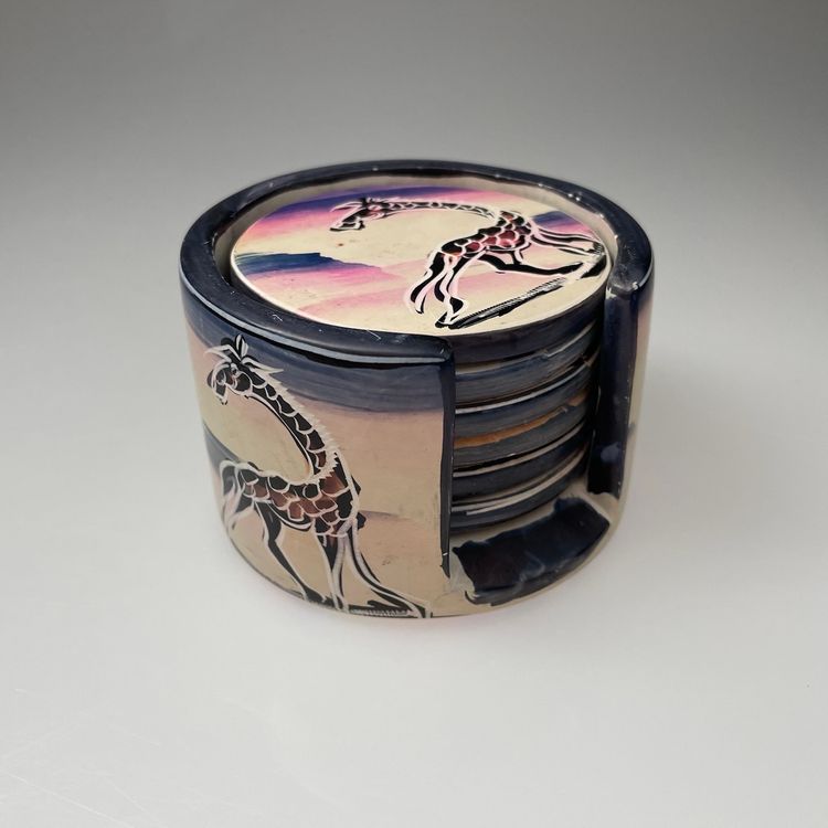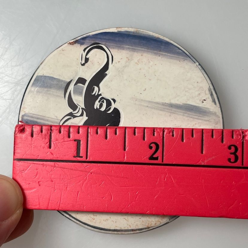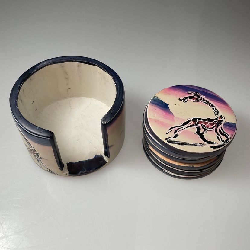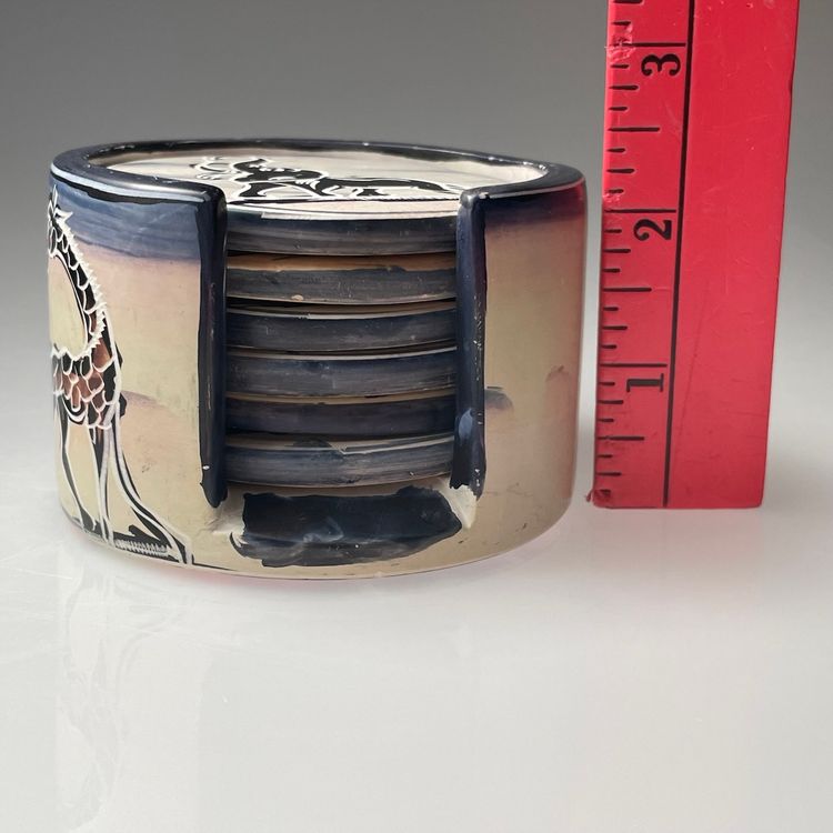 Measurements are approximate: coasters are about 2.75 inches diameter, holder is 2.25 inches tall, 3.5 inches wide