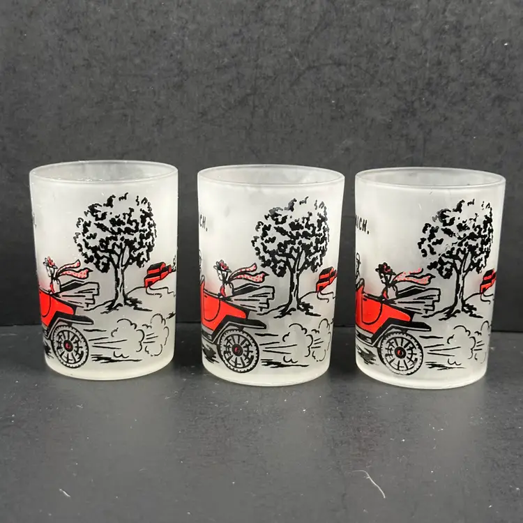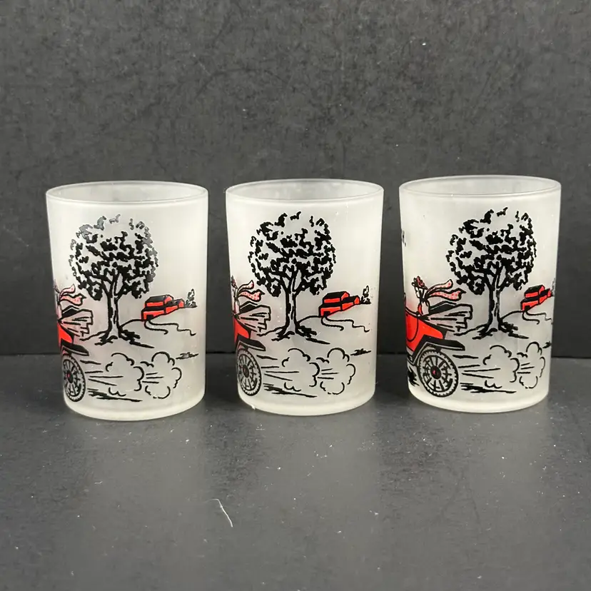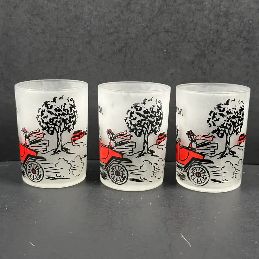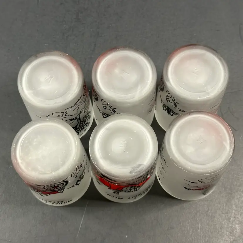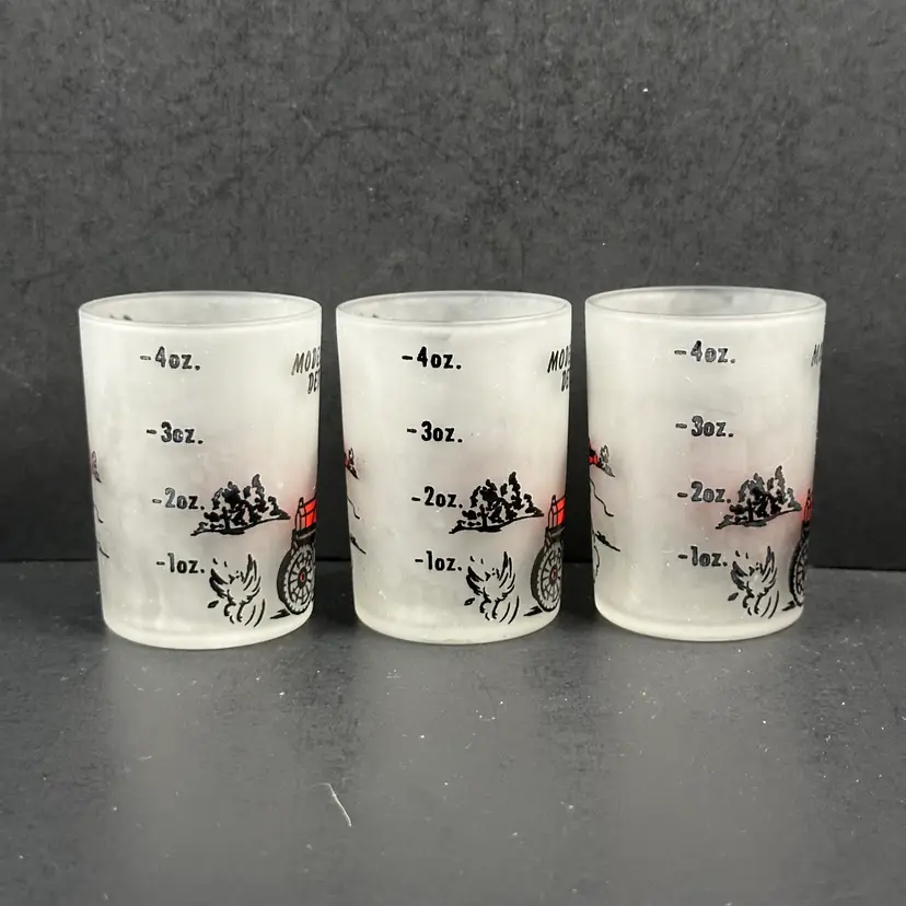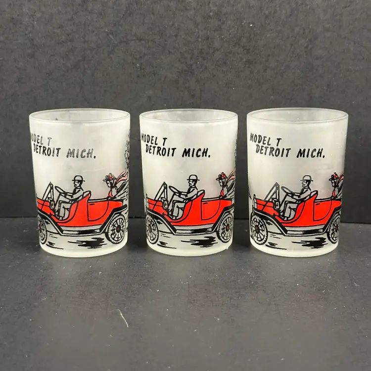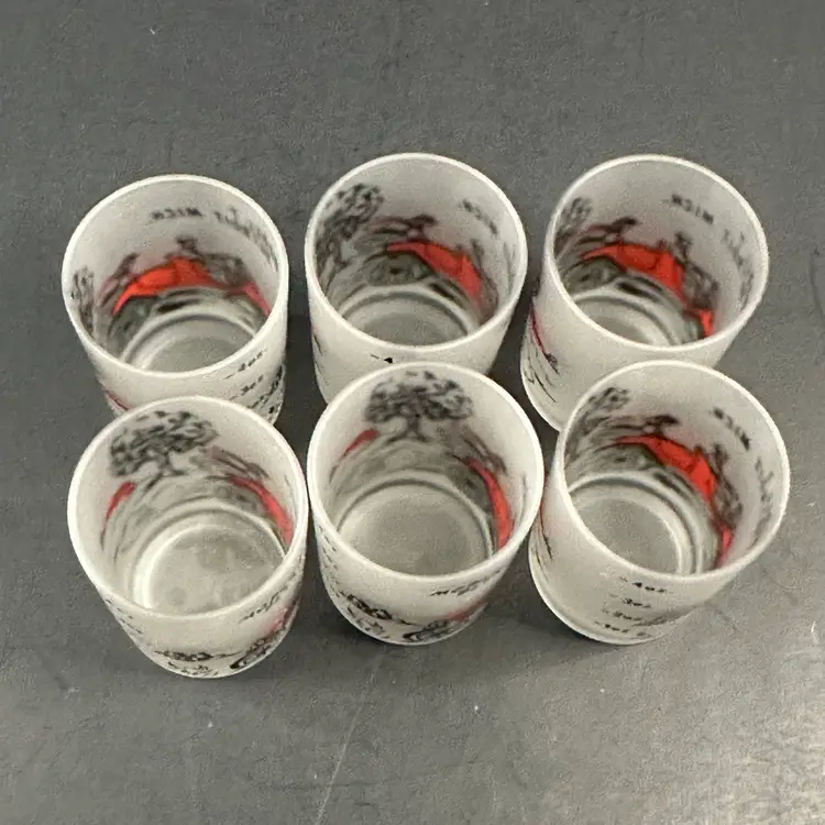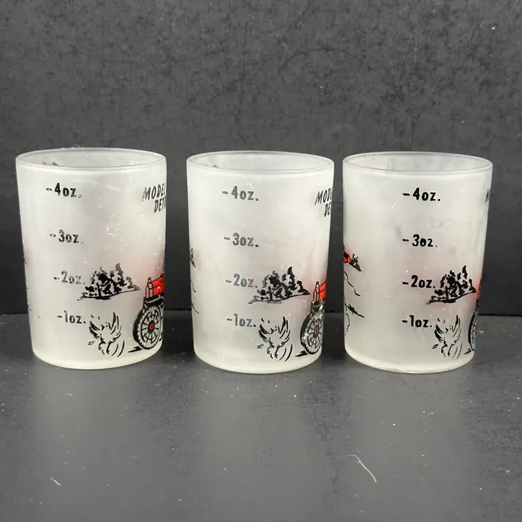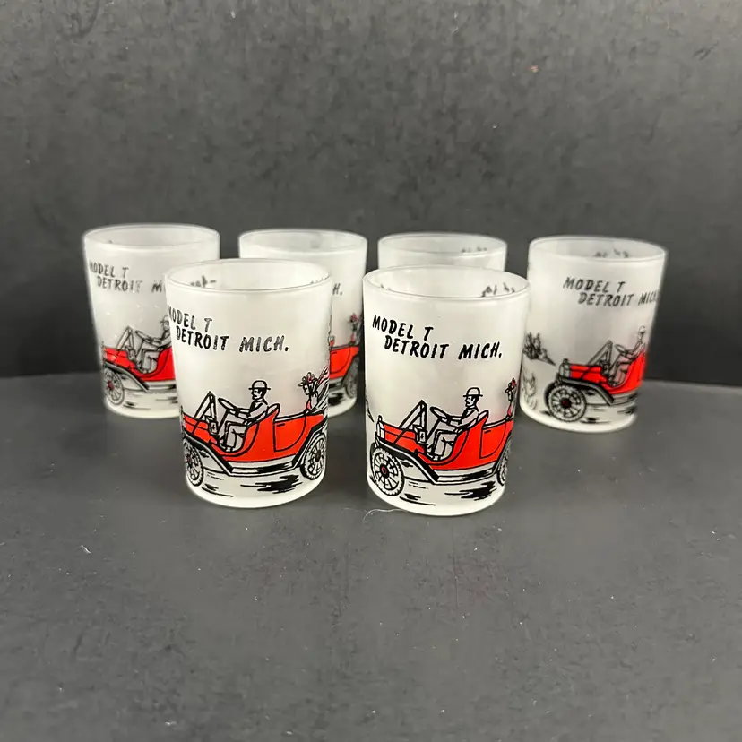 Set of 6 Vintage Hazel Atlas Model T Frosted 4 oz Shot Glasses in good preowned condition. Each glass stands approximately 3 inches tall with a diameter of 2 inches and a capacity of 4 fluid ounces. No nicks, chips or cracks but there is some wear to the design. Please see photos for all the details.