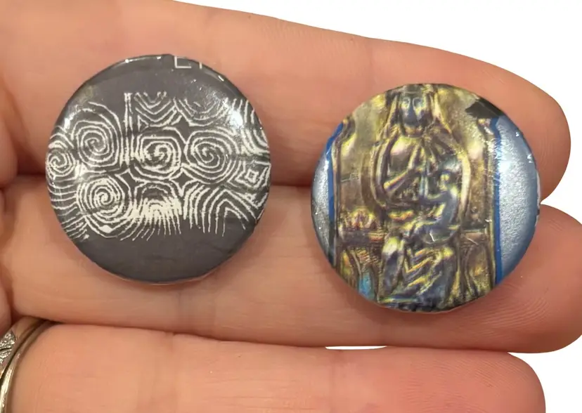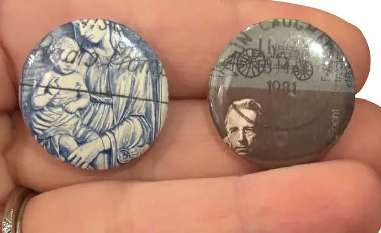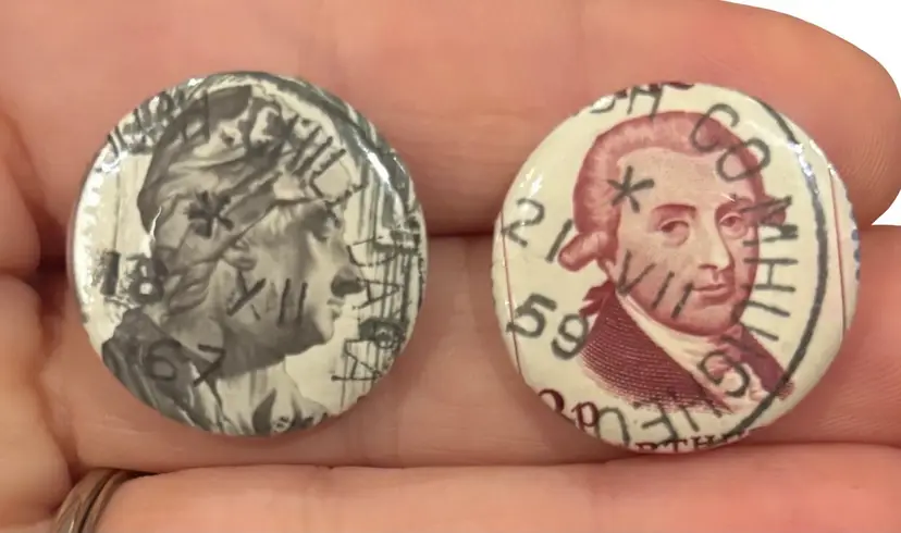 Pins are made with vintage used foreign stamps dating from the 50’s to the 80’s.