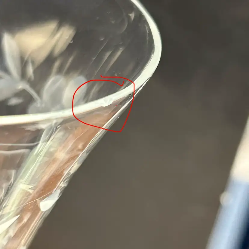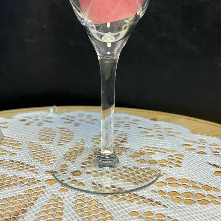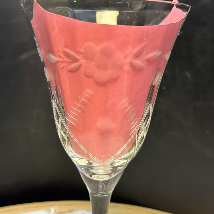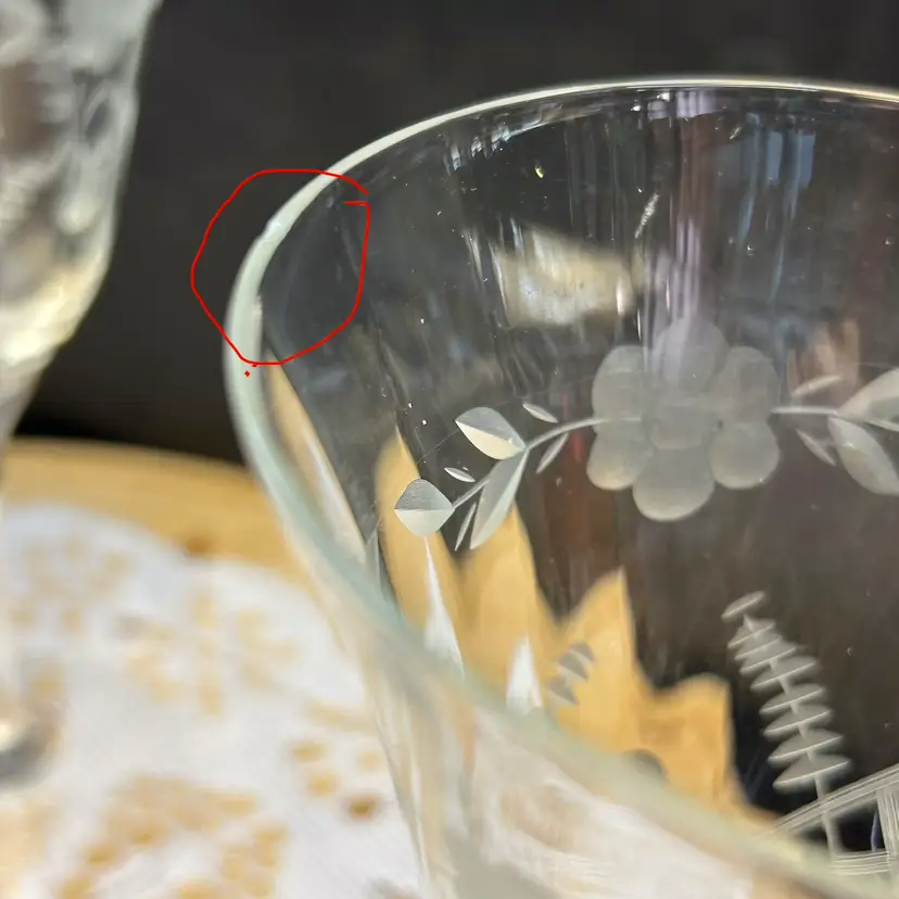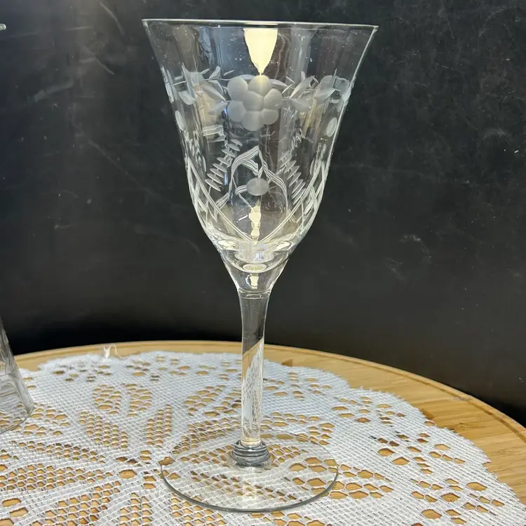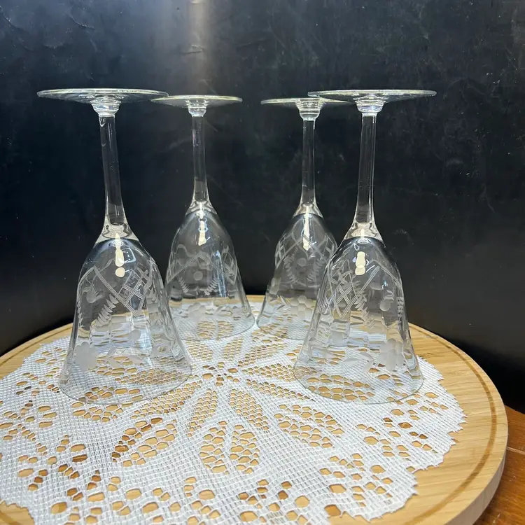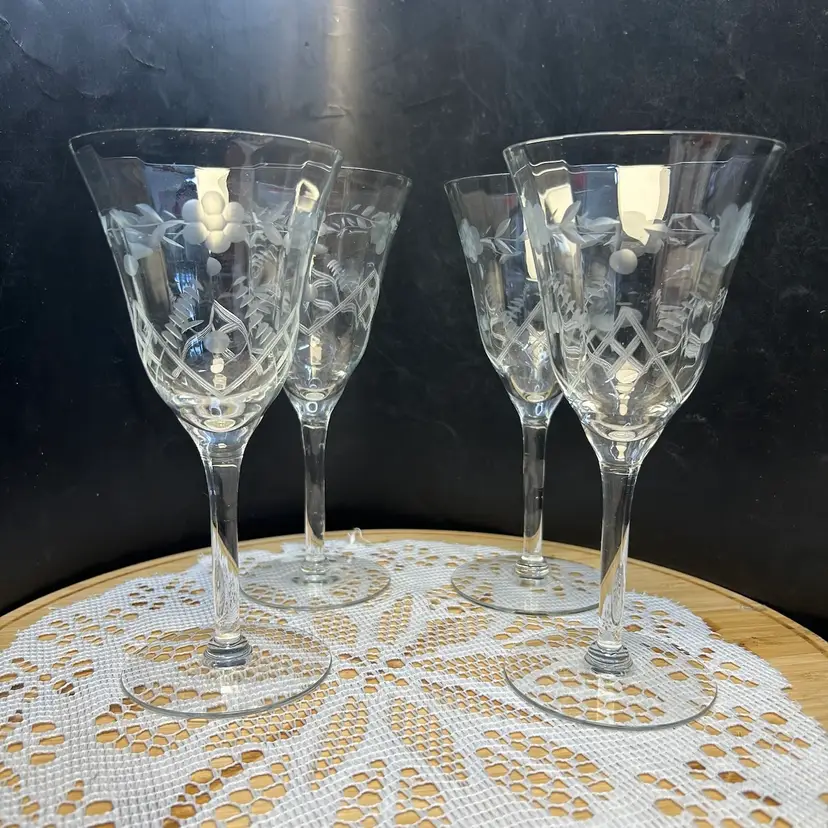 Etched design is made up of a flower with horizontal stem and leaves on each side of flower, repeats around the circumference of the goblet. Under each floral design is an etched dot. Underneath that are a series of geometric designs creating cross hatching. Three goblets are in excellent condition. The fourth has a tiny chip on the rim as shown in last two photos.