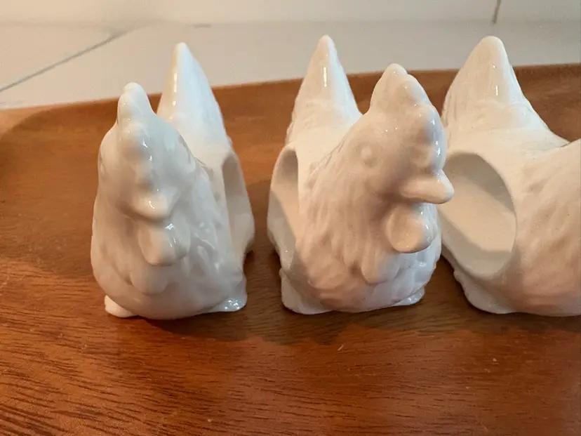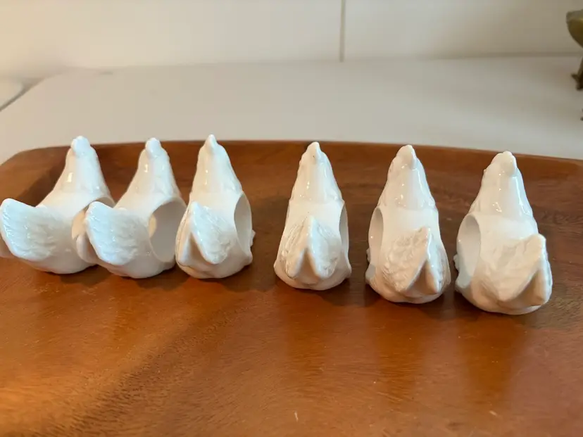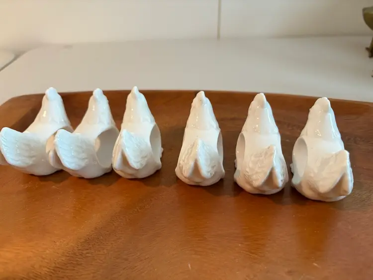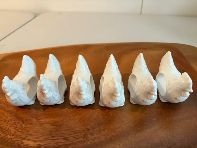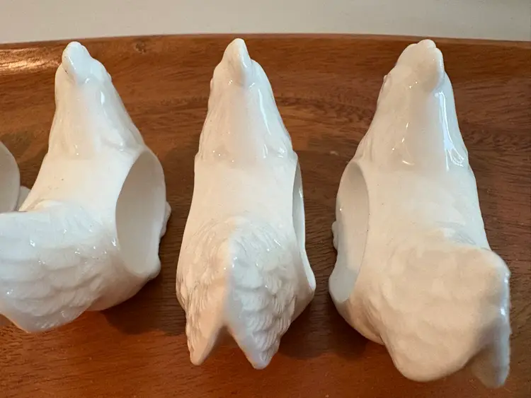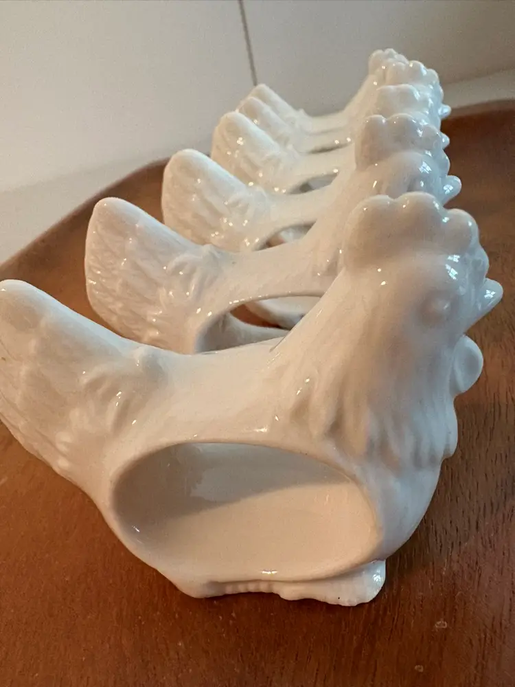 This set of 6 white porcelain chicken napkin rings holder is perfect for adding a touch of farmhouse charm to your kitchen decor. Made of ceramic in a country style, these napkin rings are an original set from the 1980s. The all-over chicken pattern adds a rustic and whimsical touch to your dining table, making them a unique and collectible addition to your kitchen linens and textiles collection. Perfect for adult use and adding a decorative flair to your meals. Six napkin holders perfect for the holidays. 3 1/2” across and 2 1/4” high.