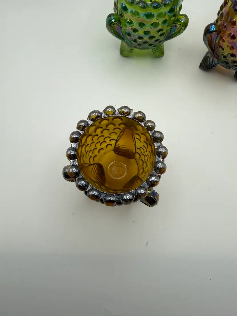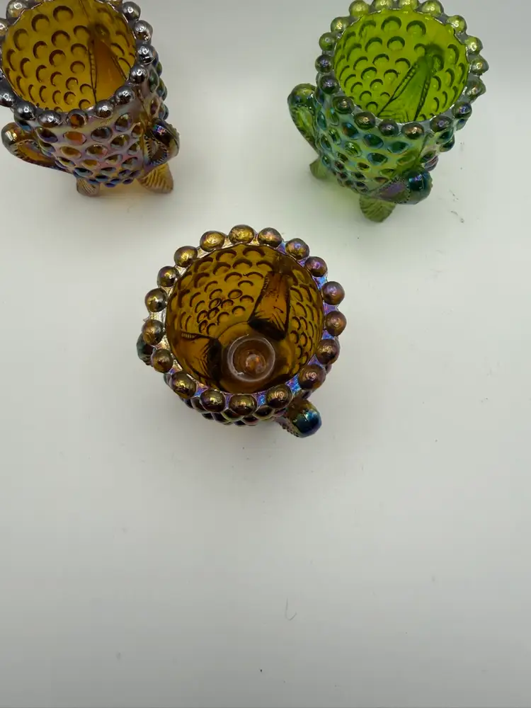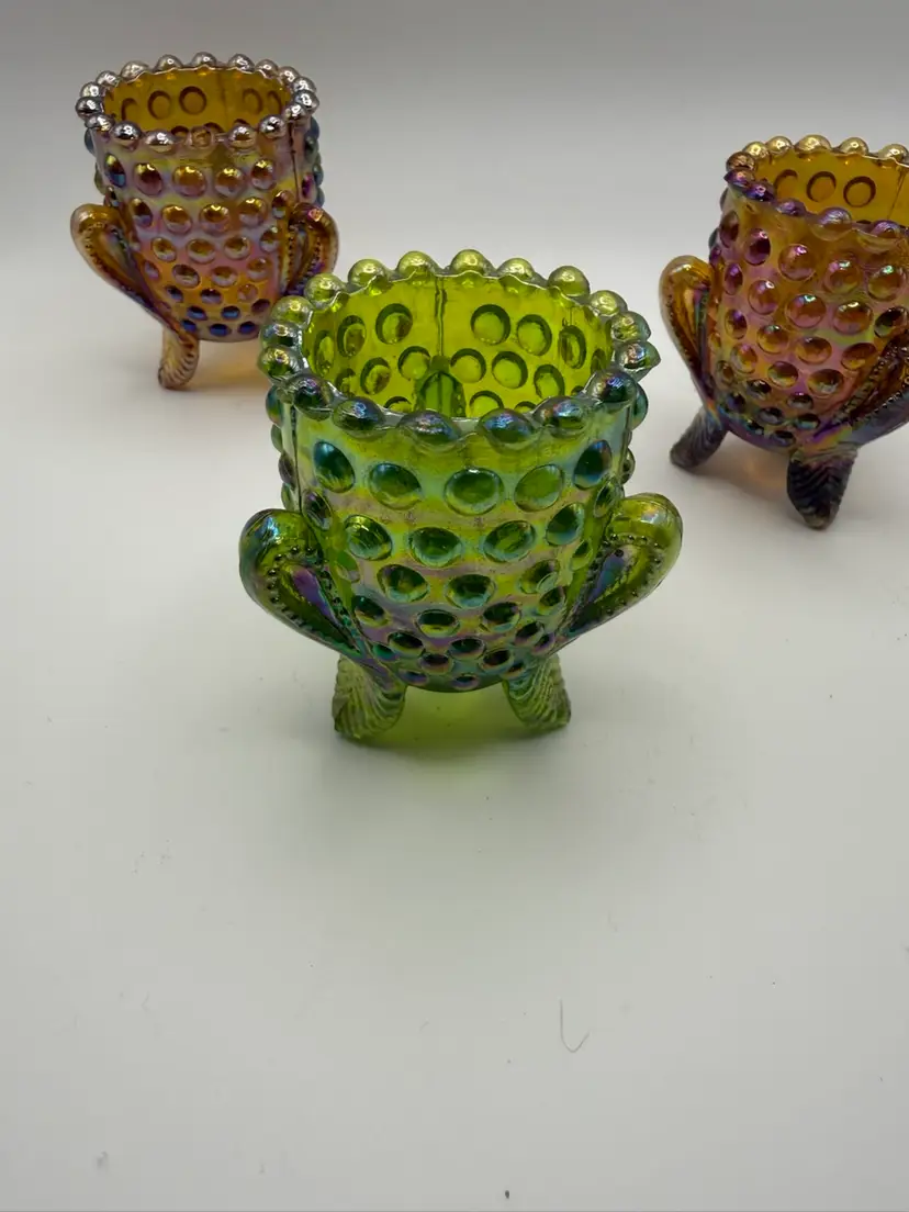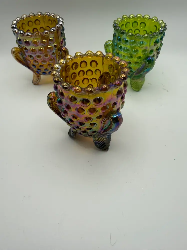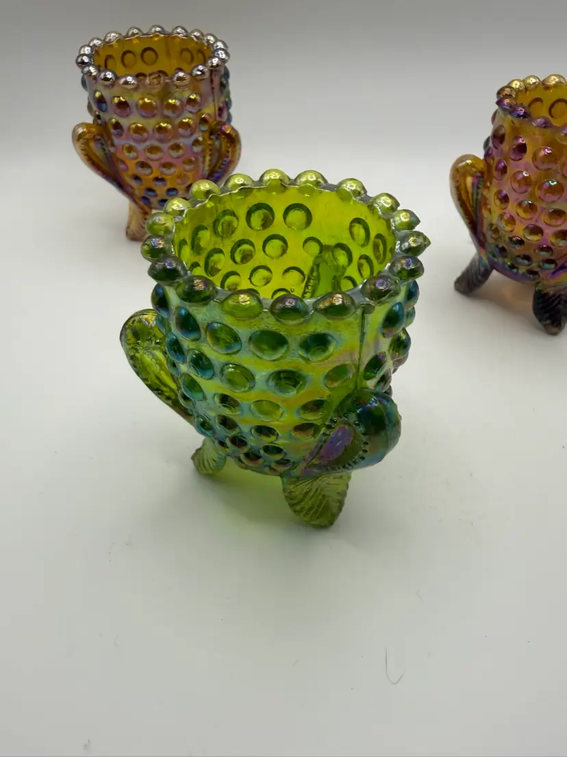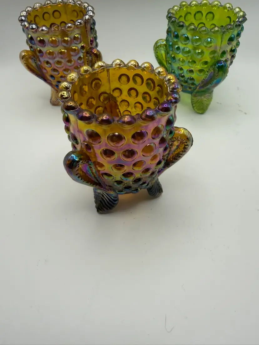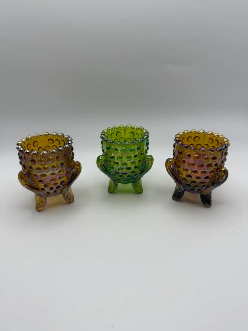 These three toothpicks holders that are iridescent in three colors are from the Kanawha Glass Company which was an American glass manufacturer founded in Dunbar, West Virginia, in 1951. Glassware from Kanawha, particularly pieces with hobnail detailing, were common decorative items in American households during the latter half of the 20th century. These small holders, often used for flowers, candy, or as decorative accents, reflect the era's taste for colorful and textured glass pieces.