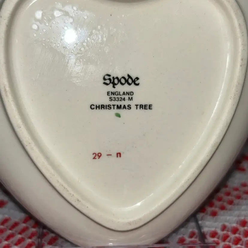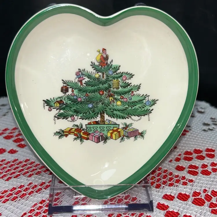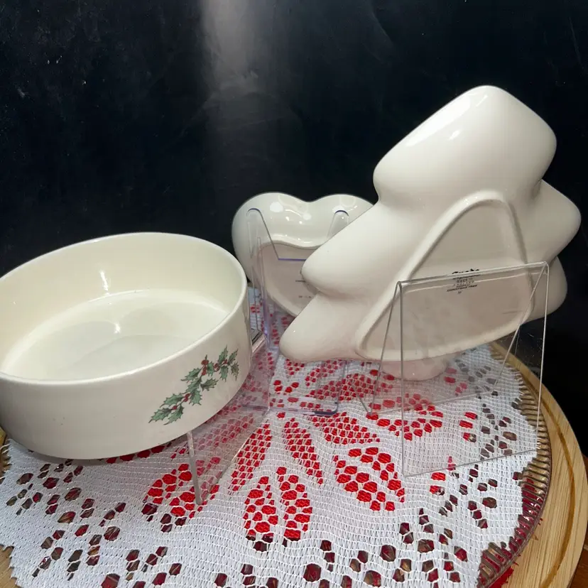Small heart trinket dish with green rim is 4” wide and 4” long. The Christmas tree shaped dish with red rim is7.5” tall and 7” wide. The round dish is 5” in diameter and 1.5” tall. All are in excellent condition. Price is for all three.