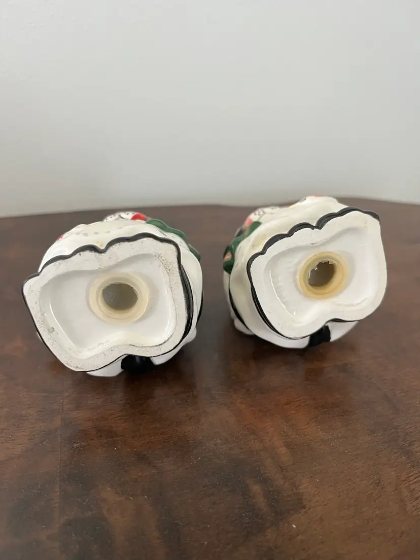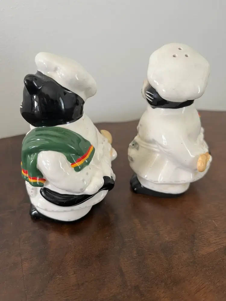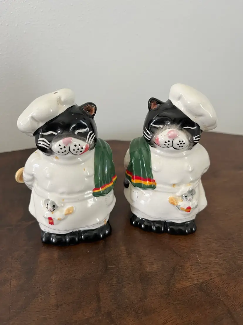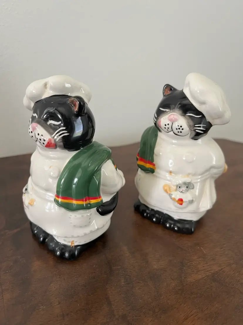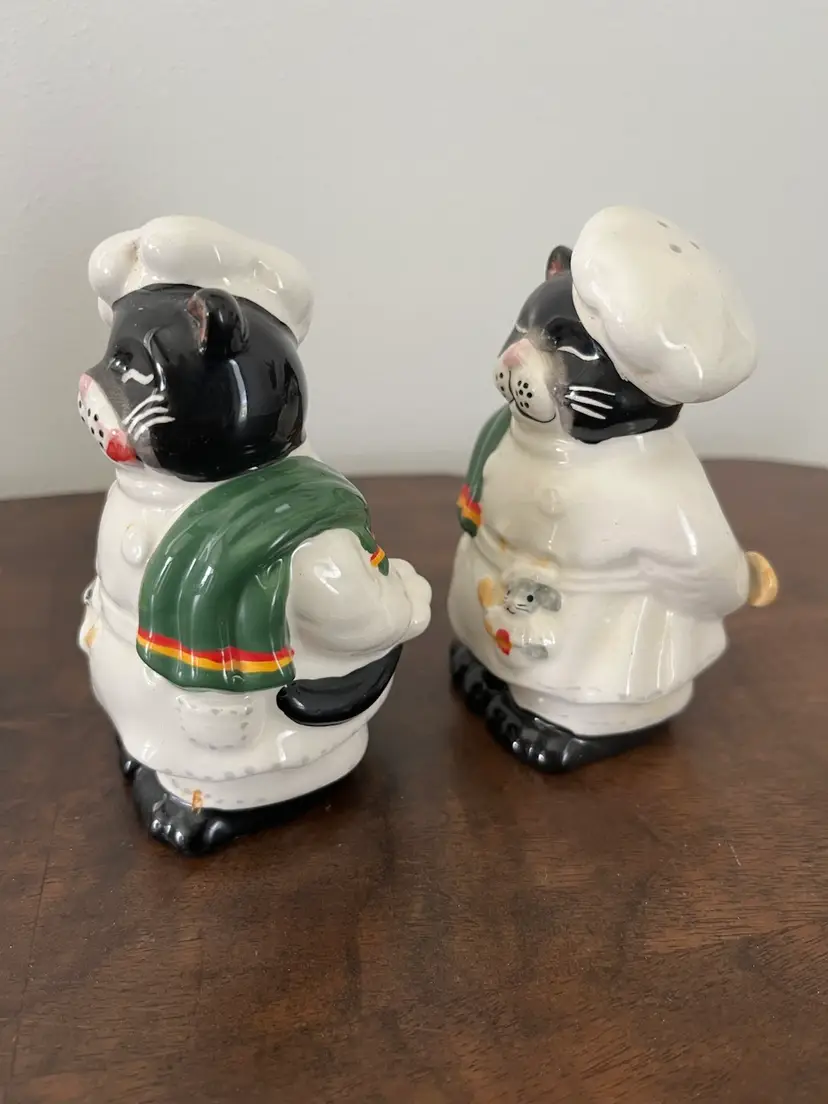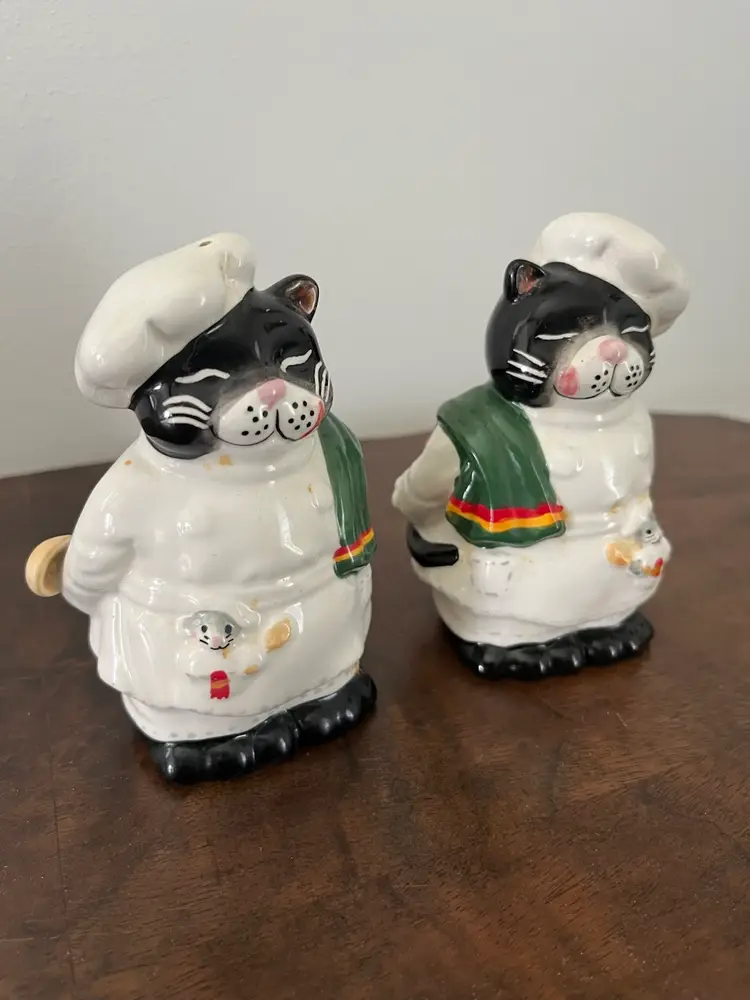 Set of vintage black cat chef salt and pepper shakers. A mouse is featured in the apron pocket of each cat. They are novelty items, likely from the mid-century era.