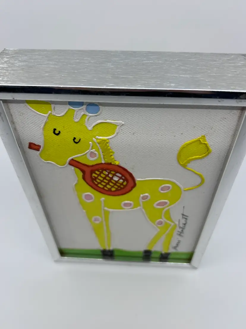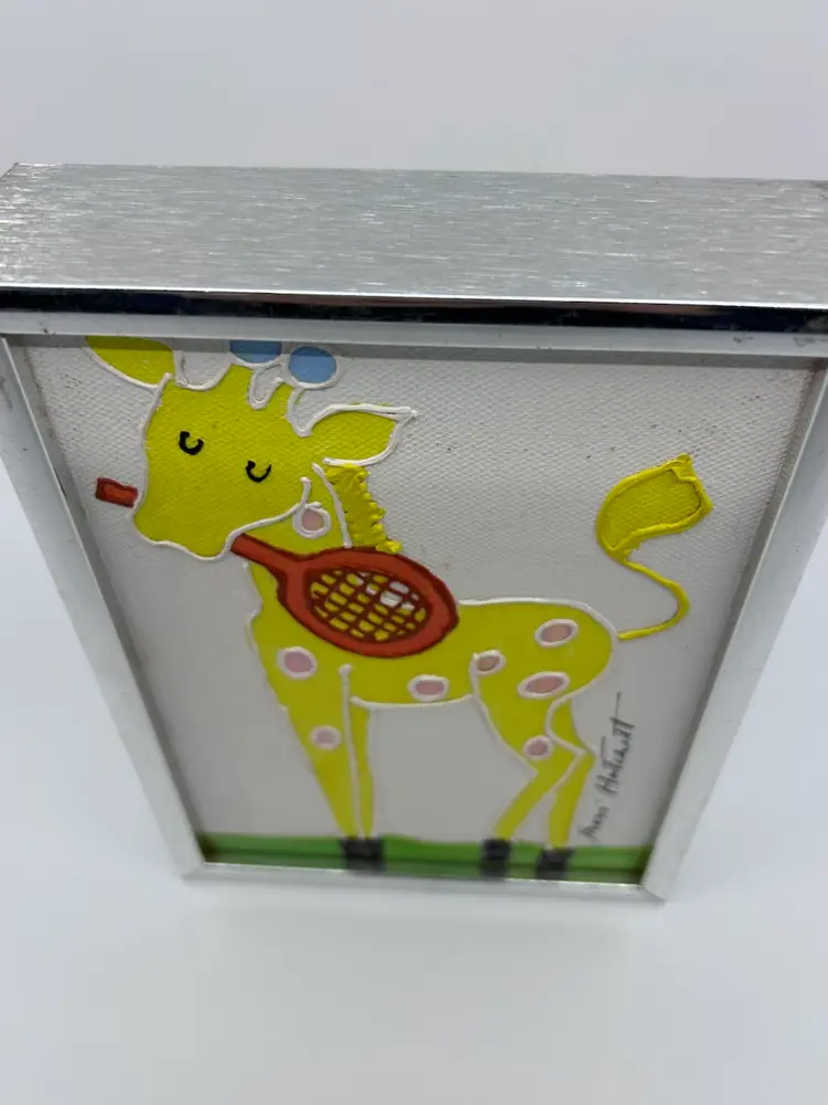 Shari Hatchett Original Framed Yellow Giraffe W Tennis Racquet Signed Acrylic