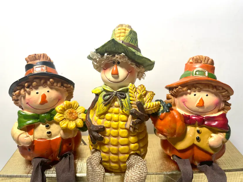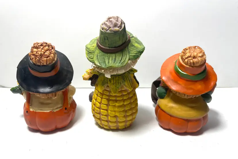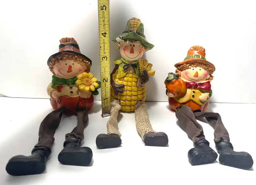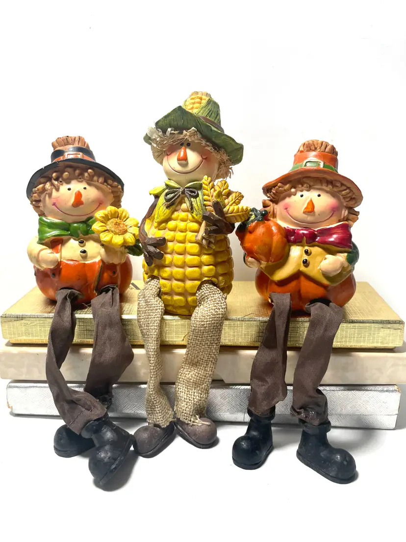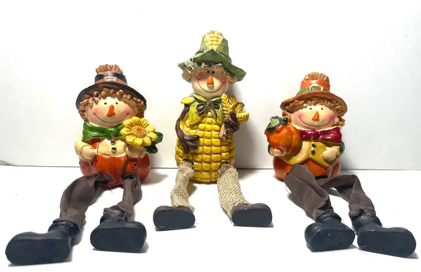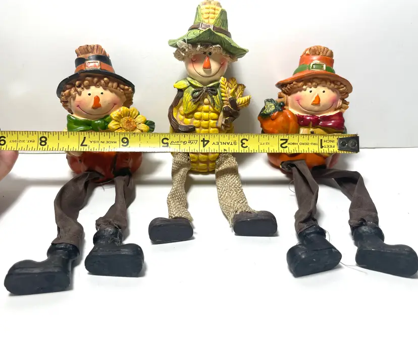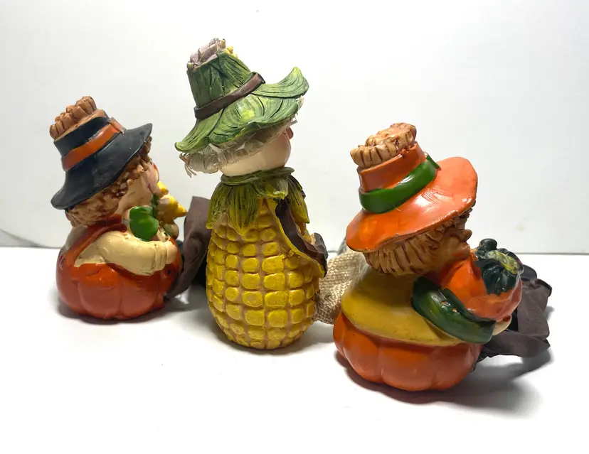 A trio of friends waiting for a new shelf to hang out on. Fun way to decorate from early September through late November. These sweet guys would even look great sitting on a window sill as seen in the pictures. One of them does have a tiny flea bite size nick on the top side of his hat brim (I circled it in the 9th picture) Set includes all three as they have been friends a very long time :)
