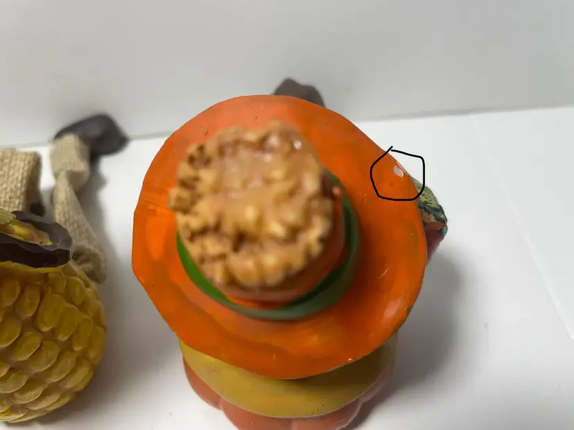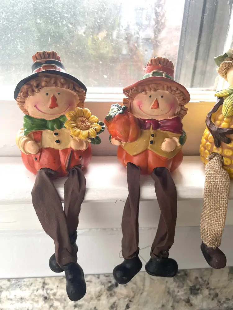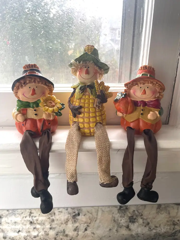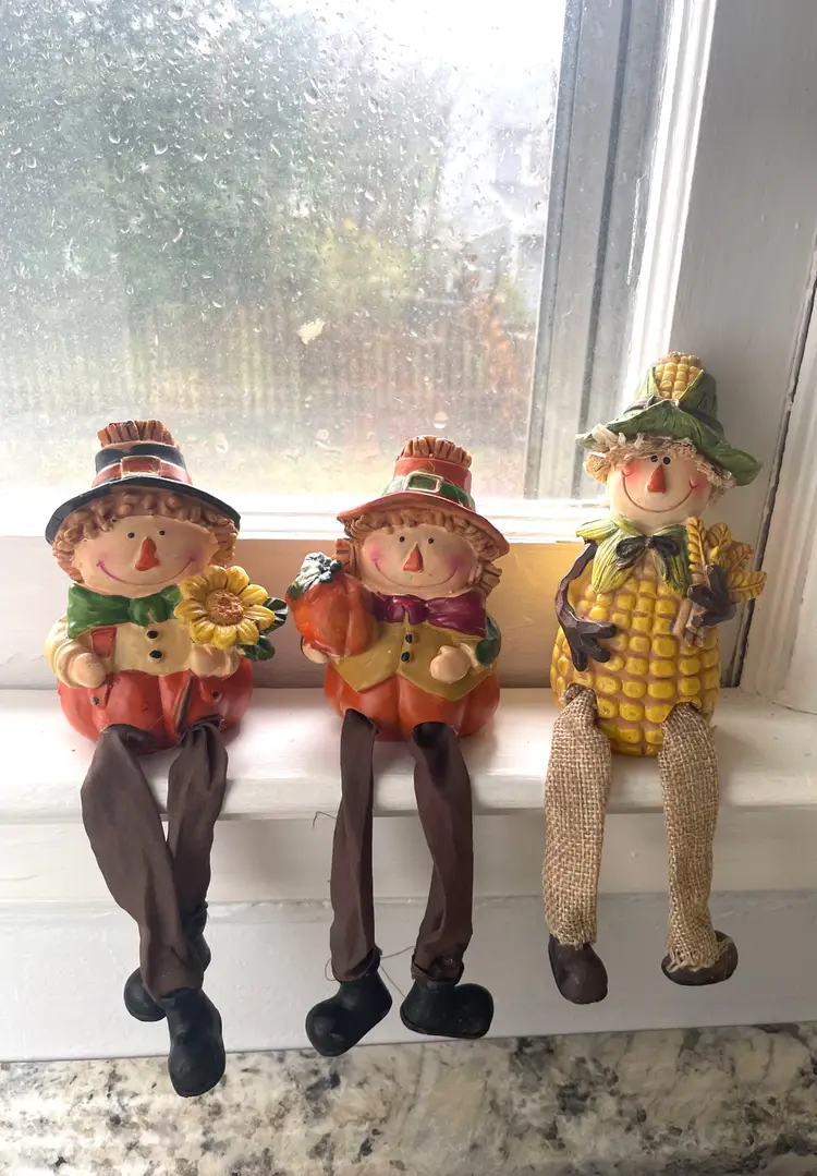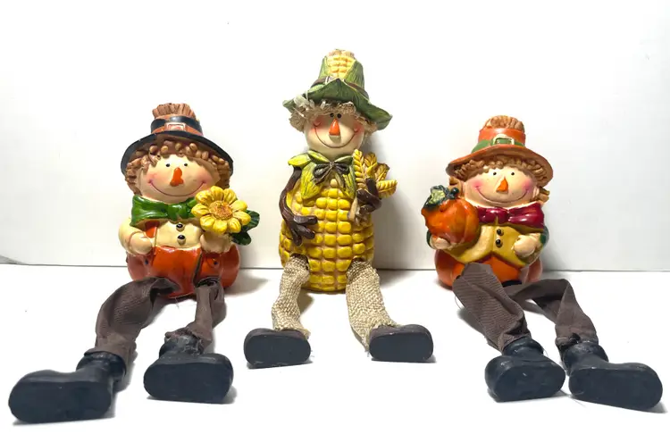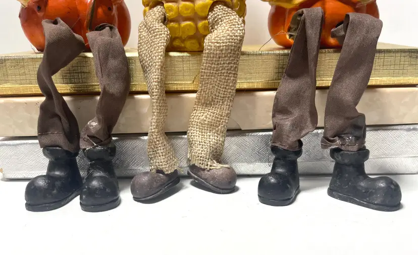 A trio of friends waiting for a new shelf to hang out on. Fun way to decorate from early September through late November. These sweet guys would even look great sitting on a window sill as seen in the pictures. One of them does have a tiny flea bite size nick on the top side of his hat brim (I circled it in the 9th picture) Set includes all three as they have been friends a very long time :)