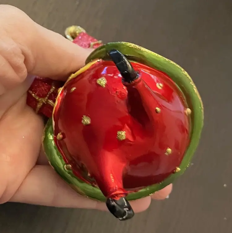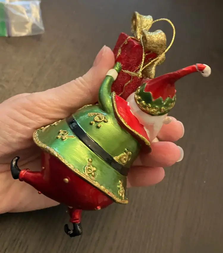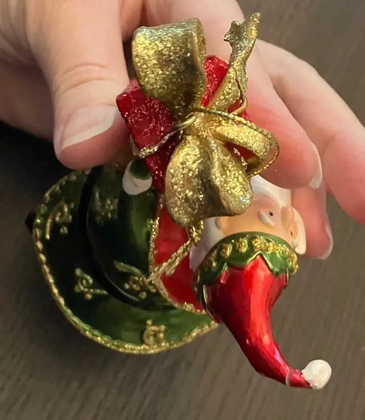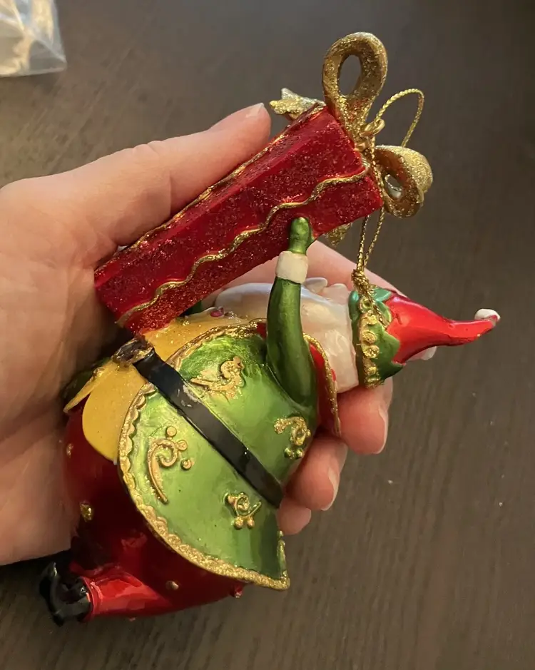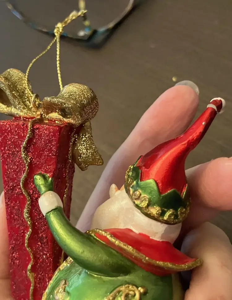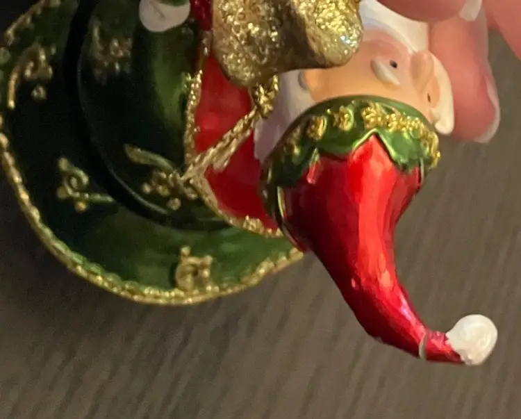 Damage to the top of the hat - cut across that does go about 3/4 way through. The ornament measures 5"in height and about 3 1/2" to 4" in width.
