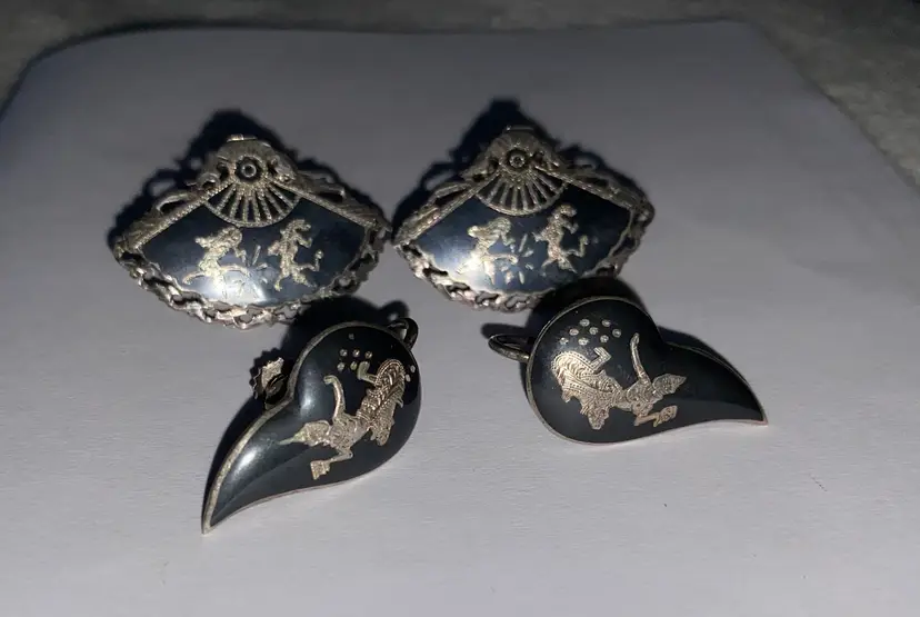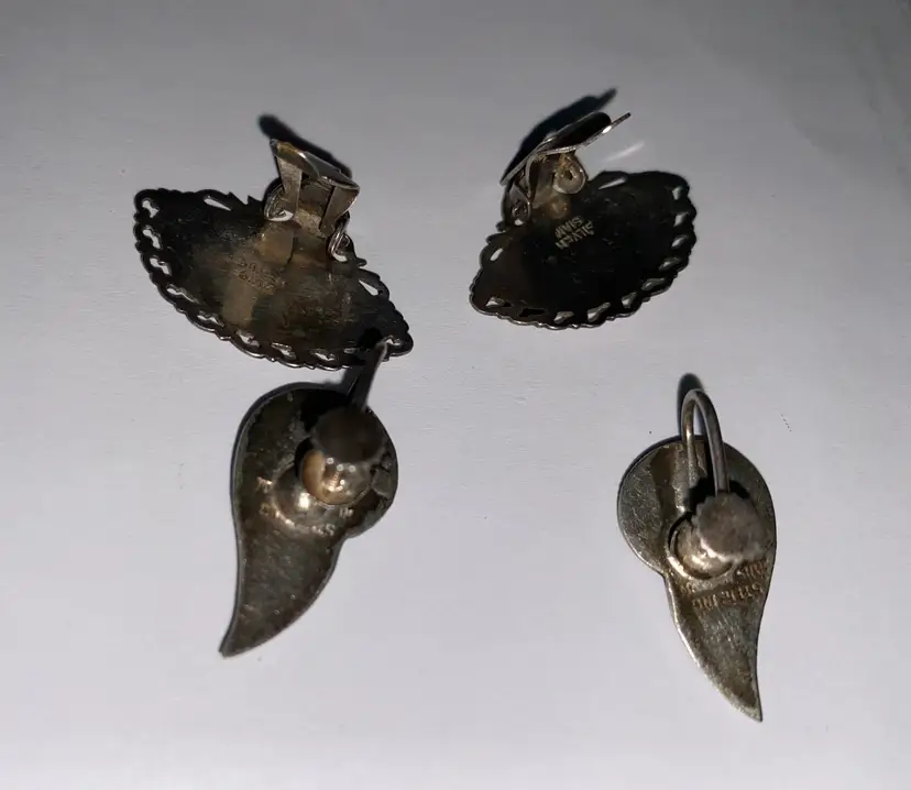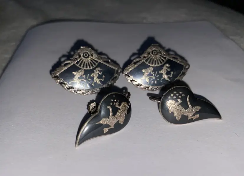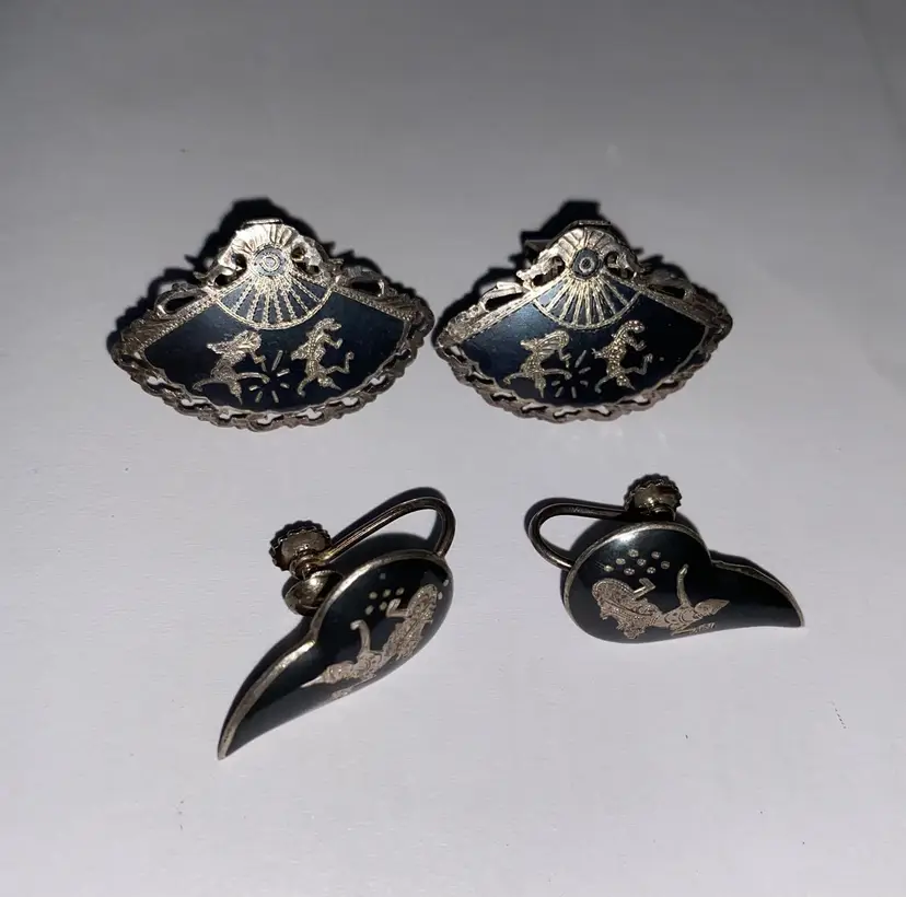 2 pair Siam Sterling Silver dancers earrings. Fan and teardrop shapes. The fan is clip on and marked Silver Siam. The teardrops are screw on and marked Sterling. Nice condition