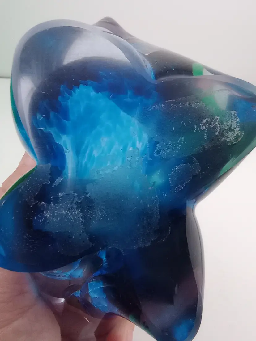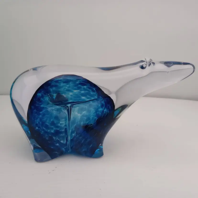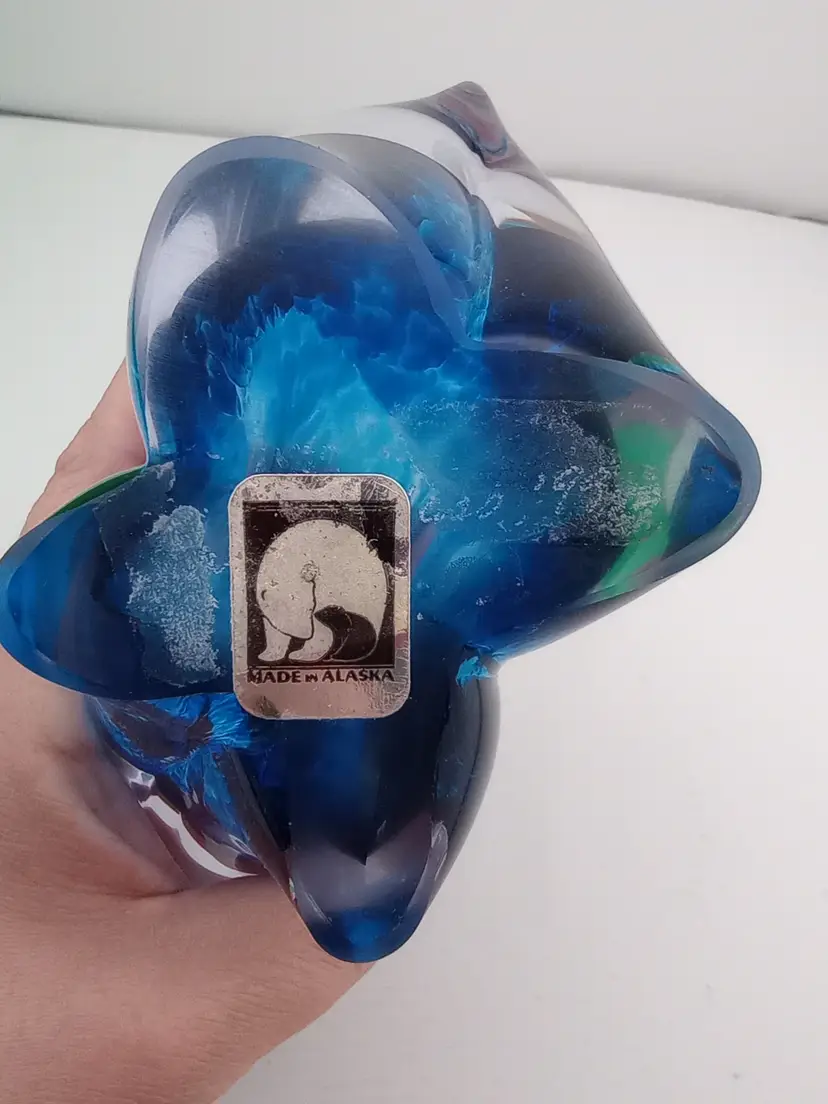 This is a beautiful Alaska Glass art glass polar bear paperweight signed by the artist. The color is gorgeous and its in excellent condition with no noted flaws. It also has its original label (though it's no longer sticky).