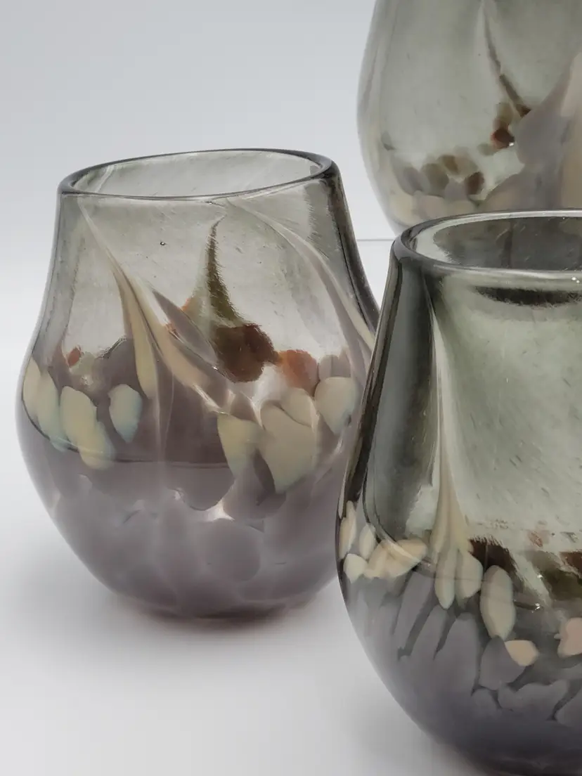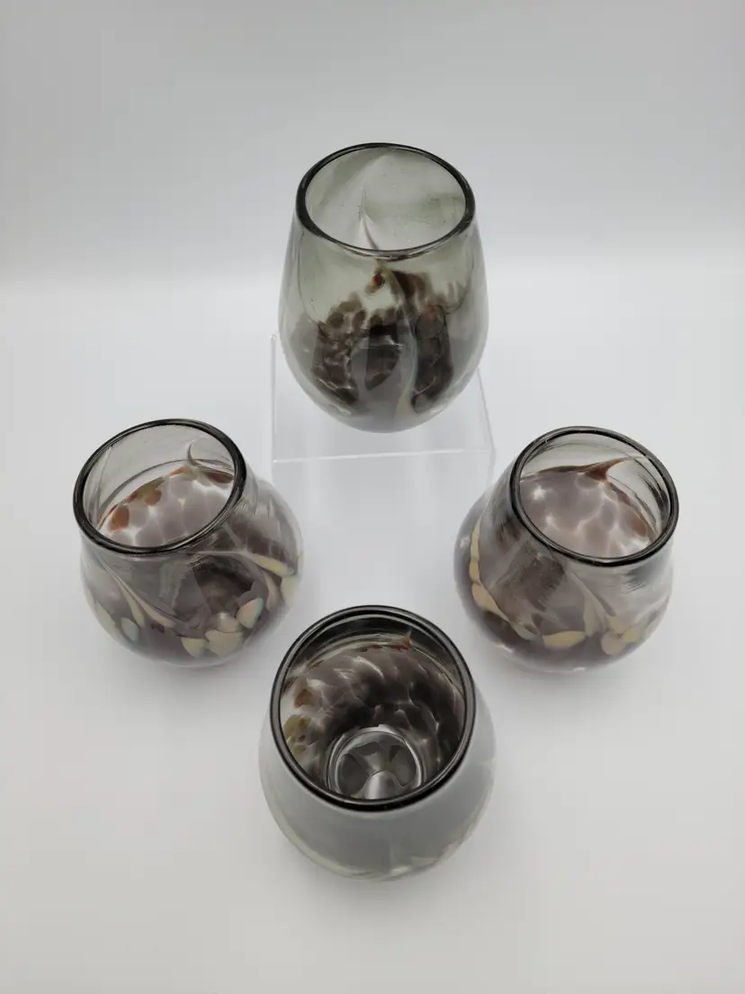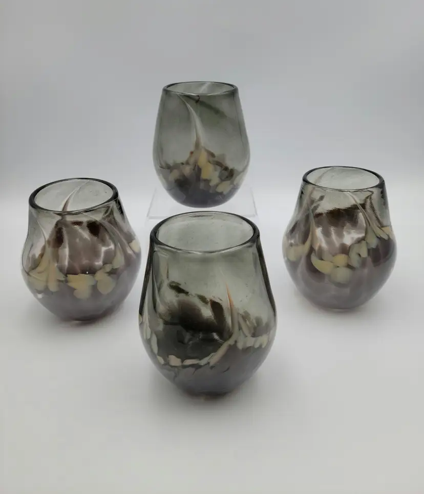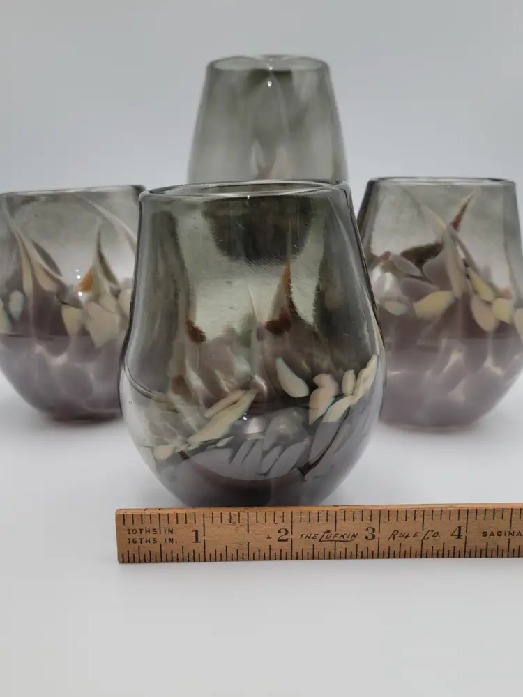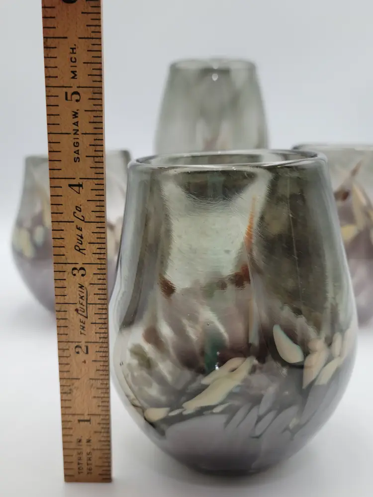 This beautiful set of glasses are a smokey gray glass with lavender bottom and swirls of pastel pink, blue and ivory. They are in excellent condition, no chips, cracks or surface scratches. Measurements vary but are approximately 4.5 inches tall, 3.5 inches at the widest point and have 2.5 inch opening. Thank you for looking and have a great day!