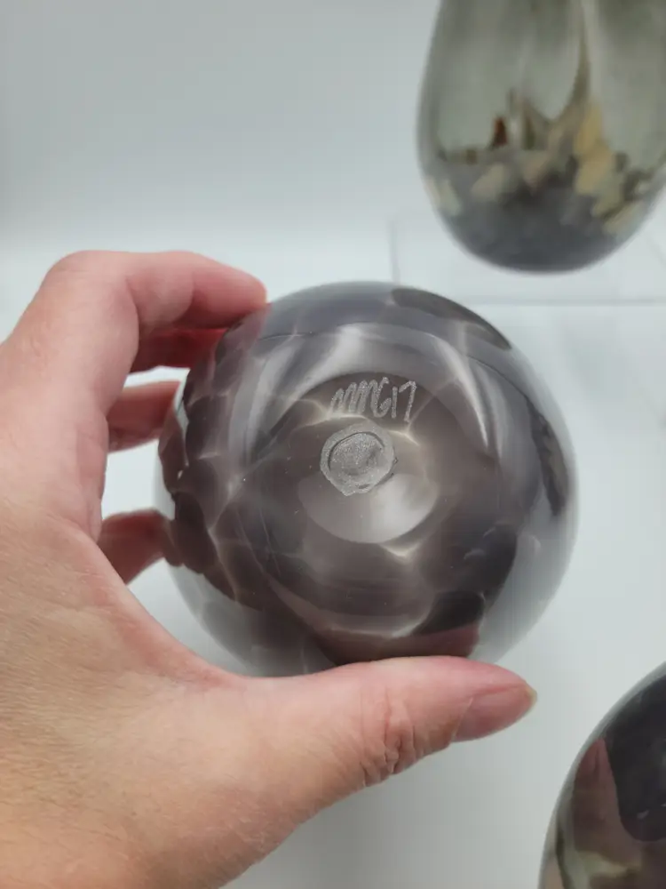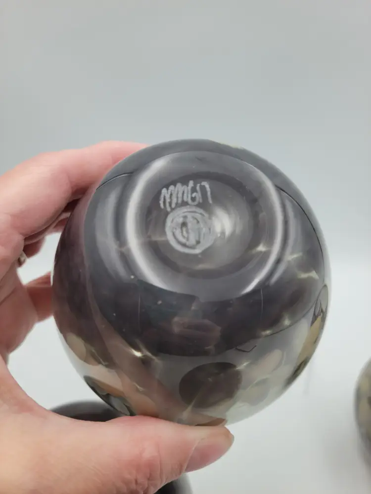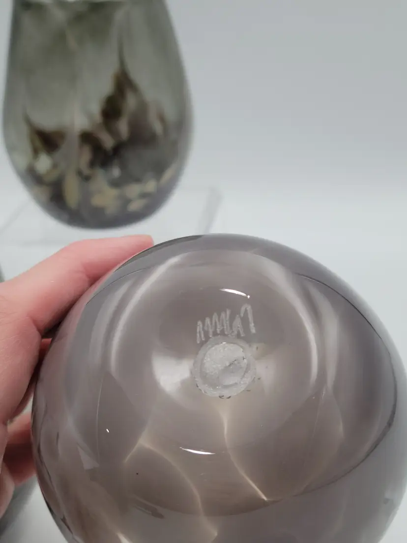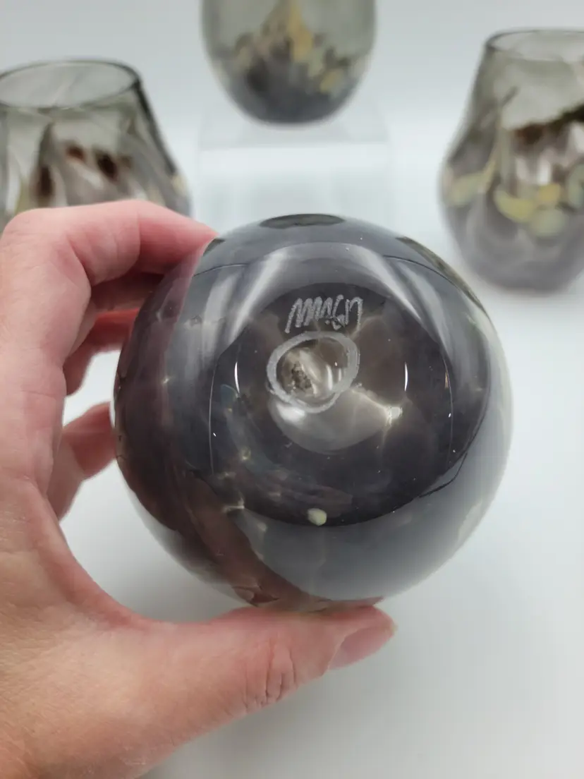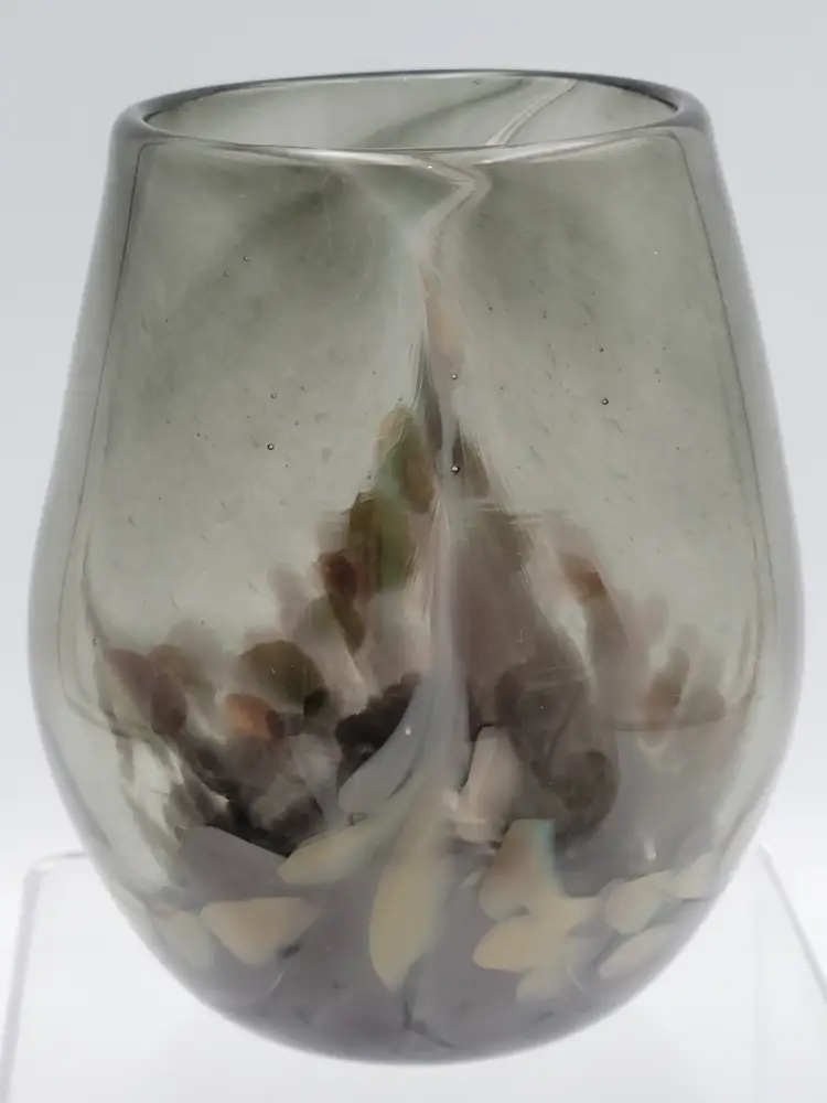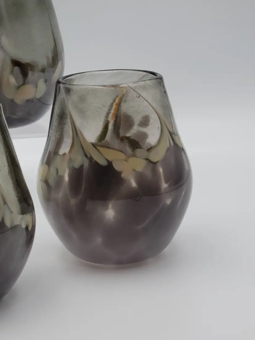 This beautiful set of glasses are a smokey gray glass with lavender bottom and swirls of pastel pink, blue and ivory. They are in excellent condition, no chips, cracks or surface scratches. Measurements vary but are approximately 4.5 inches tall, 3.5 inches at the widest point and have 2.5 inch opening. Thank you for looking and have a great day!
