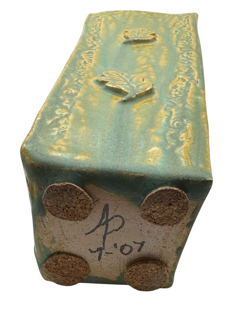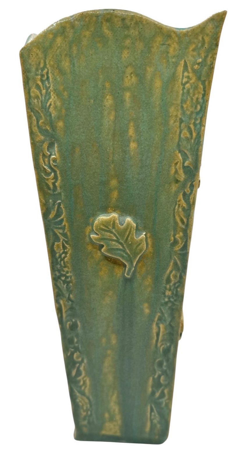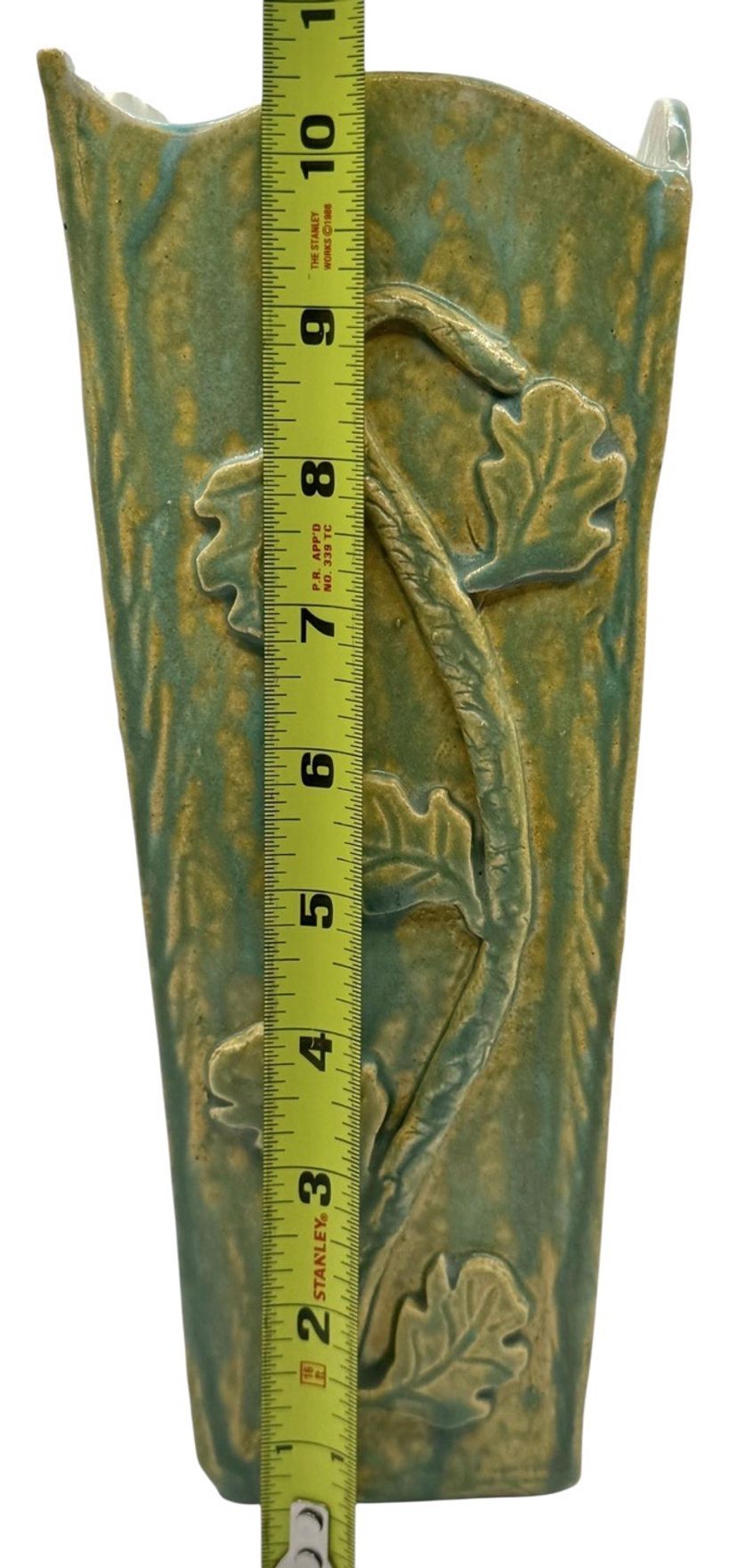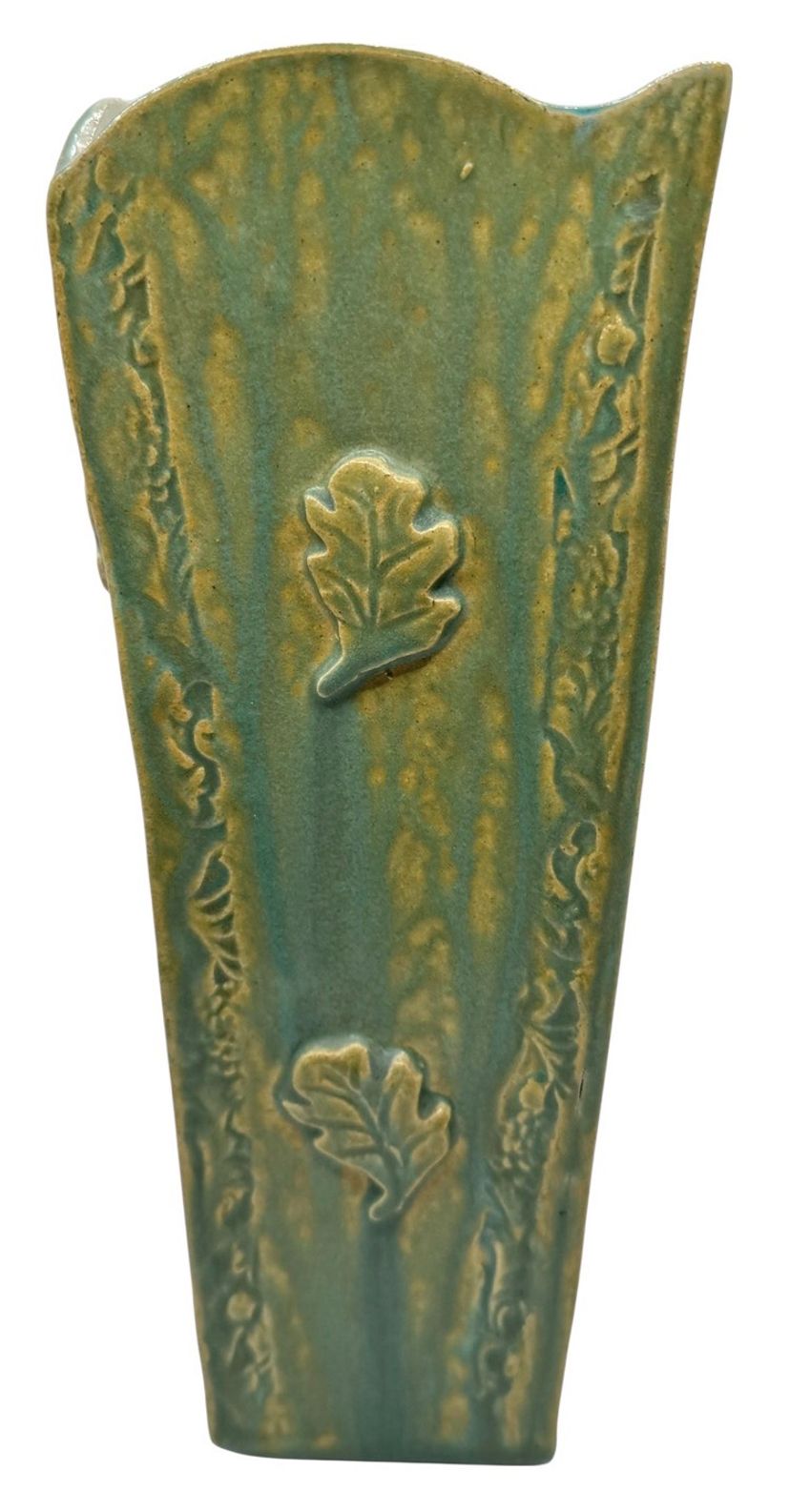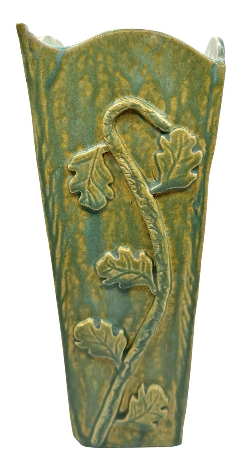 Gorgeous pottery vase with applied oak leaf design, perfect for autumn! Vase is signed but the artist is unknown.