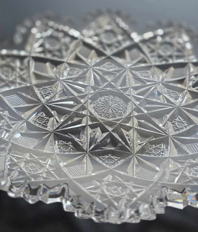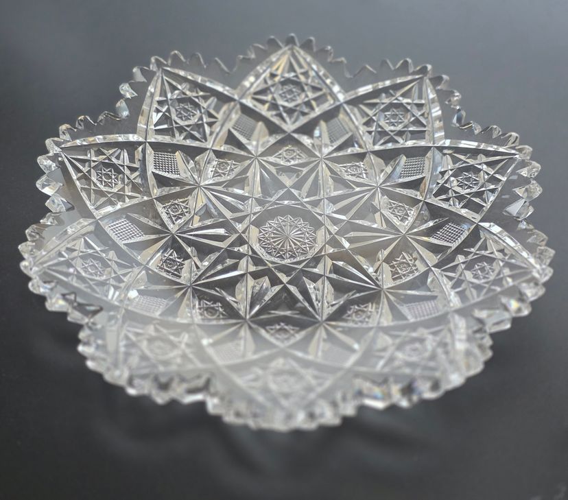 American Brilliant Period Cut Glass Antique dish signed Hawkes. 7" in diameter 1" high. In very good condition no chips cracks or cloudiness.