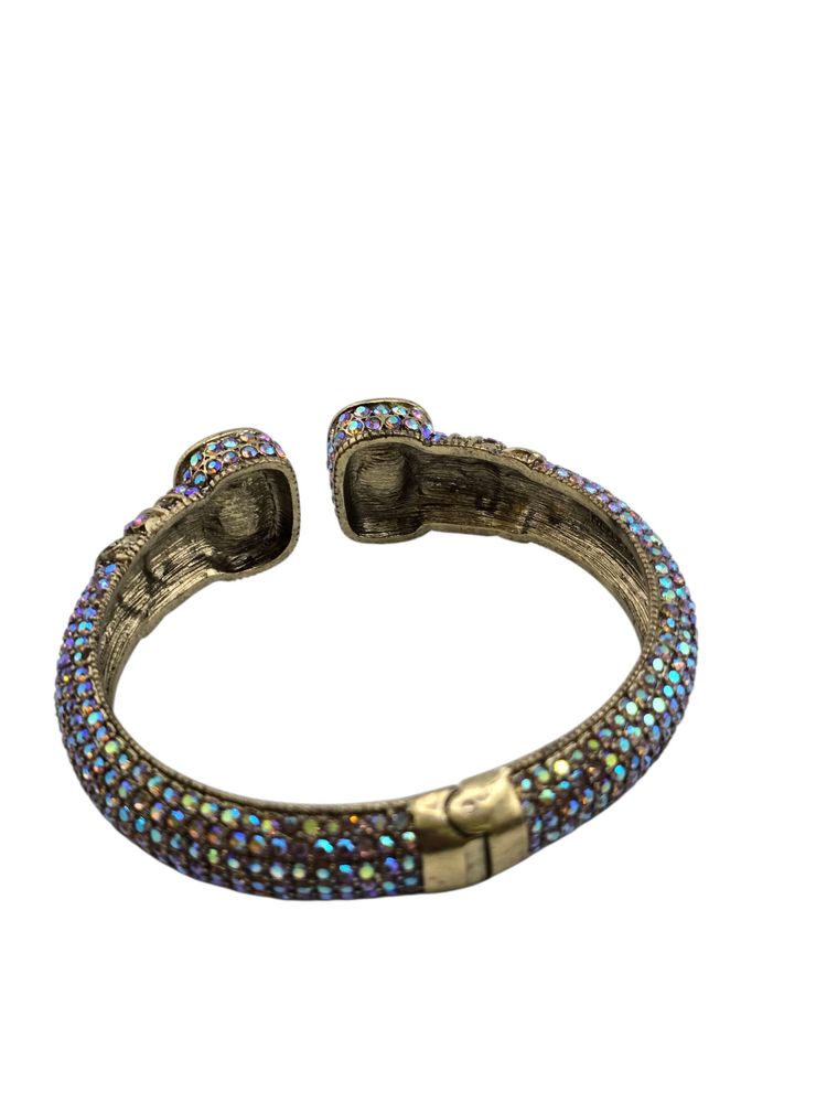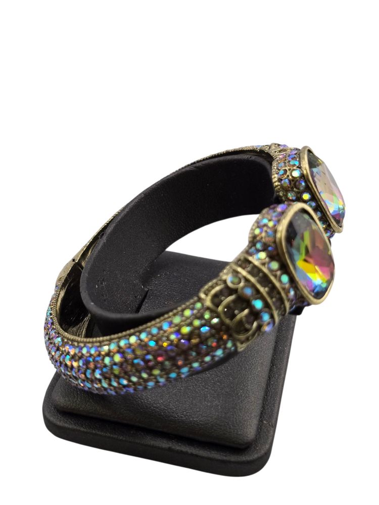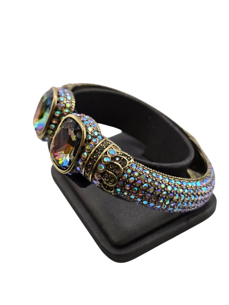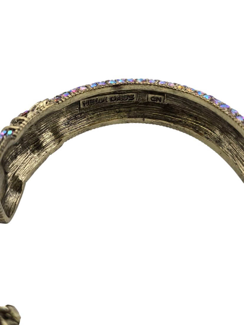 Size: 2.5" Inner diameter Condition: Very good vintage Signed: Heidi Daus CN Details: It features two large watermelon glass stones with vibrant rainbow iridescence. Stunning stones!