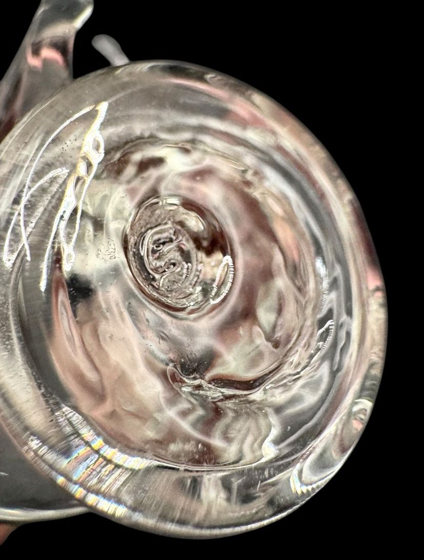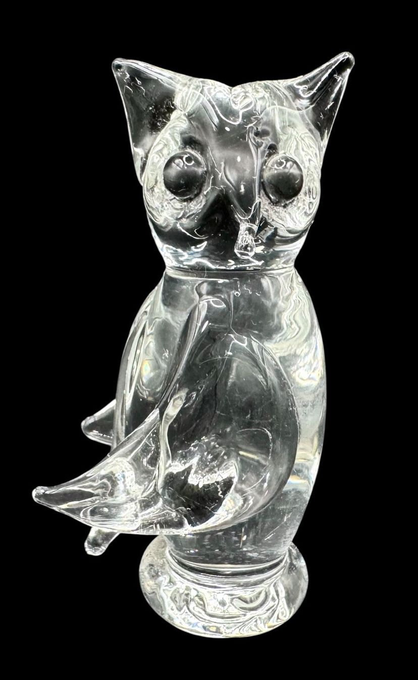 Glass owl figurine stamped with an ‘S’ on the bottom.
