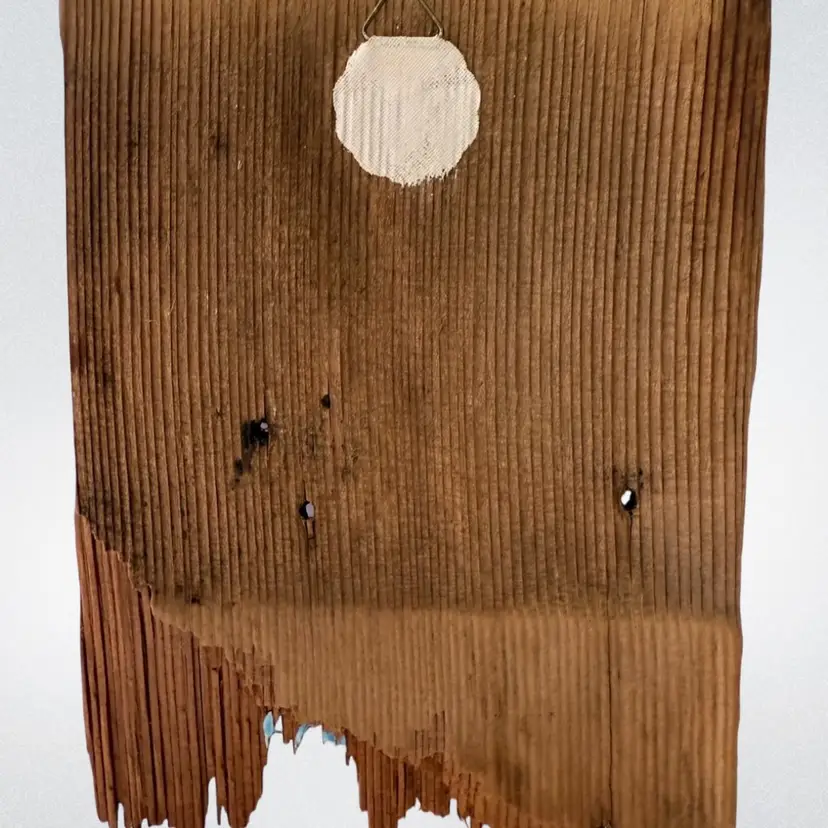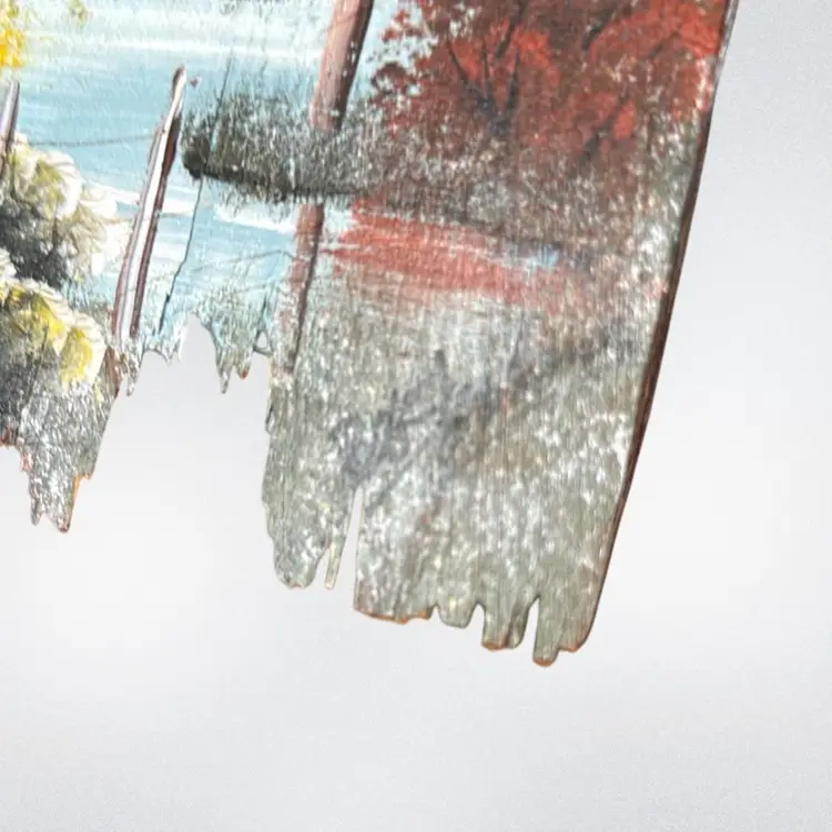 Measures 5.5”x7.5”. Upcycled old wood shingle. Pretty country barn painting. Unable to make out artist signature name. Hanger on back. Rustic.