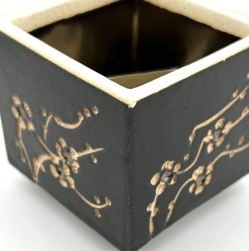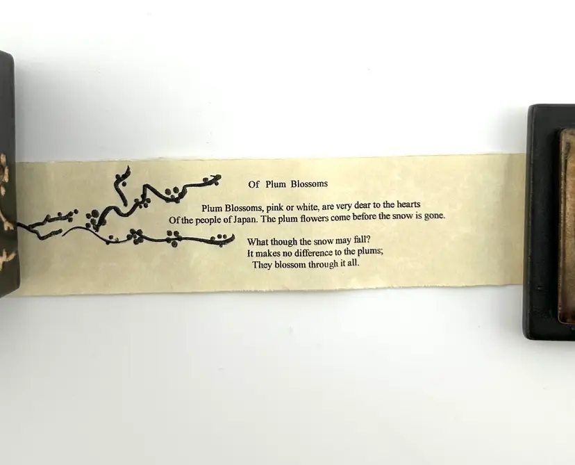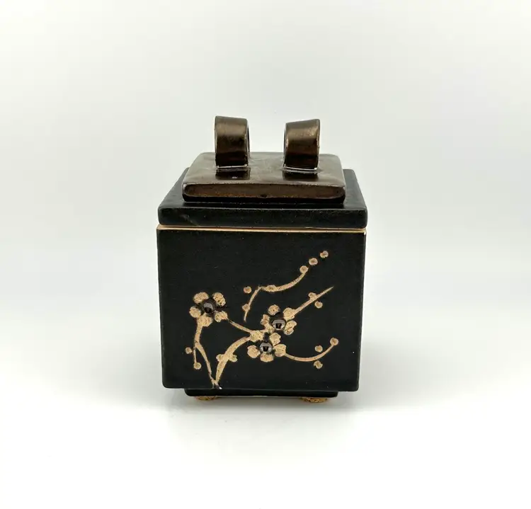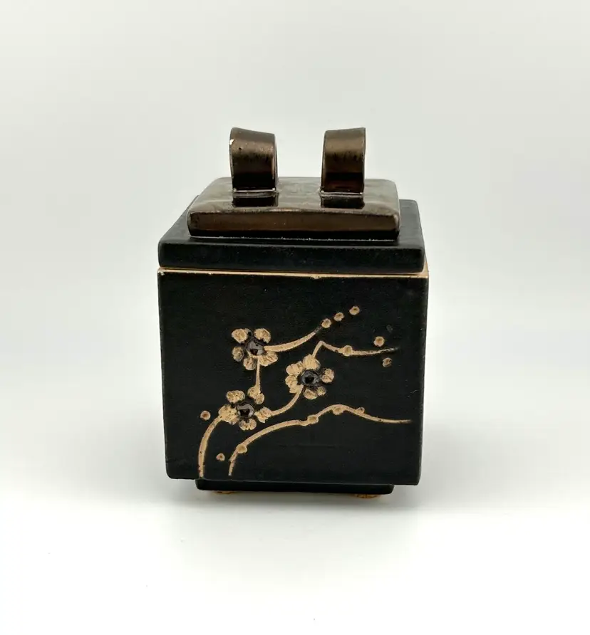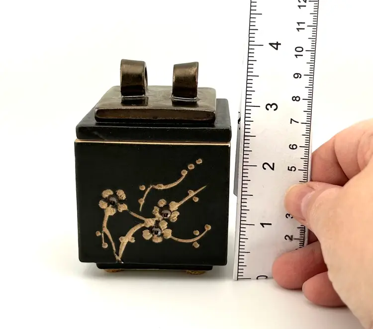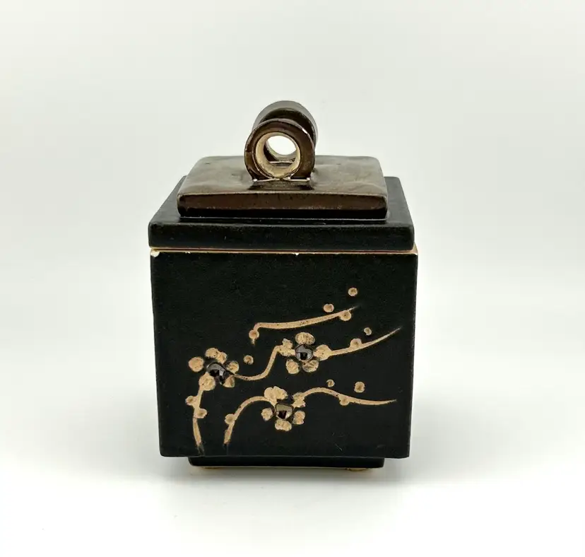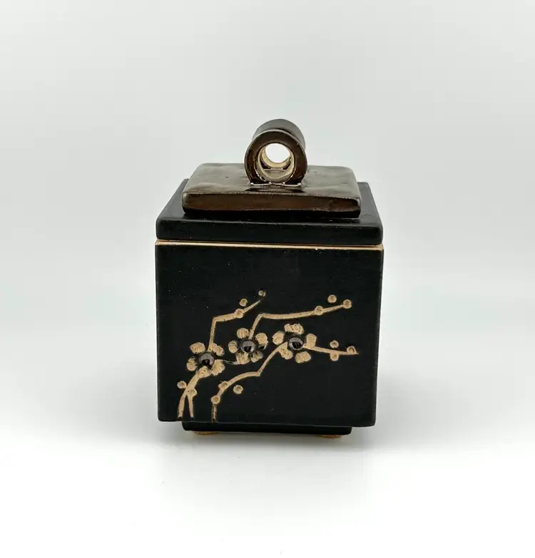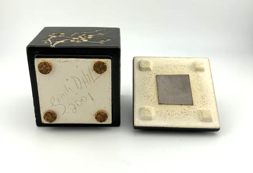 No chips or cracks. Has a few flea bites. Top would have had bamboo or grape wood through the rings. Comes with a poem about Plum blossoms. Sandi Dihl was a famous Santa Cruz ceramic artist. She passed away in 2010. Her work is valuable and rarely available.
