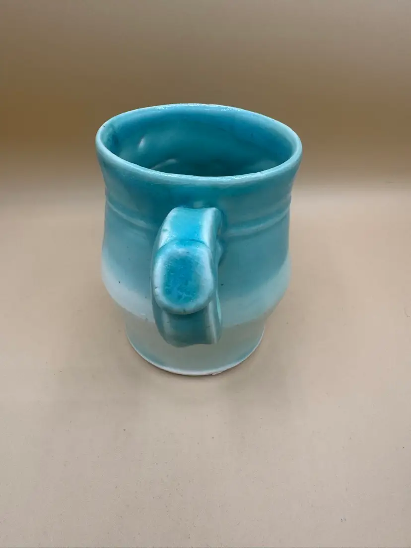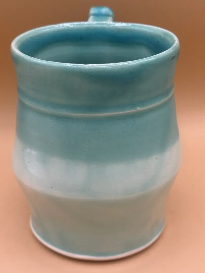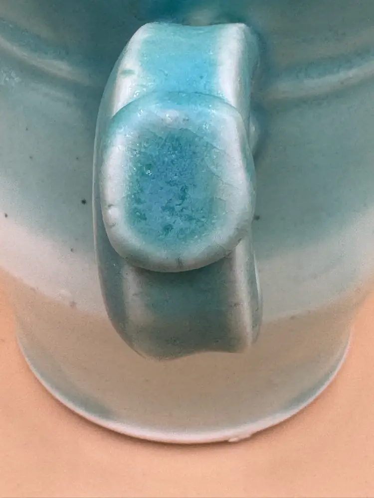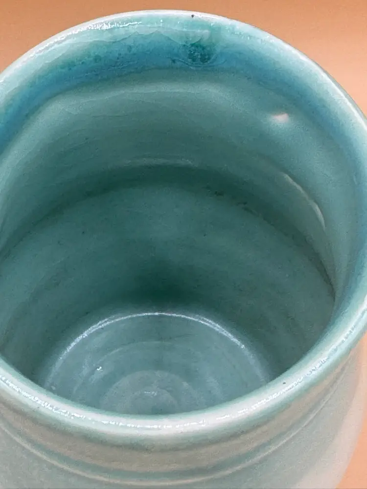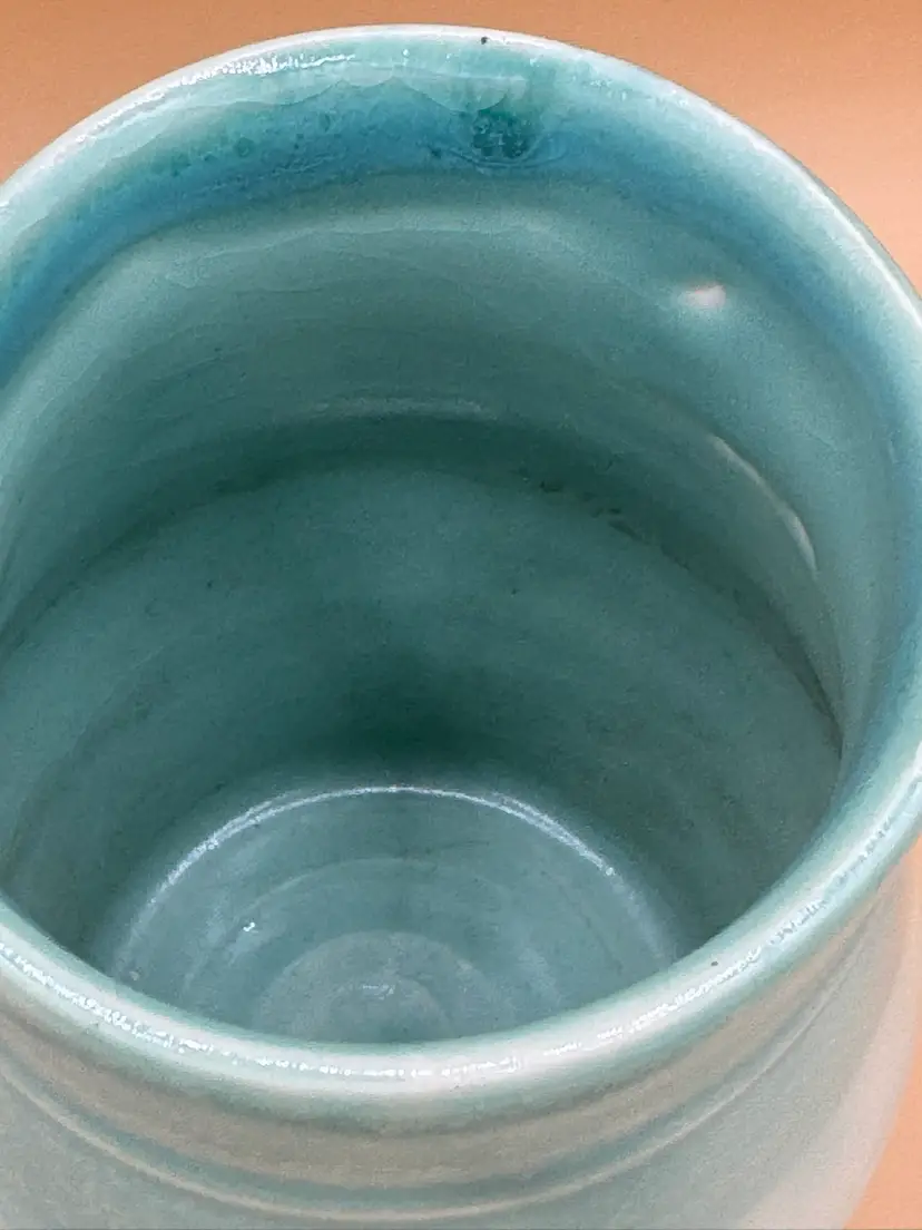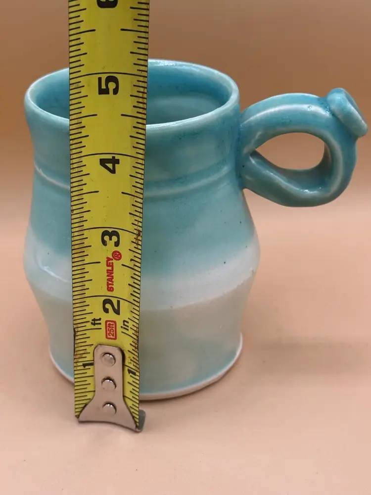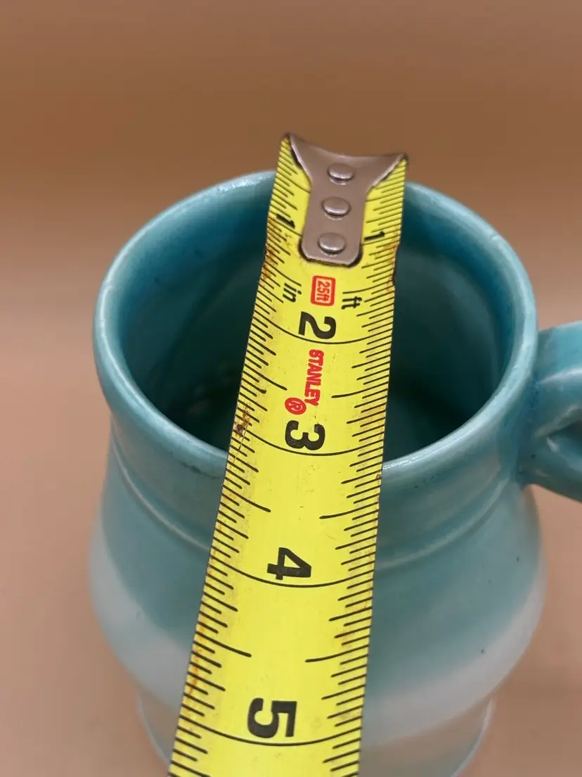 Pretty pottery mug measuring 4 1/2” tall with a diameter of 3 1/4”. Good condition with no chips or cracks.