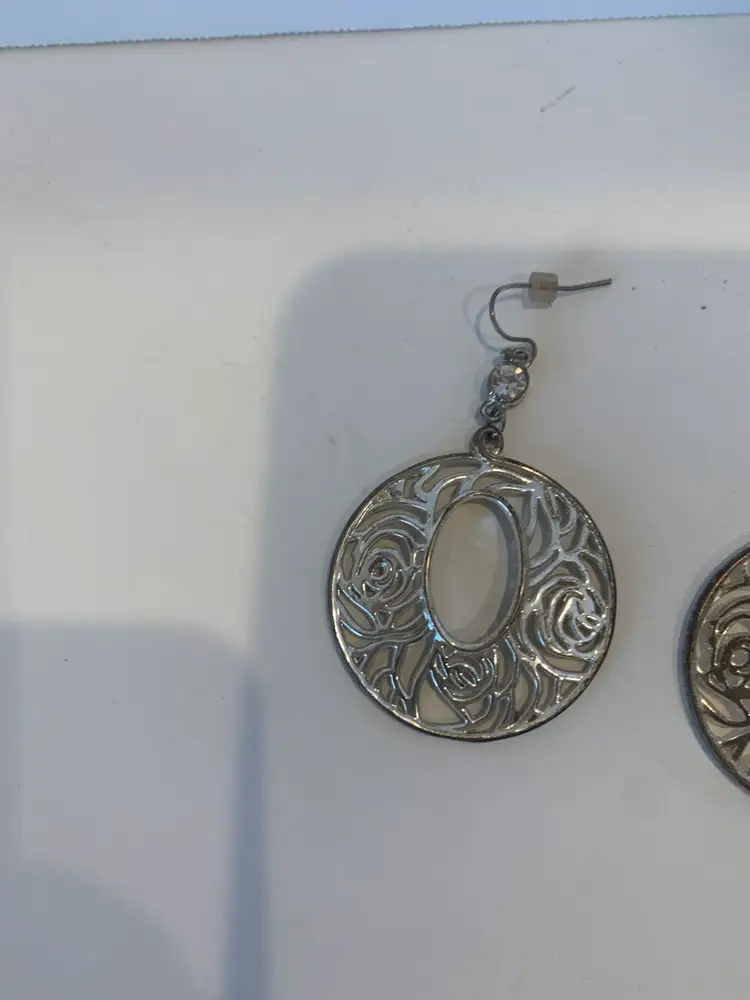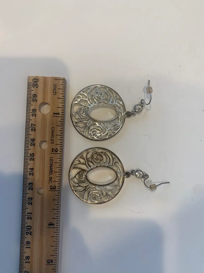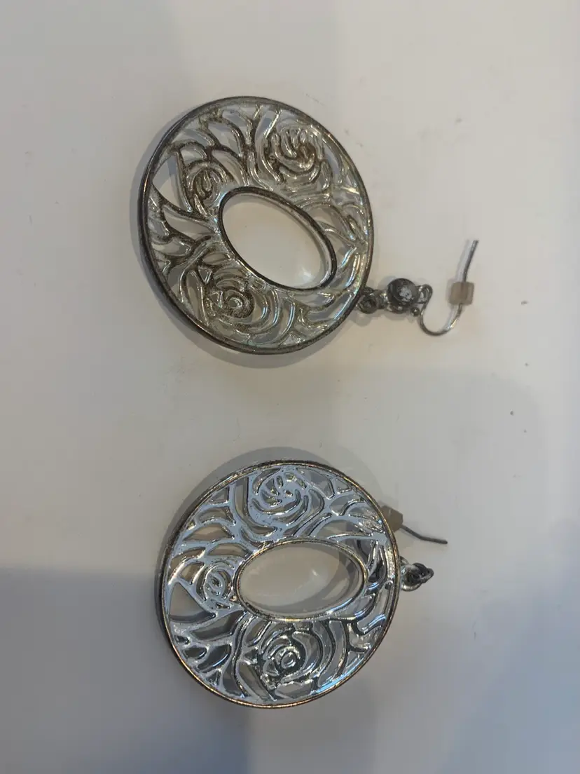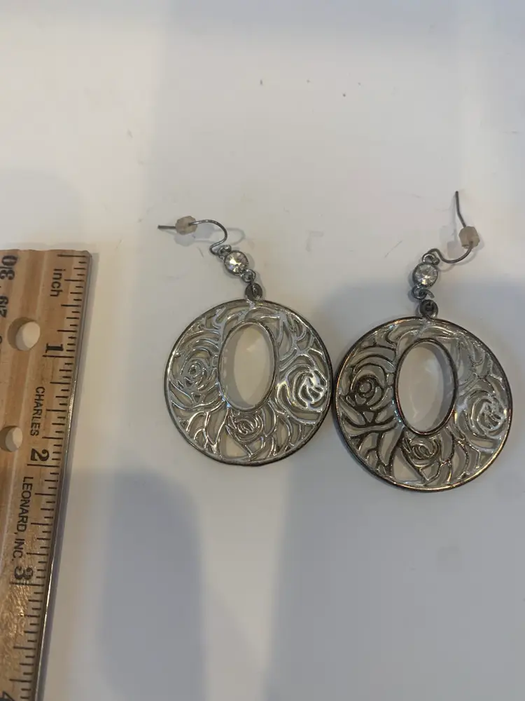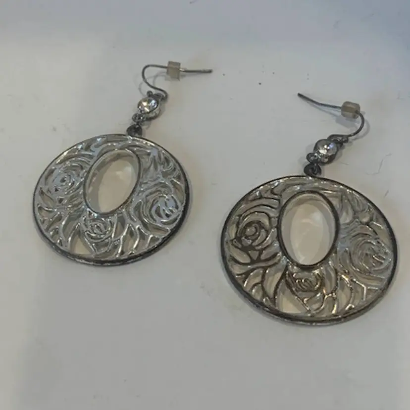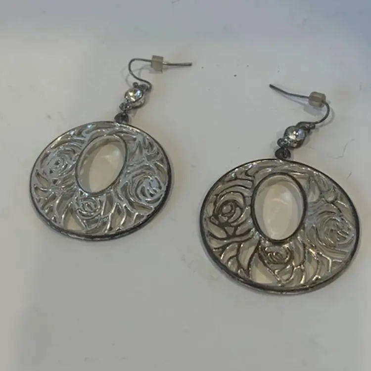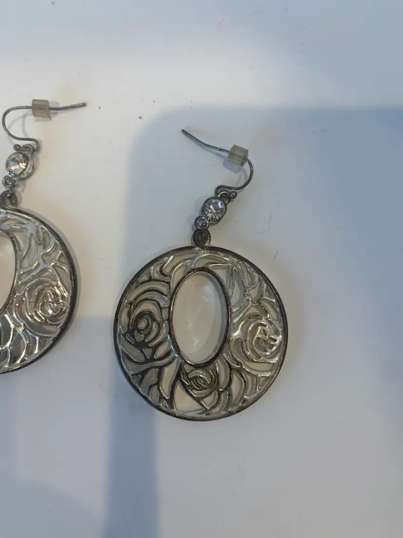 The earrings are a matching pair of drop-style earrings. Each earring features a circular metal disk with an intricate floral pattern, including rose motifs. The metal is silver-toned, with some patina that gives it a slightly antique look. The earrings have hook-style backs with small, clear rubber stoppers for securing them in place.