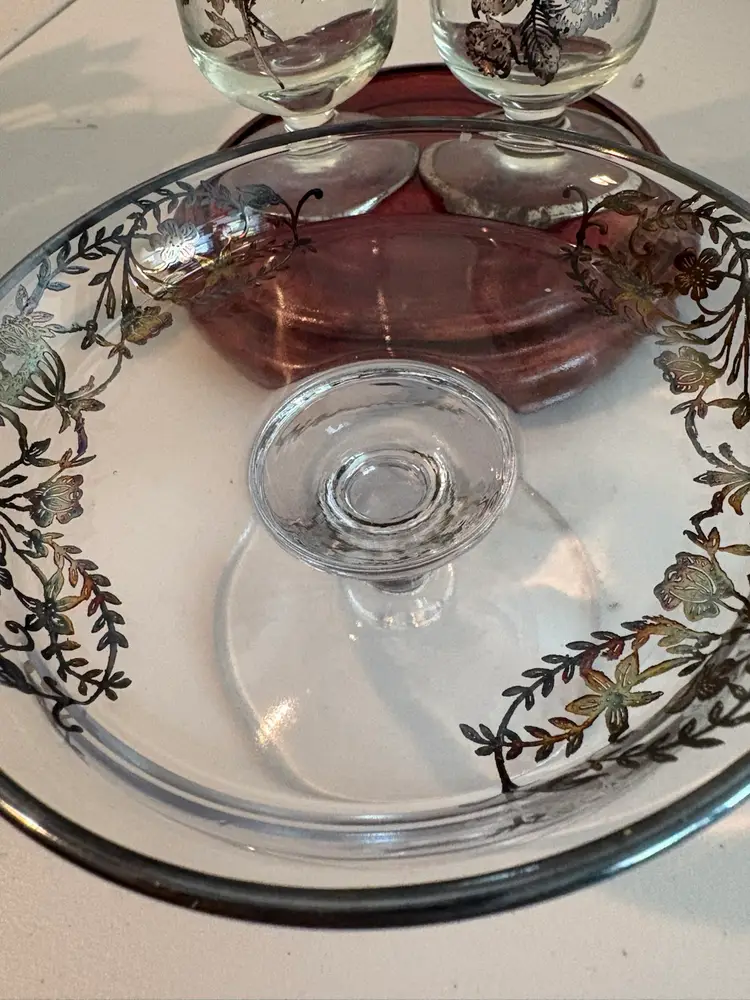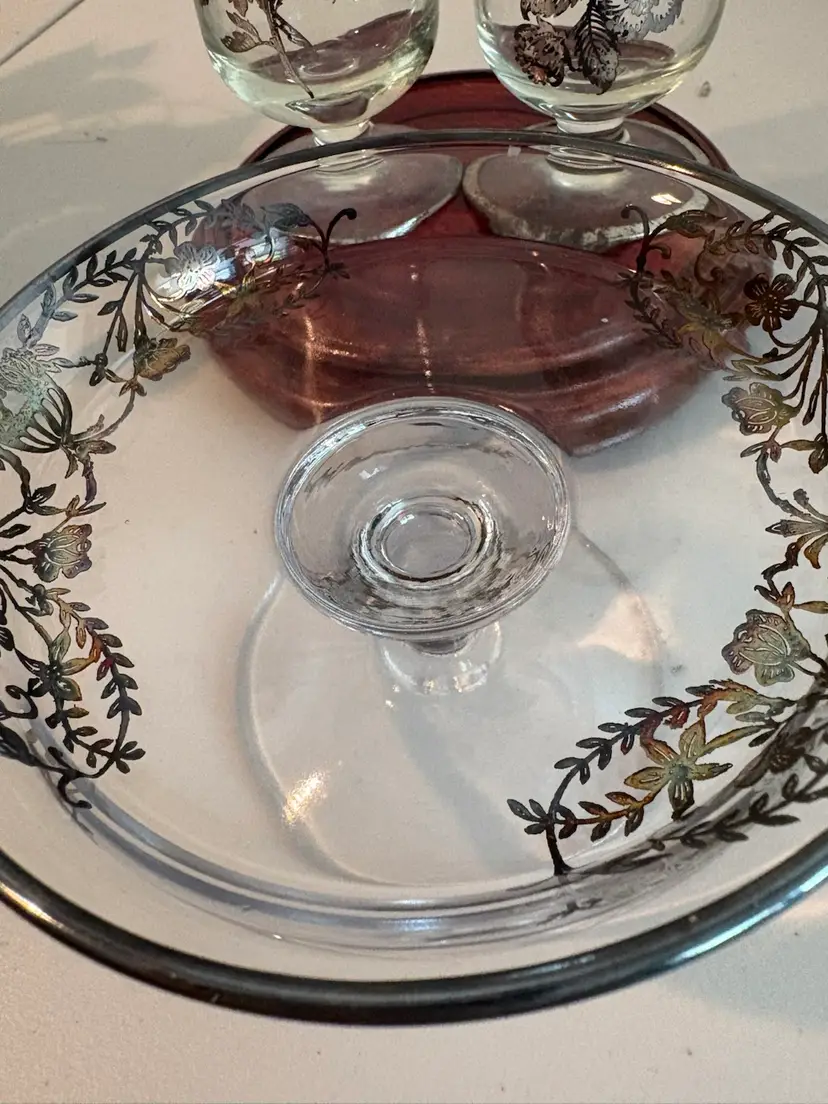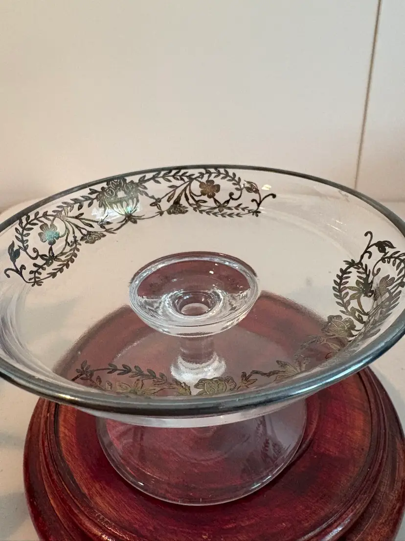 Stylish and graceful, this silver, floral-patterned compote dessert dish also has an attractive silver-edge around both its rim and the bottom of its pedestal. 1930s Sterling Silver. It is 3 1/2" high, 5 1/2” in diameter, and 3 1/4" across its base. The bowl itself is shallow.
