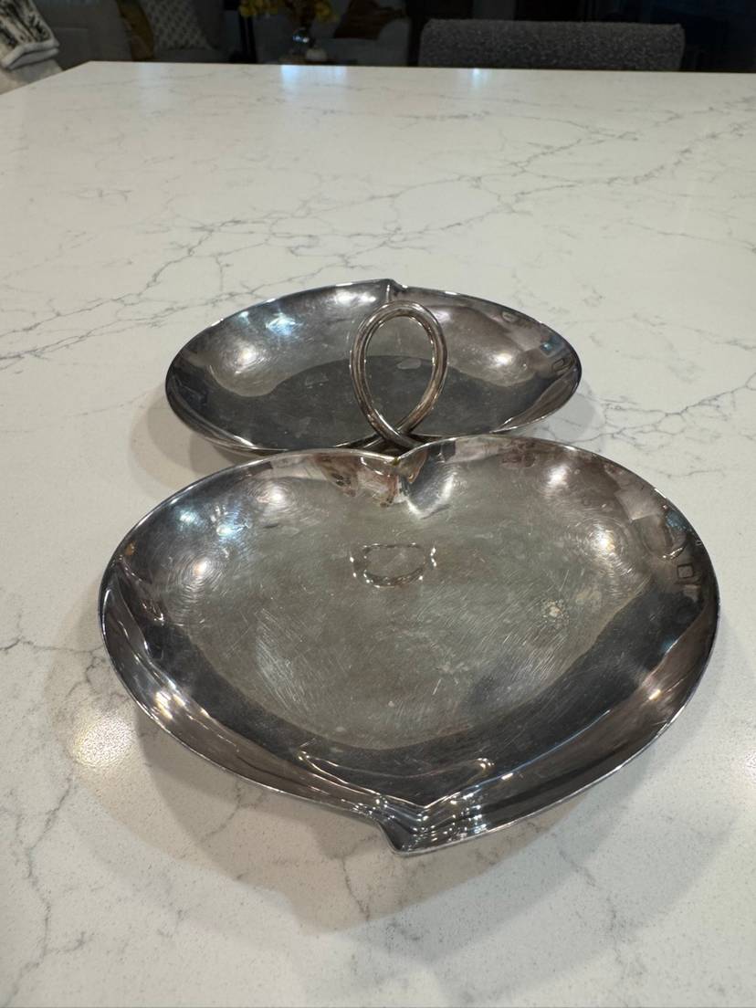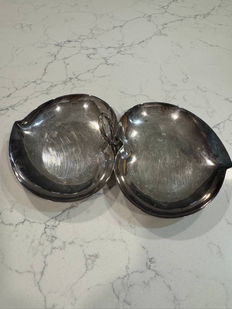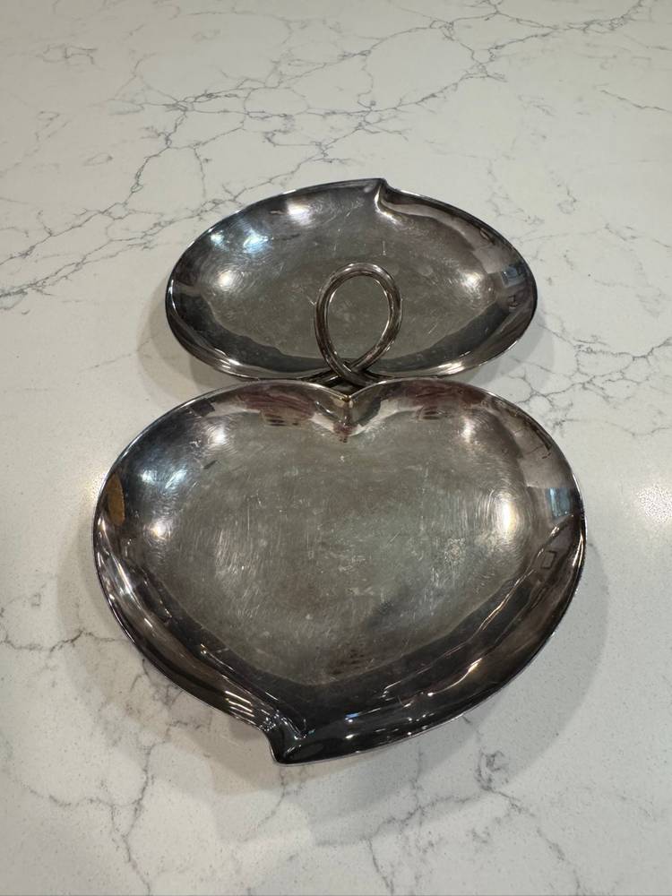 Elegant Two-Tier Silverplate Heart Shaped Handled Candy Nut Dish. This charming piece features two heart-shaped dishes connected by a decorative handle, perfect for serving candies, nuts, or small appetizers. The silverplate construction provides a classic aesthetic making it an ideal addition to any table setting or display. The dish shows some signs of wear consistent with age and use, including minor scratches and tarnishing, which adds to its vintage character. Please note, this item is pre-owned and has not been polished. It's a wonderful collectible for those who appreciate vintage serving ware or heart-themed decor.