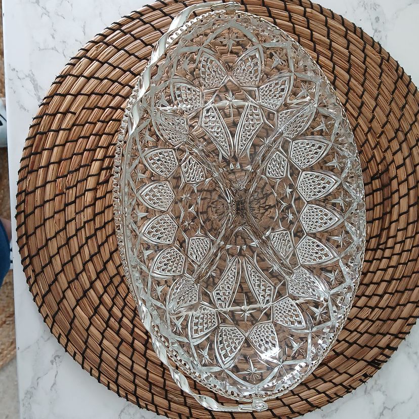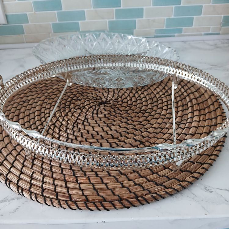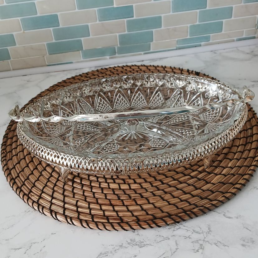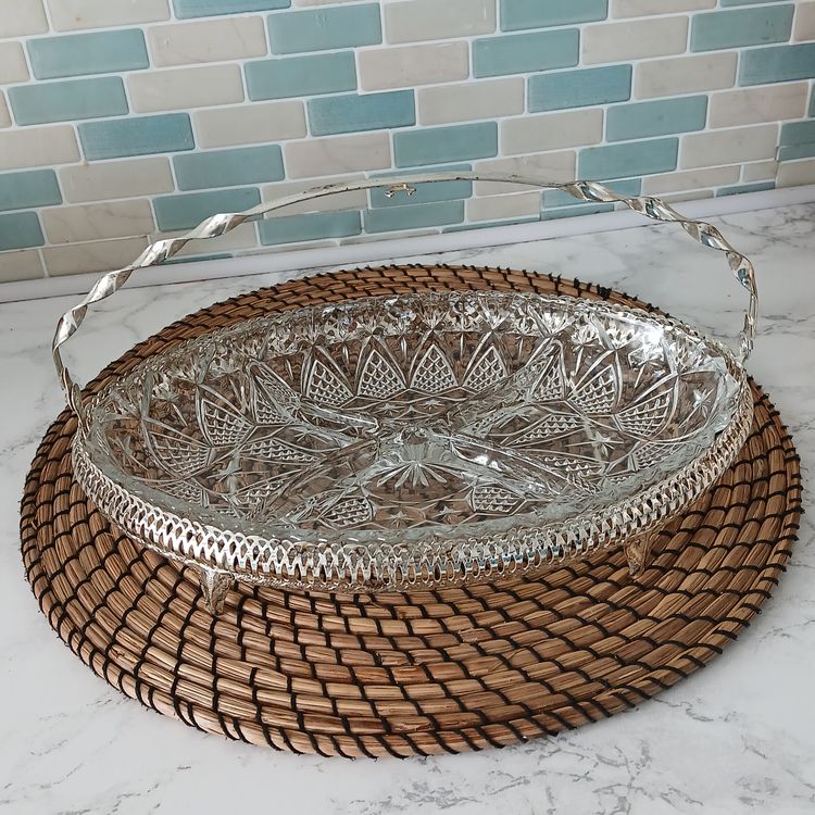 Mayell Queen Anne Silver plated serving stand with cut glass divided insert originating from England. Ideal for serving appetizers or could use on dressing table for jewelry.