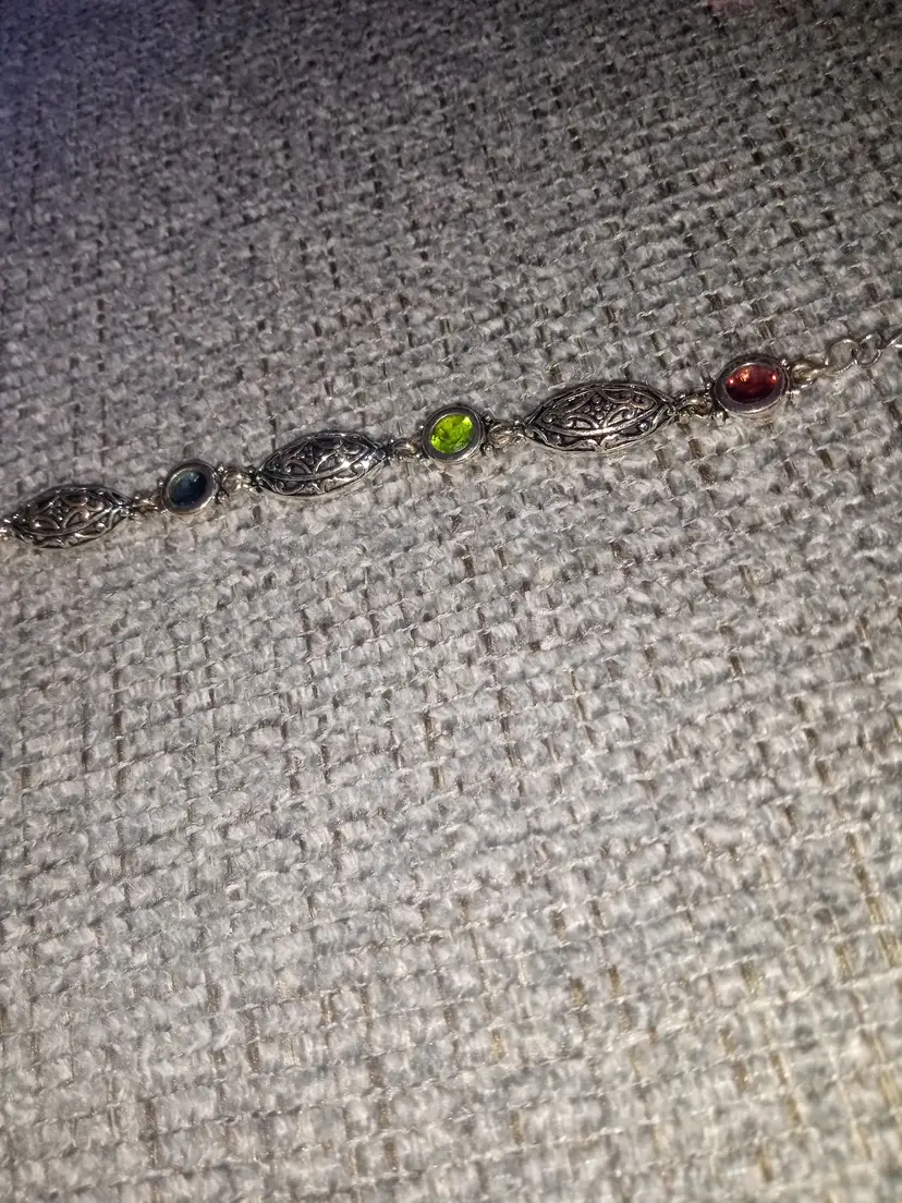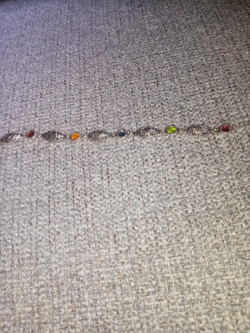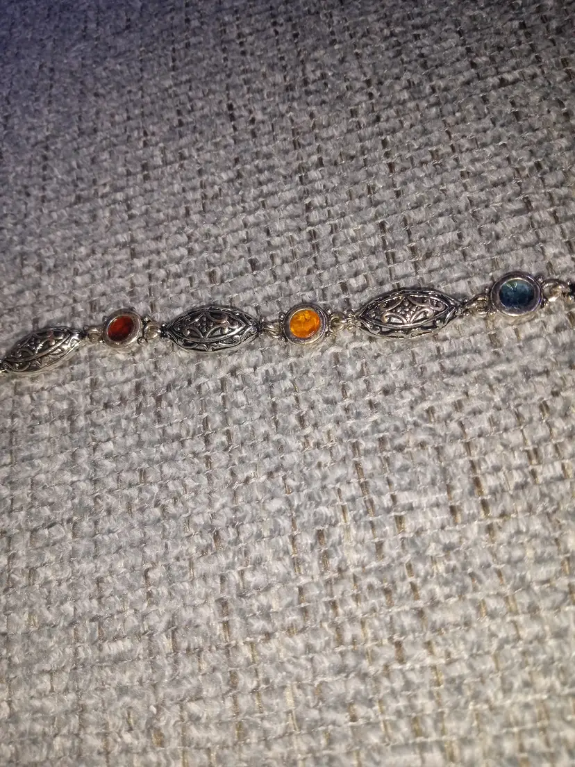 Vintage silvertone colorful gem style filagree bracelet scroll work on links multi color stones antique finish