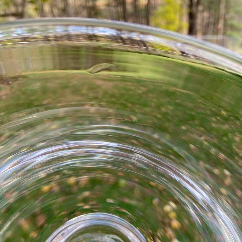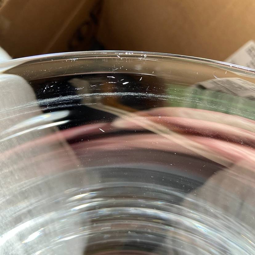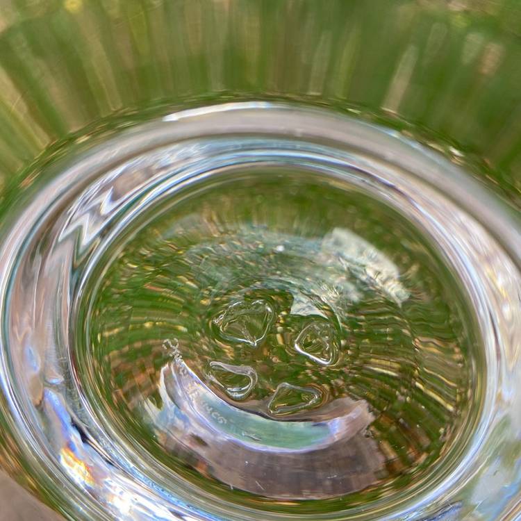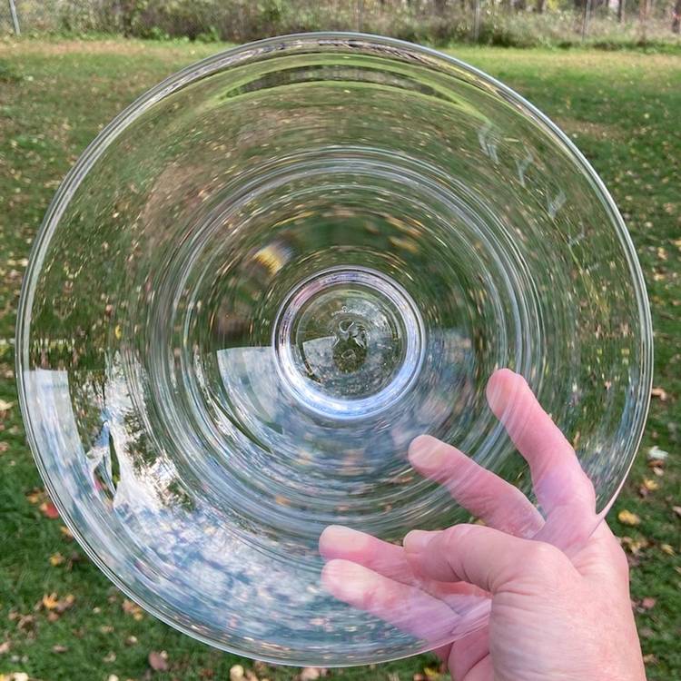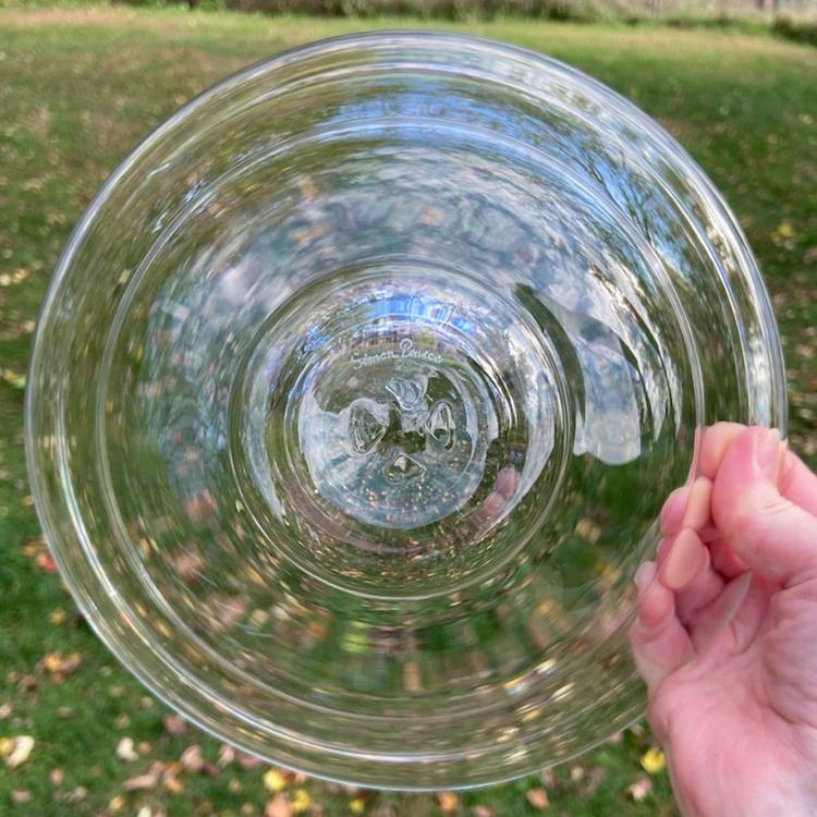 Approx: 9.25”w x 4”h, base is 2.75”w. Pre-owned condition. No chips or cracks. See images for some manufacturing inclusions in the glass and scratches.