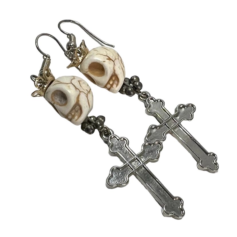 Handmade by me π. Bone-colored skull bead adorned with salvaged Silver-Colored Crosses. A golden crown fit for a Queen tops her skull. Silver-colored french hooks.